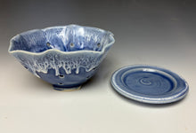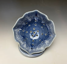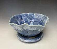The berry bowl was hand made on the potters wheel from stoneware clay and holes cut while it was still wet to allow for air to flow through the contents. After the initial bisque firing, it was glazed in a deep purple (amethyst) glaze which has white cascading down the sides of the bowl.