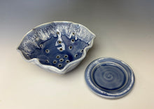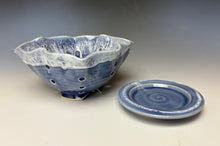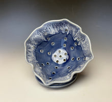 The berry bowl was hand made on the potters wheel from stoneware clay and holes cut while it was still wet to allow for air to flow through the contents. After the initial bisque firing, it was glazed in a deep purple (amethyst) glaze which has white cascading down the sides of the bowl.