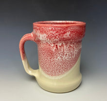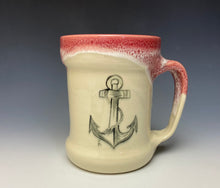 This mug was handmade on the potter's wheel by Lindsey from stoneware clay into the new stein shape. An anchor was hand-painted on the mug while the clay was in a "leather hard" stage. After the initial bisque firing it was glaze fired with red and white on the inside and flowing over the outside of the mug. The rest of the mug is a creamy buff color to highlight the design.