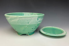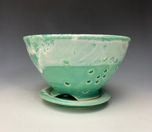 The bowl was hand made on the potters wheel from stoneware clay and the holes cut out in a swirl pattern while the clay was leather hard. After the initial bisque firing, it was glazed in a seafoam green glaze.