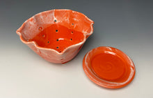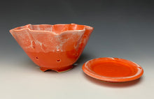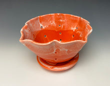 The bowl was glazed in an intense orange glaze which has white cascading over the rim of the piece. This is a BRIGHT ORANGE- the images show a little bit of a blue cast, but the piece is orange! (Think safety cones!)