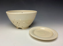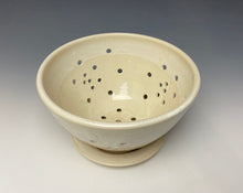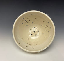 The berry bowl was hand made on the potters wheel from stoneware clay and holes cut while it was still wet to allow for air to flow through the contents. After the initial bisque firing, it was glazed in my ivory glaze which has white cascading down the sides of the bowl.