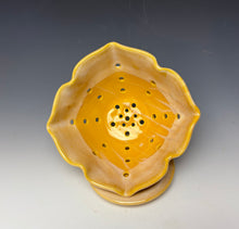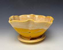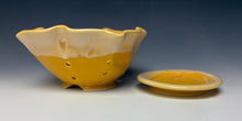 The bowl was glazed in a bright yellow glaze which has white cascading over the rim of the piece. The piece is microwave and dishwasher safe (if you wanted to use it that way). This bowl will hold 2+ pints (maybe more!) of berries or fruits. Comes with pictured plate.