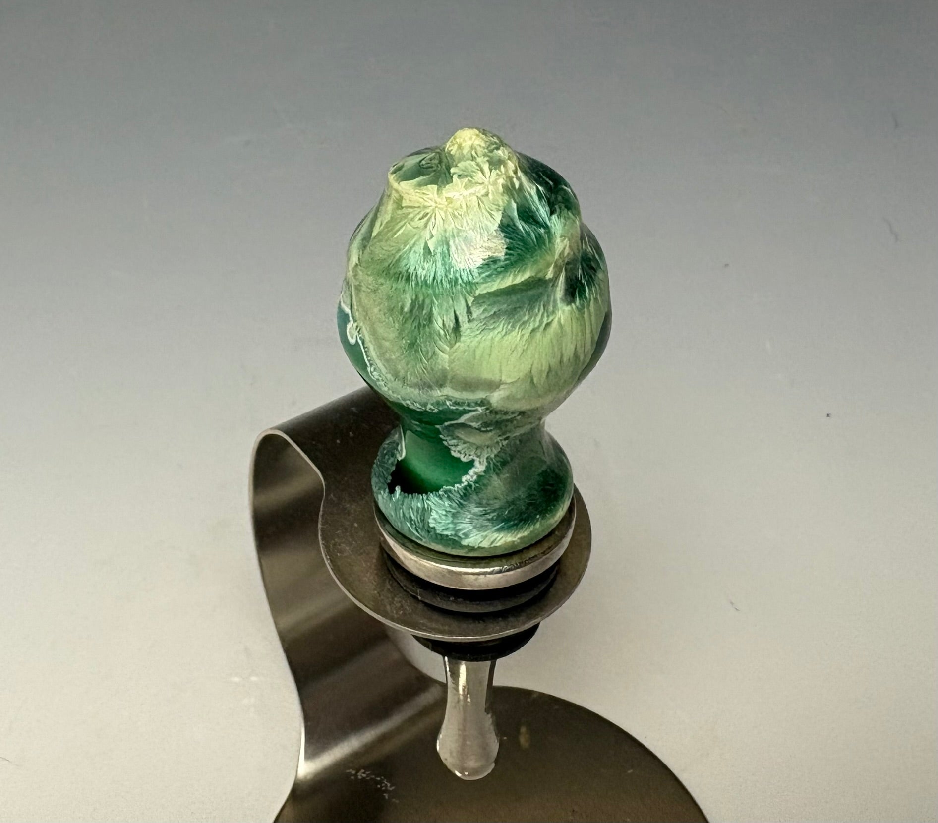 This piece was handmade on the potter's wheel by Lindsey from porcelain clay. It is glazed with my light green crystalline glaze with light green colored crystals on an light green background that gives a multitude of depth and dimension to this piece. The base is made from high quality, food grade stainless steel.