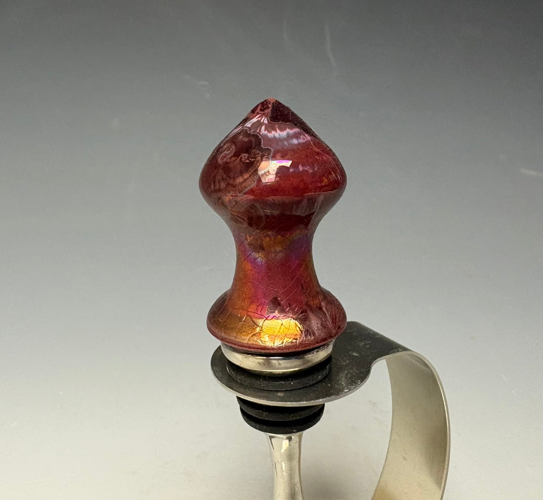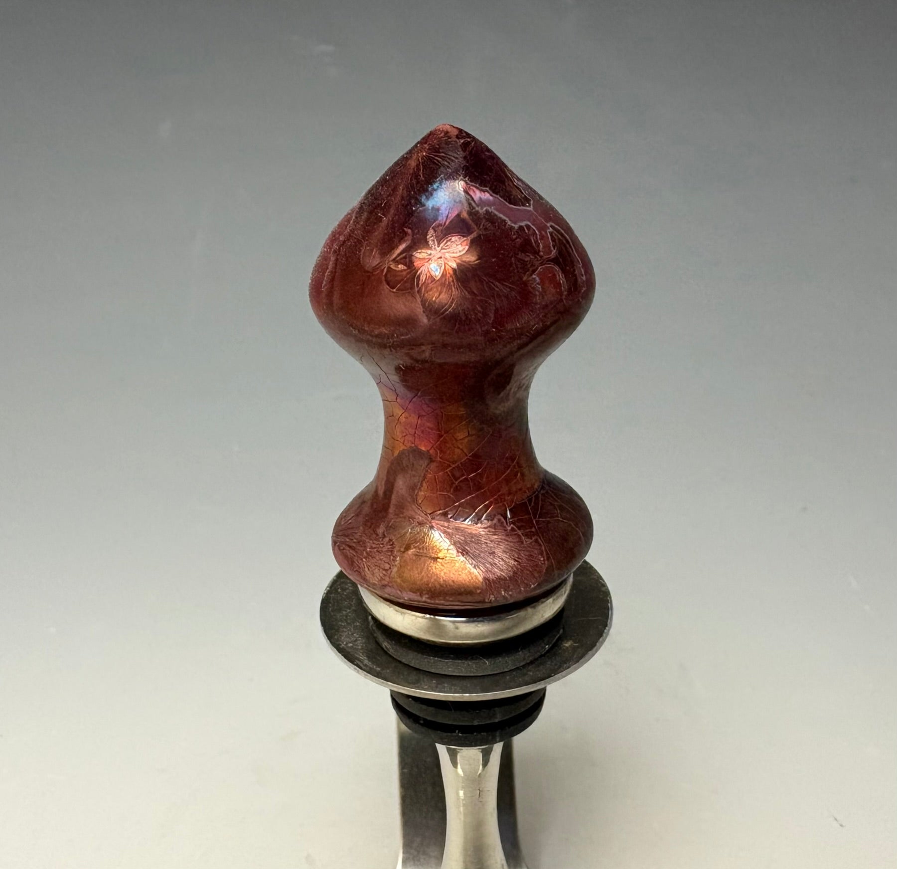 This piece was handmade on the potter's wheel by Lindsey from porcelain clay. It is glazed with my 'Ruby' crystalline glaze with copper red crystals on a blue, red, and purpleish background that gives a multitude of depth and dimension to this piece. The base is made from high quality, food grade stainless steel.