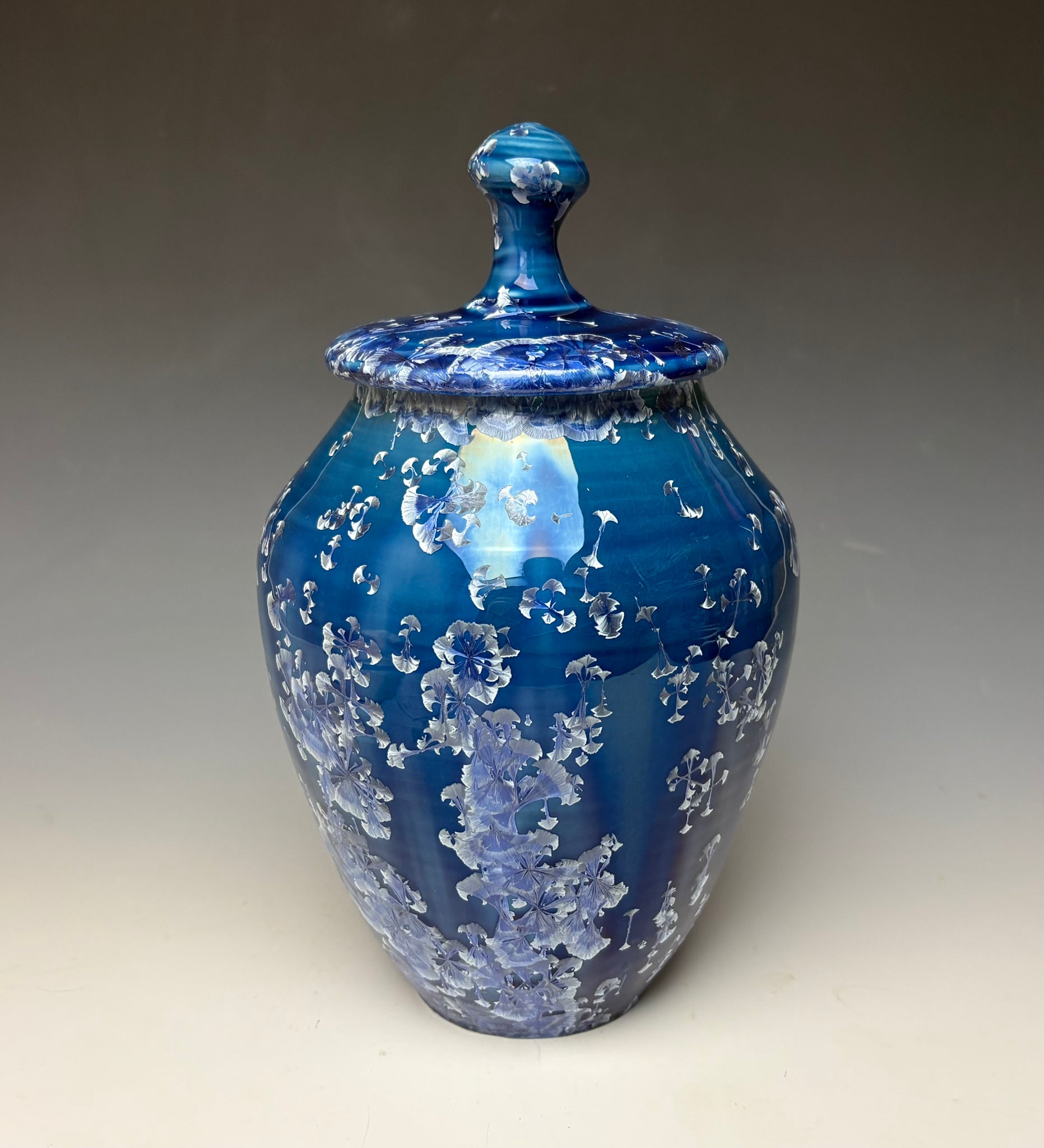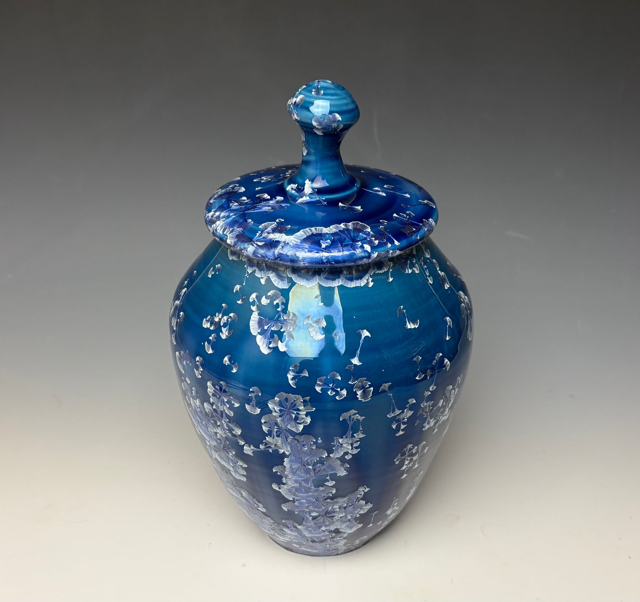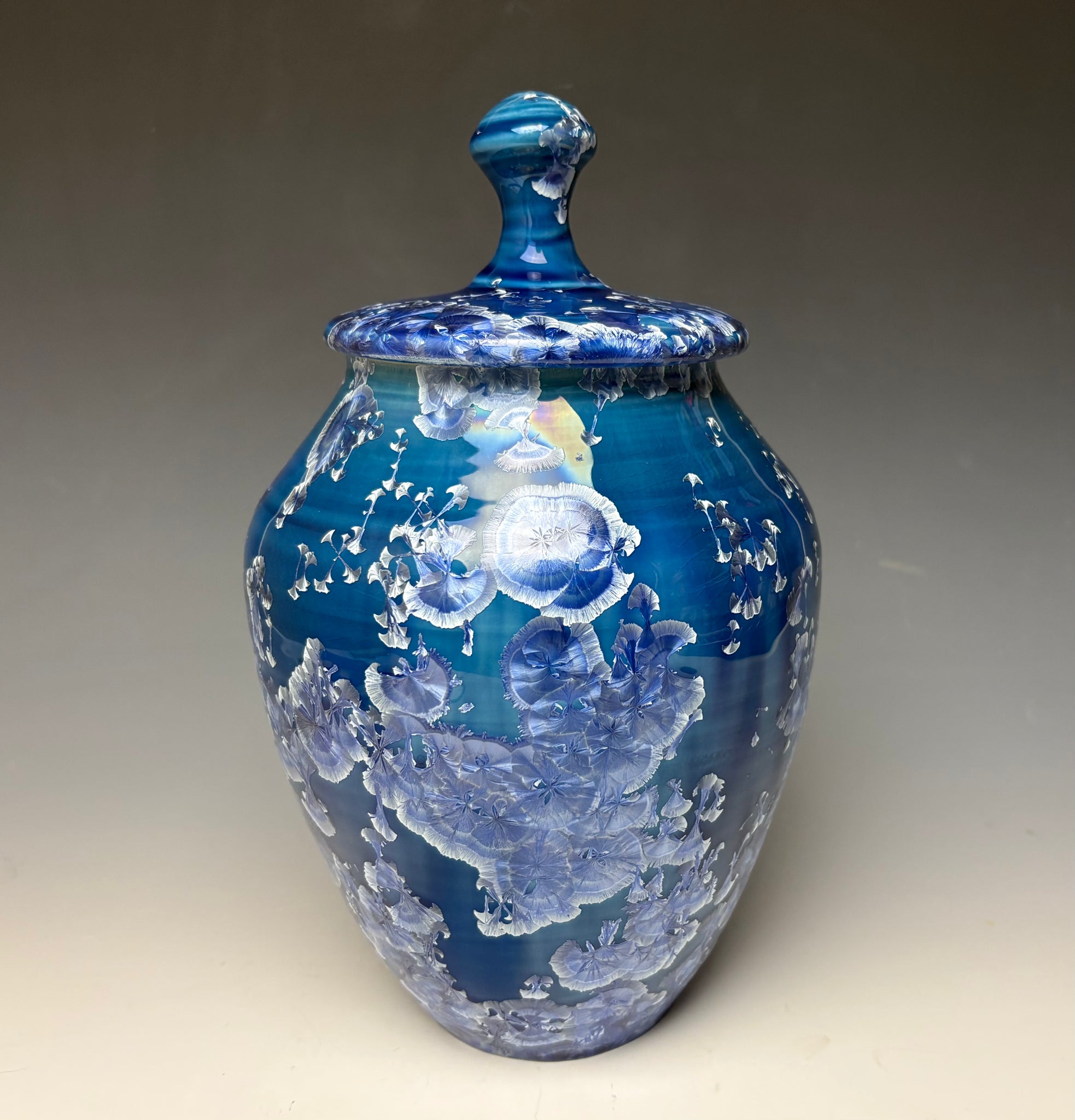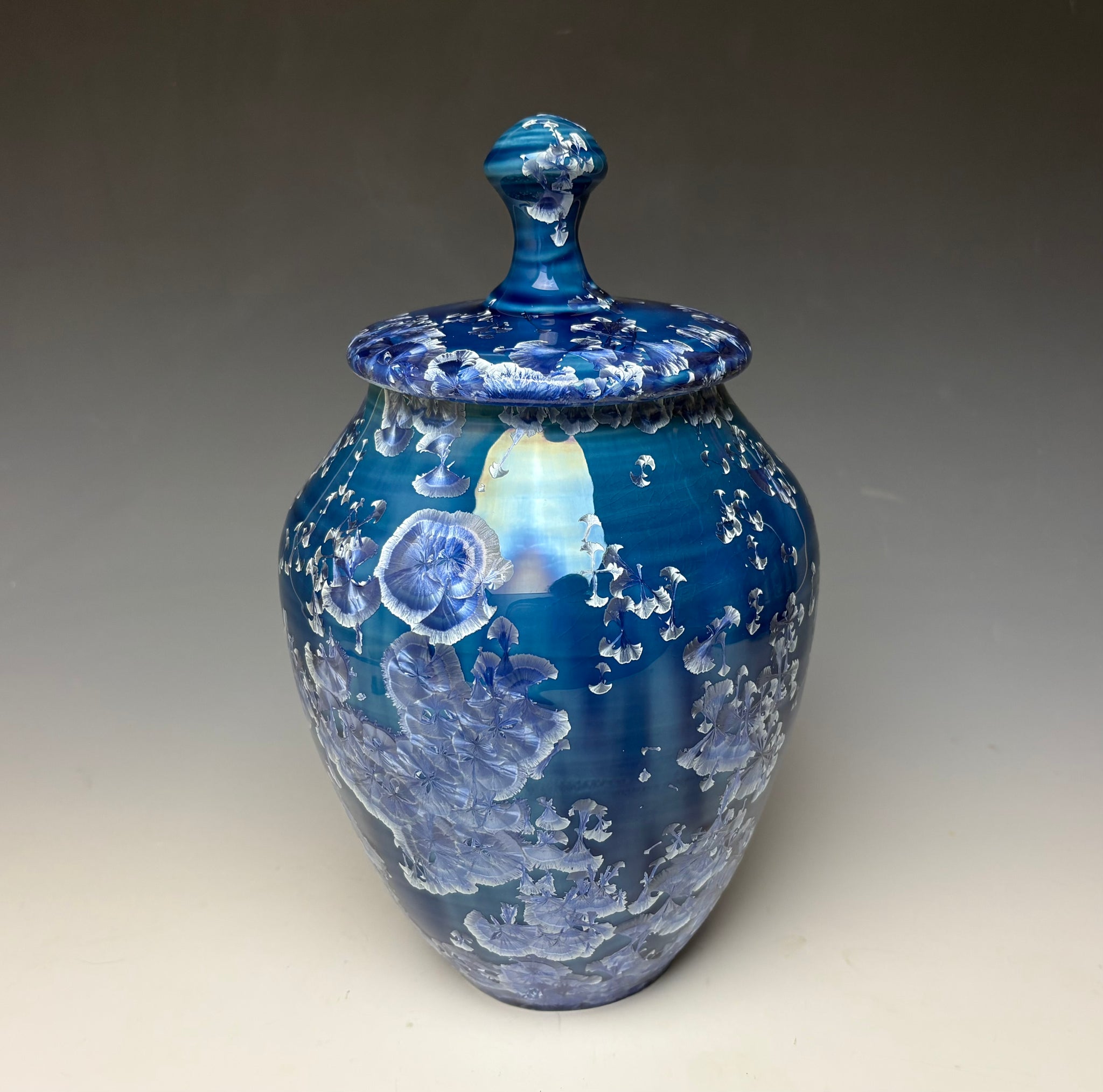 This jar was hand-made from porcelain clay on the potter's wheel. Due to the unique nature of crystalline glazes, no two pieces are ever alike. The zinc crystals are actually grown during the firing and cooling process. The time and temperature must be accurate in order to achieve crystal growth on the piece.