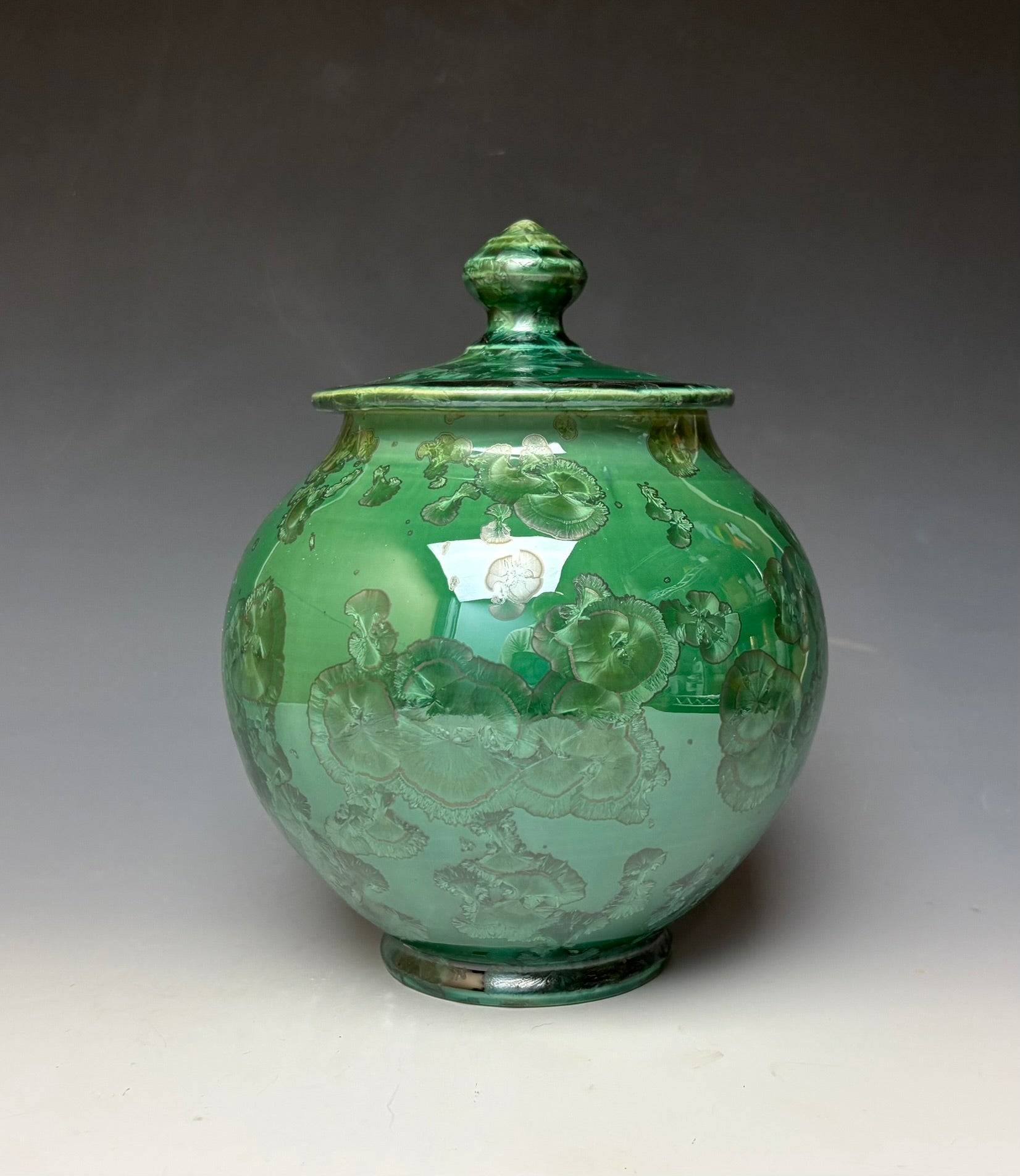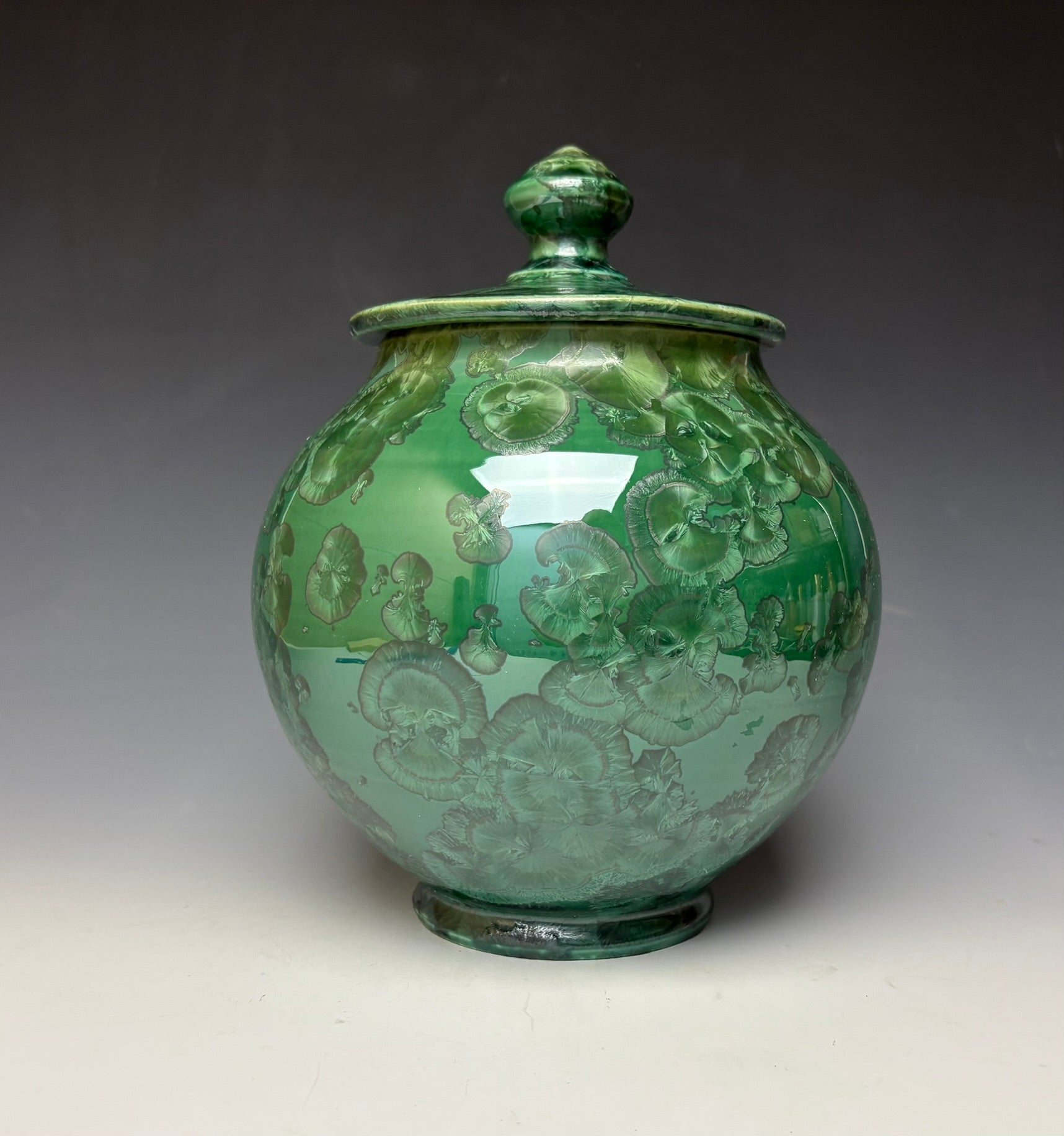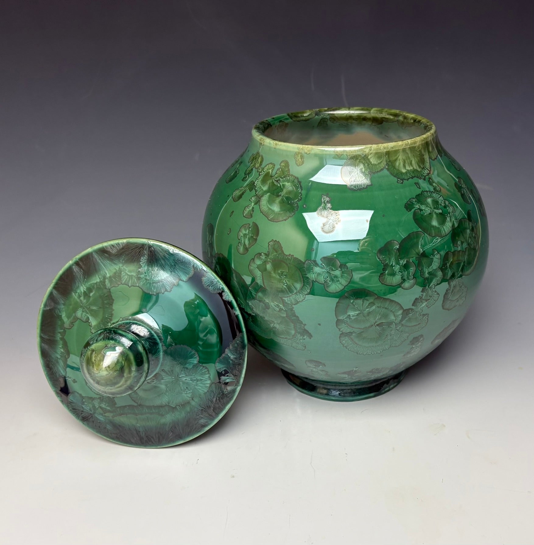 This jar was hand-made from porcelain clay on the potter's wheel. Due to the unique nature of crystalline glazes, no two pieces are ever alike. The zinc crystals are actually grown during the firing and cooling process. The time and temperature must be accurate in order to achieve crystal growth on the piece.