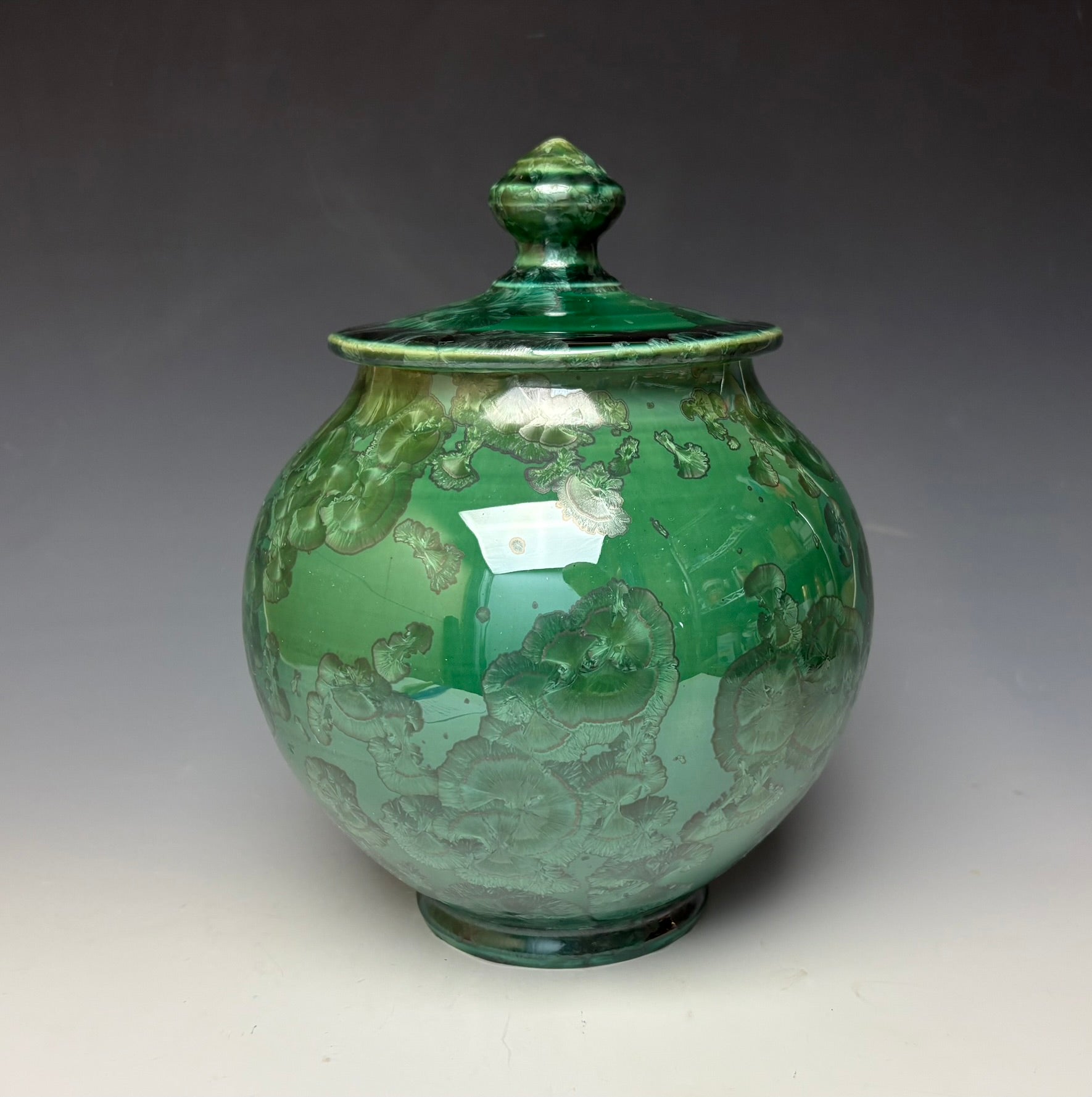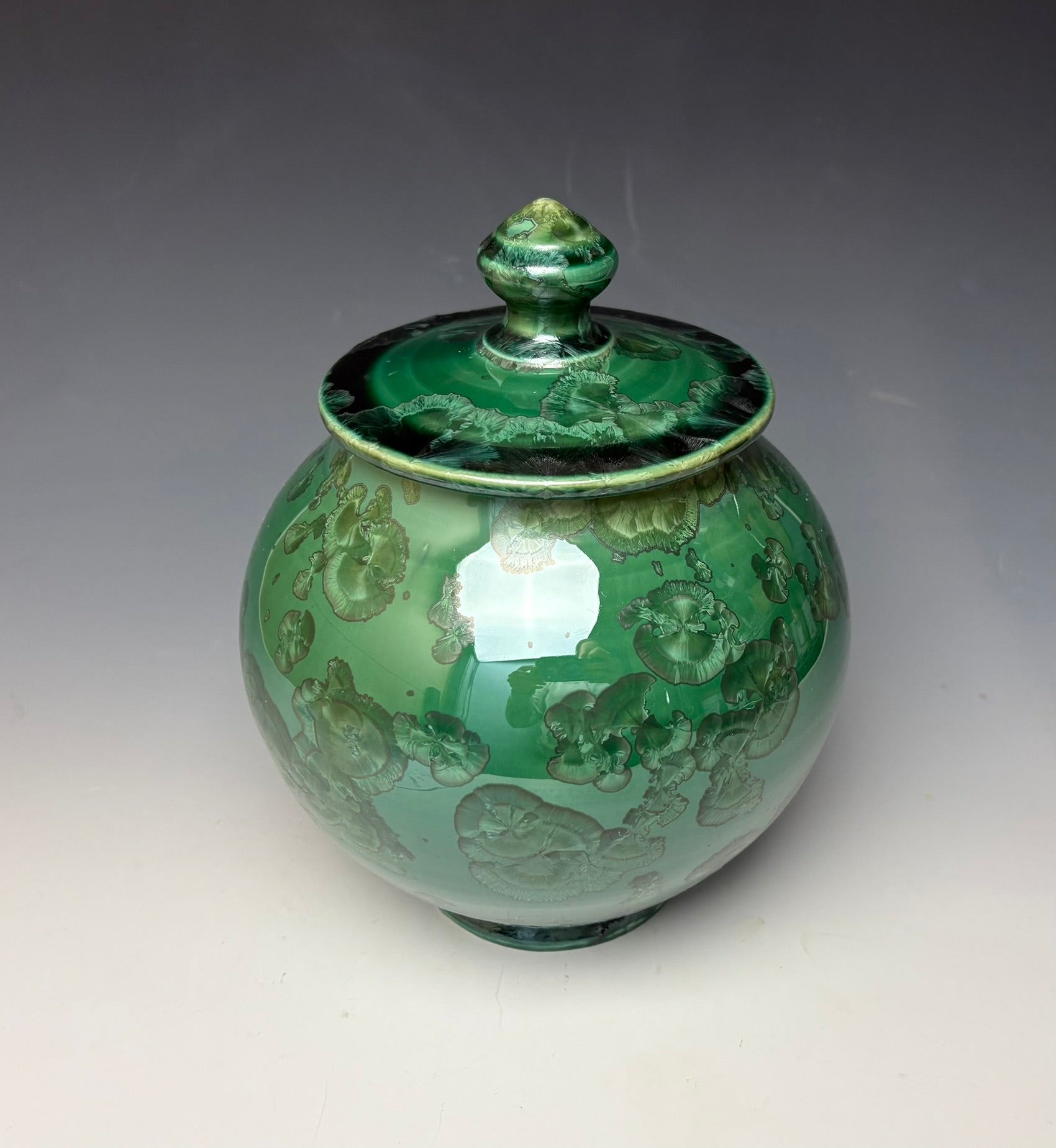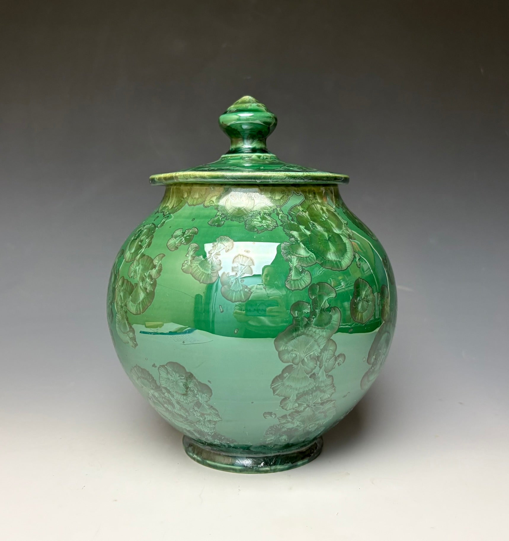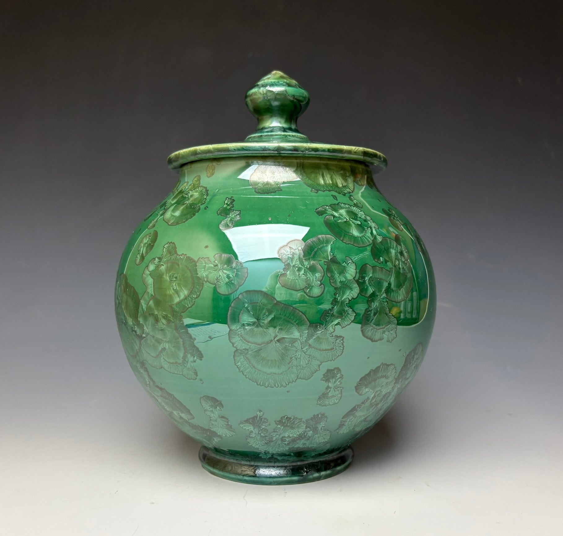 This jar was hand-made from porcelain clay on the potter's wheel. Due to the unique nature of crystalline glazes, no two pieces are ever alike. The zinc crystals are actually grown during the firing and cooling process. The time and temperature must be accurate in order to achieve crystal growth on the piece.