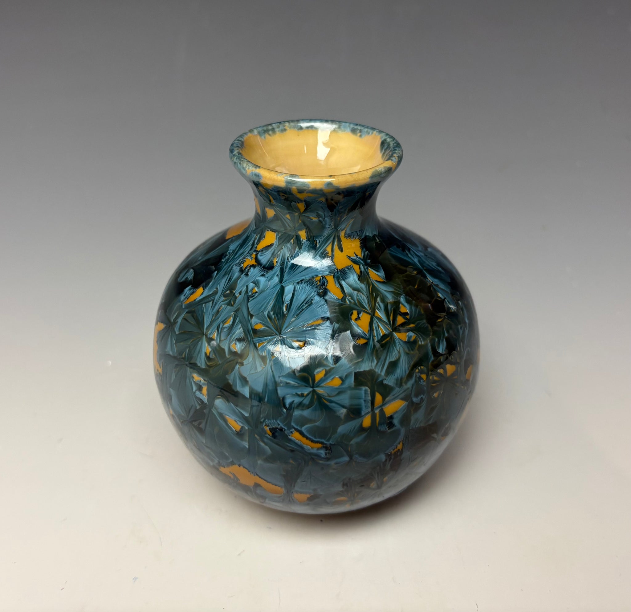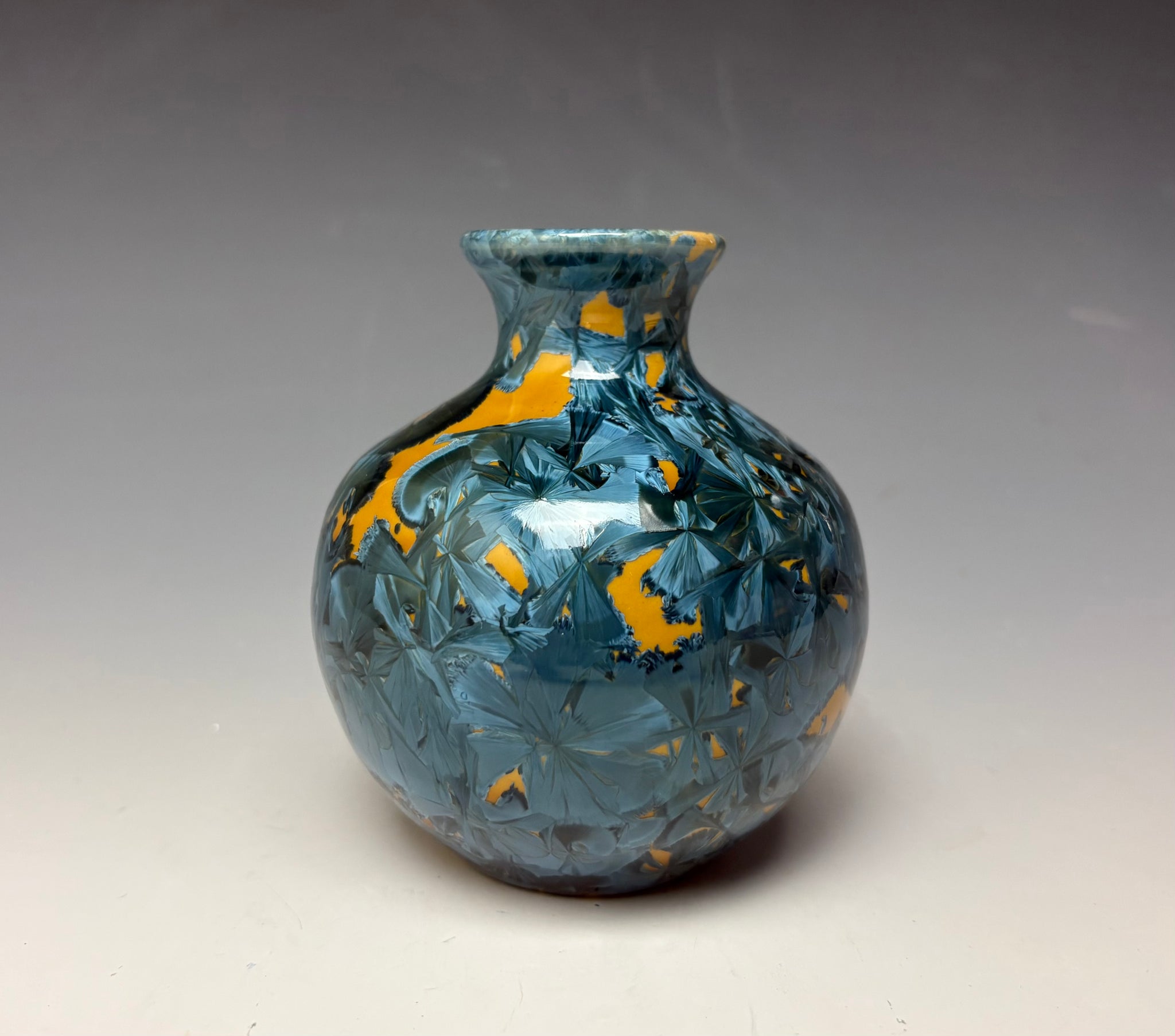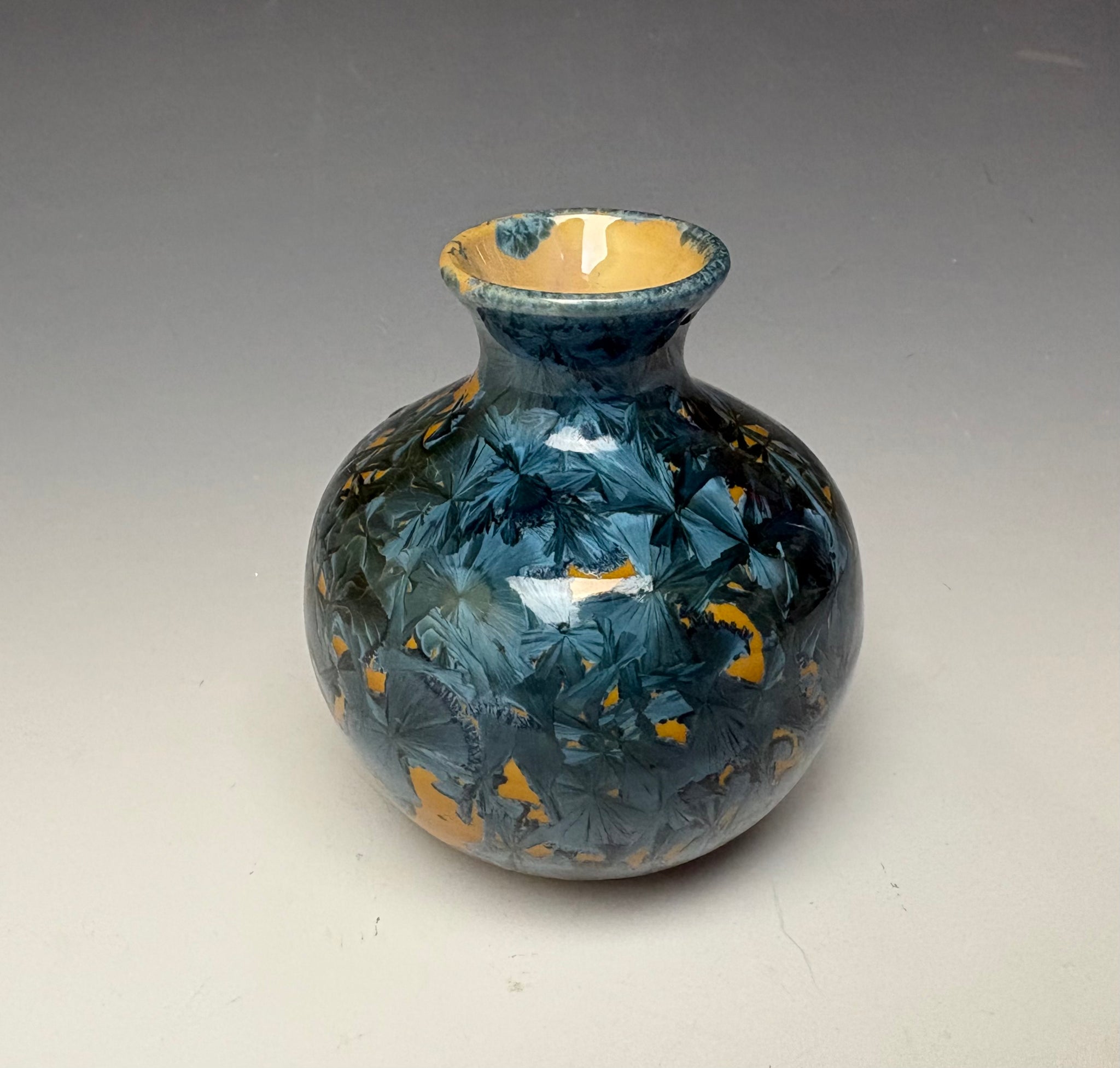 This vase was hand-made from porcelain clay on the potter's wheel. Due to the unique nature of crystalline glazes, no two pieces are ever alike. The zinc crystals are actually grown during the firing and cooling process. The time and temperature must be accurate in order to achieve crystal growth on the piece.