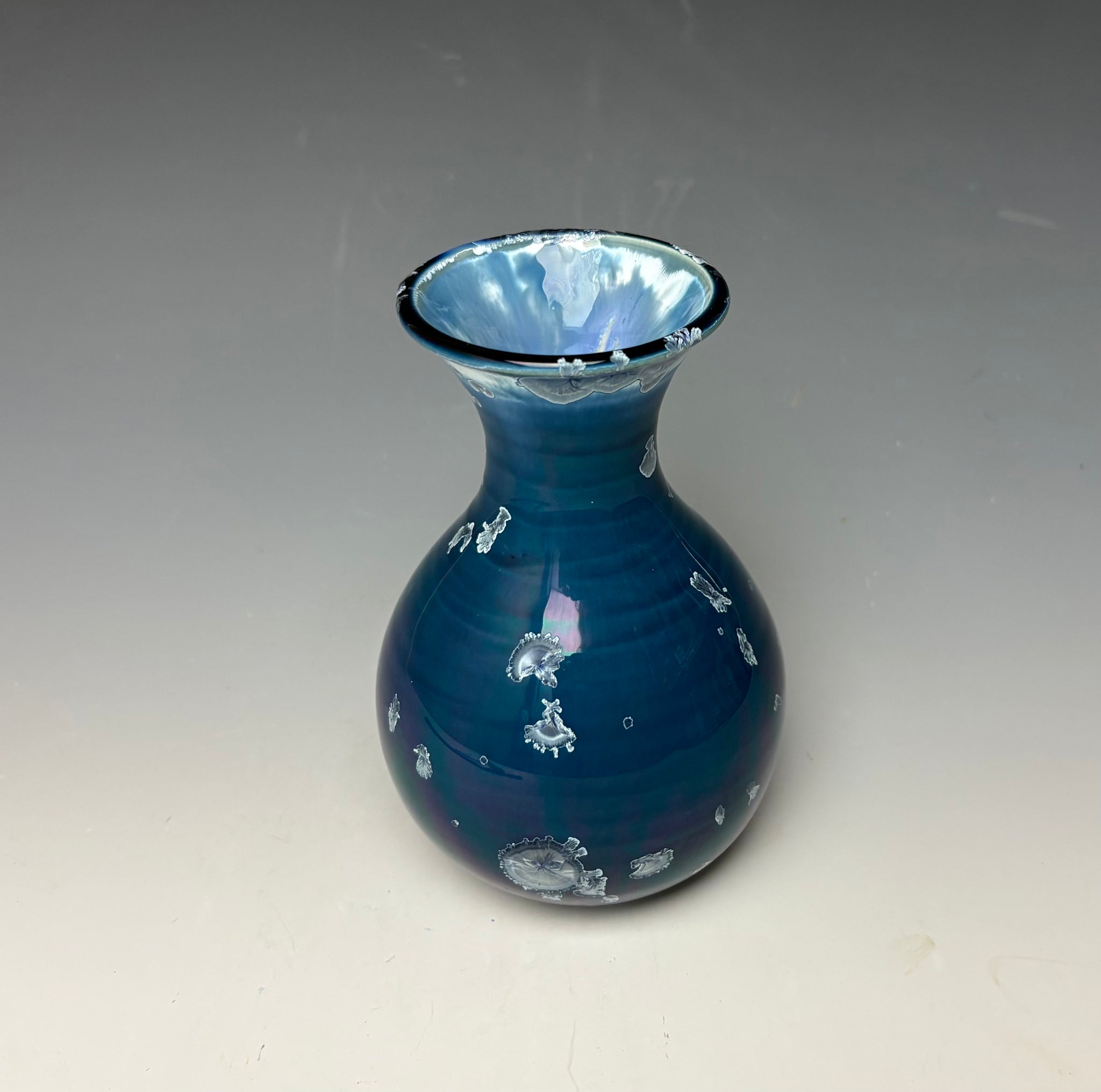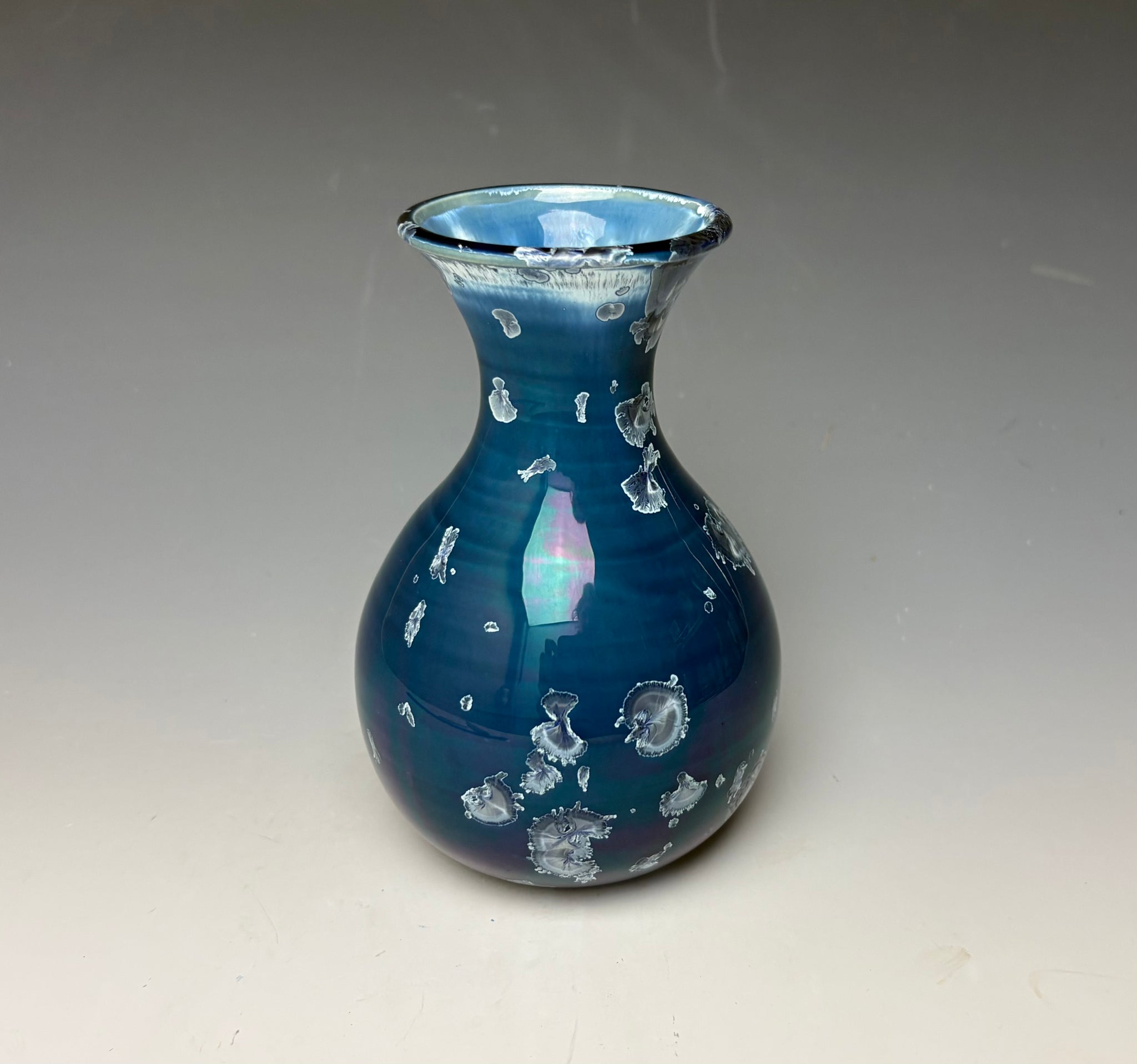 This 'Atlantic Storm Blue' is a deep ocean blue/teal/white background with blue/silver crystals. There is also some lovely iridescence on the glaze that glows in the light. Truly one of a kind! The vase would work well to hold a mini bunch of flowers or on its own.
