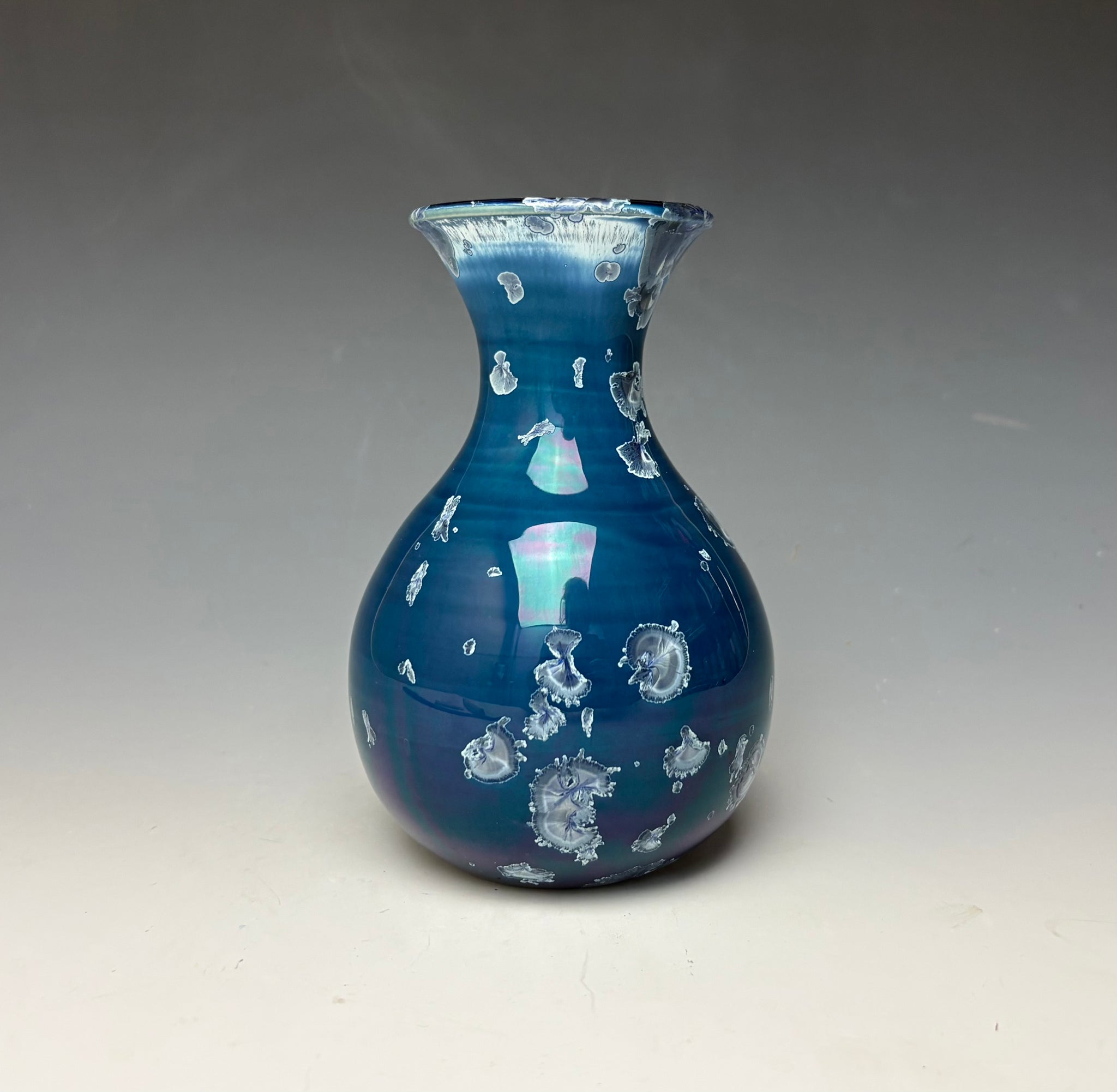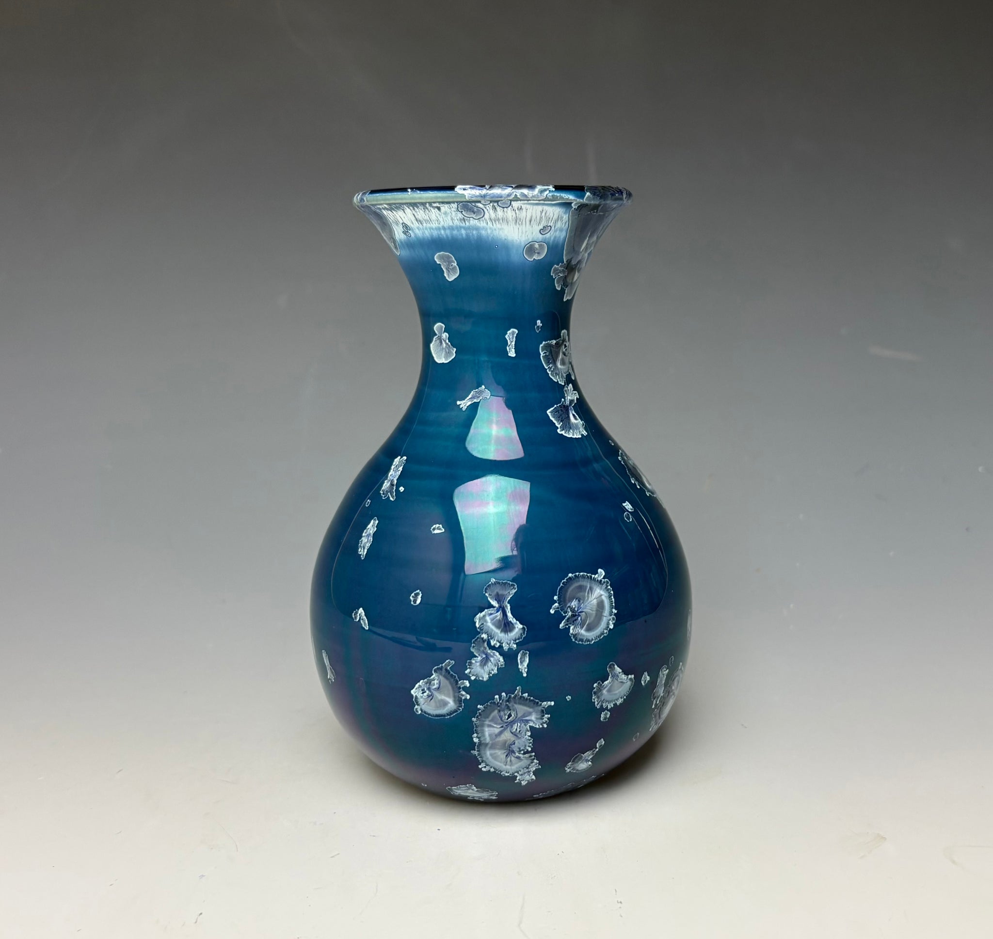 This vase was hand-made from porcelain clay on the potter's wheel. Due to the unique nature of crystalline glazes, no two pieces are ever alike. The zinc crystals are actually grown during the firing and cooling process. The time and temperature must be accurate in order to achieve crystal growth on the piece.