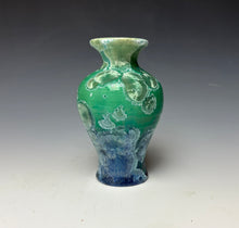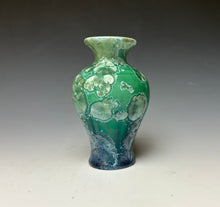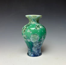 There is cobalt and copper in the glaze is what has given the lovely emerald green and silvery-blue crystals. As light moves around the vase, the crystals take on a new depth and wonder.