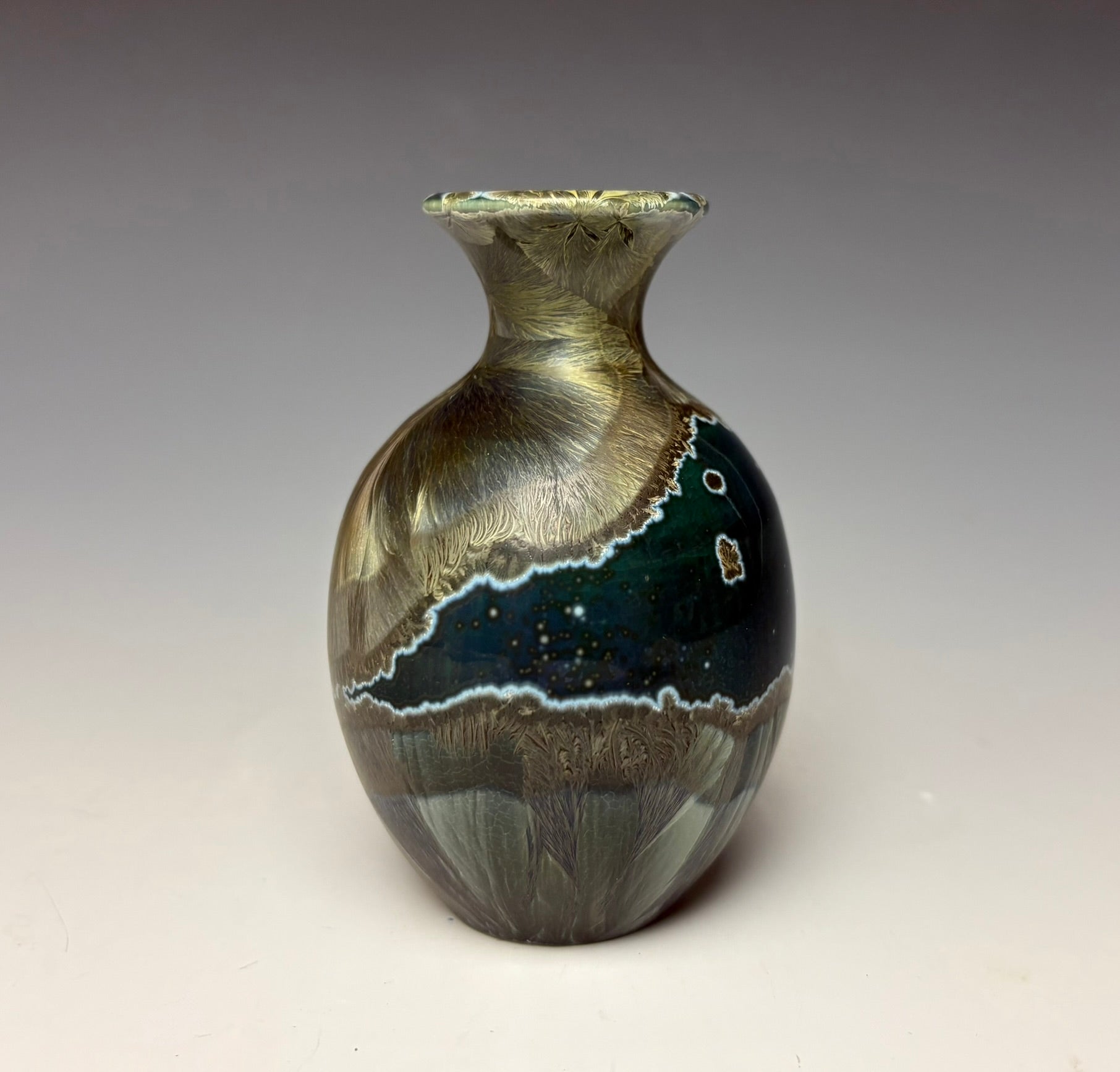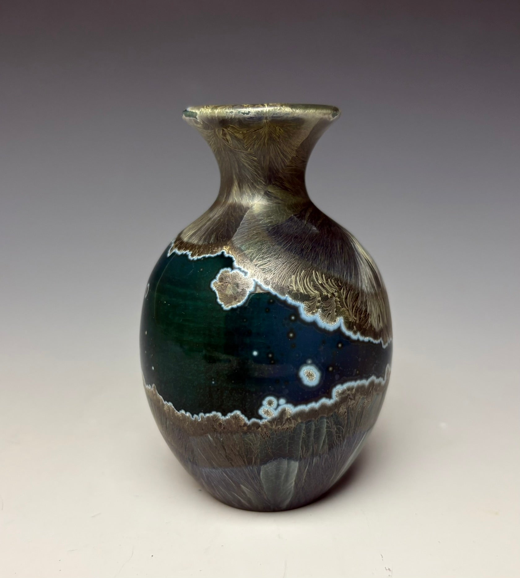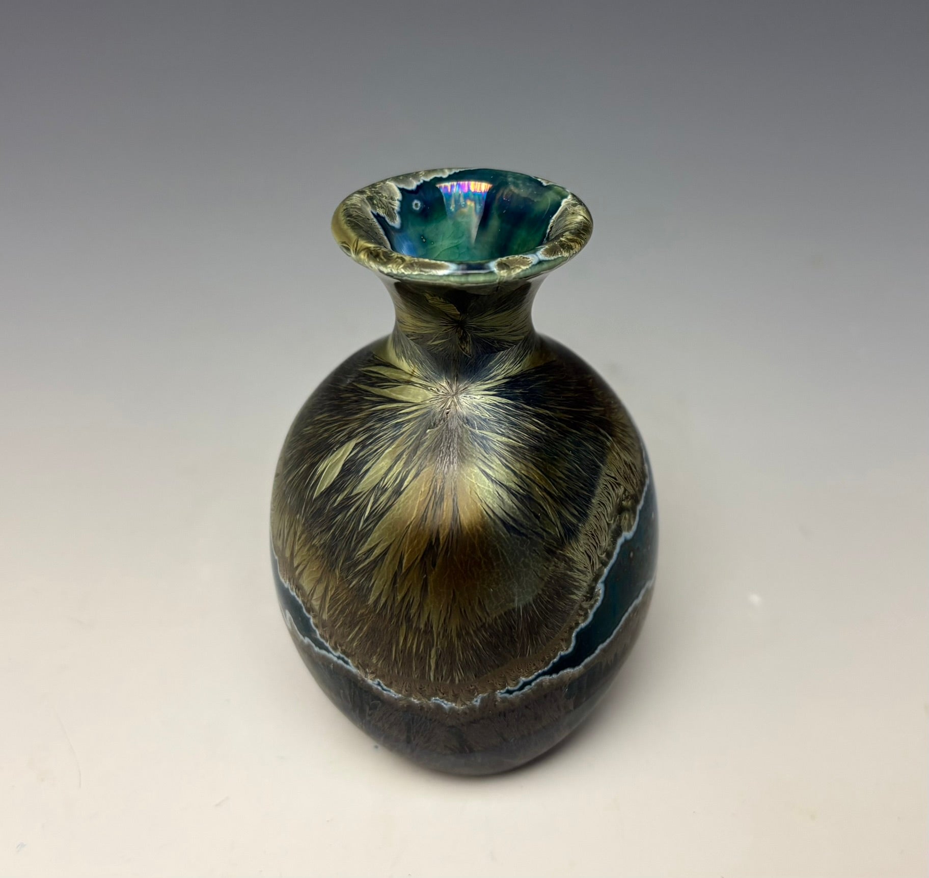 Due to the unique nature of crystalline glazes, no two pieces are ever alike. The crystals are actually grown during the firing and cooling process. The time and temperature must be accurate in order to achieve crystal growth on the piece. The type of light this vase is seen in can effect the color. In direct sunlight, the piece comes alive and seems to glow as the light reflects the shiny surface.
