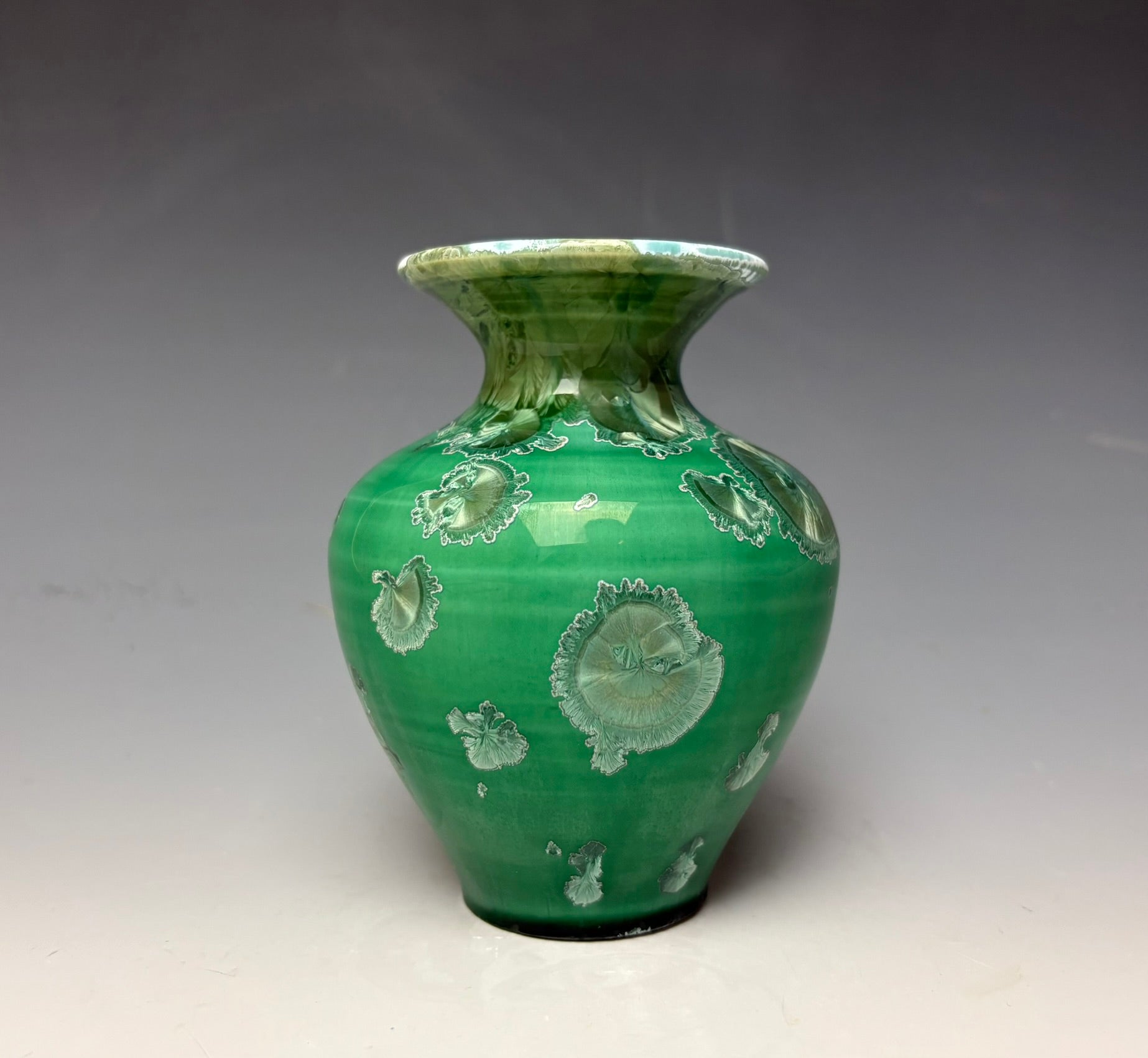 Due to the unique nature of crystalline glazes, no two pieces are ever alike. The crystals are actually grown during the firing and cooling process. The time and temperature must be accurate in order to achieve crystal growth on the piece. Copper is used in the glaze in order to achieve the deep green color.
