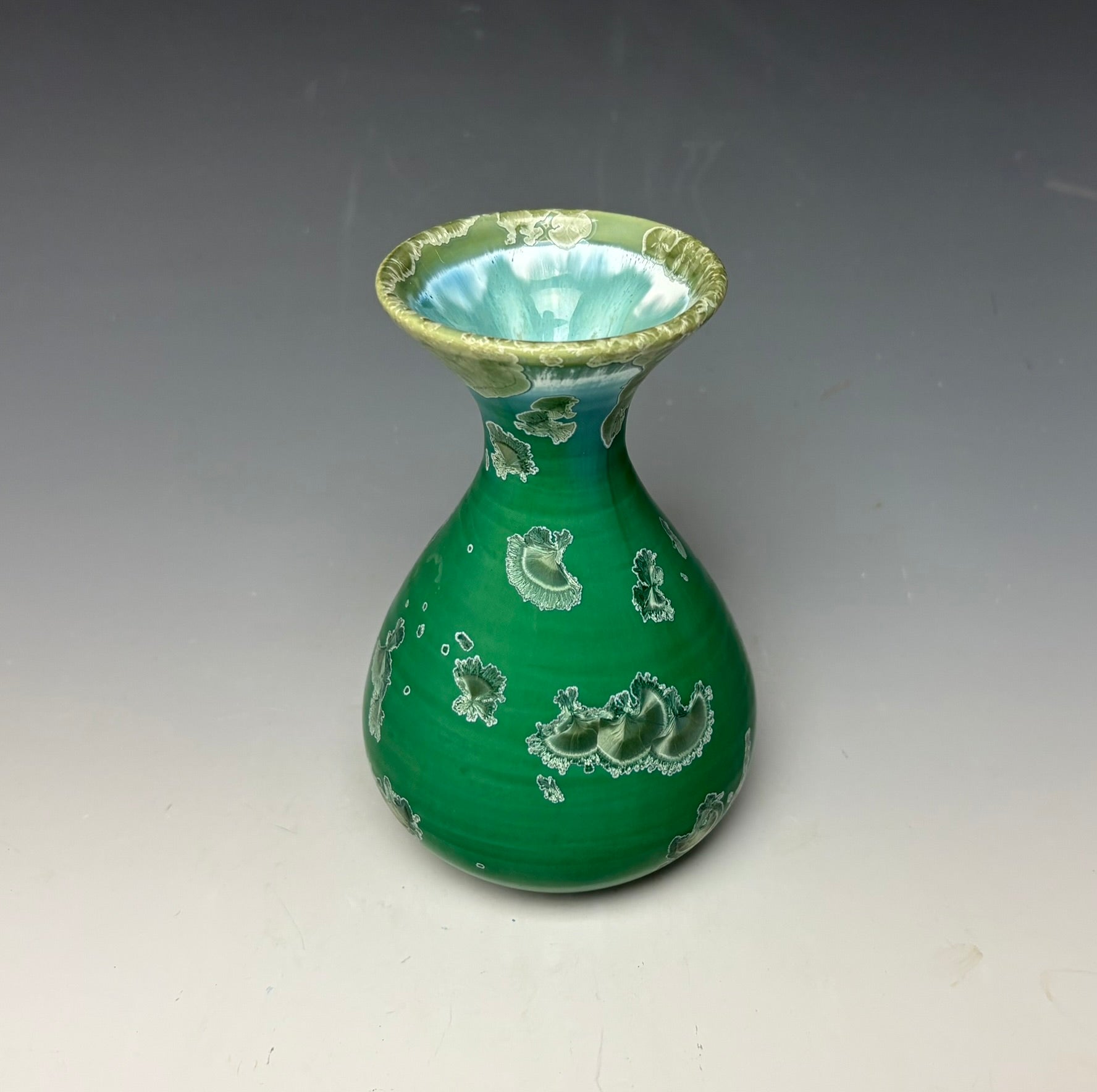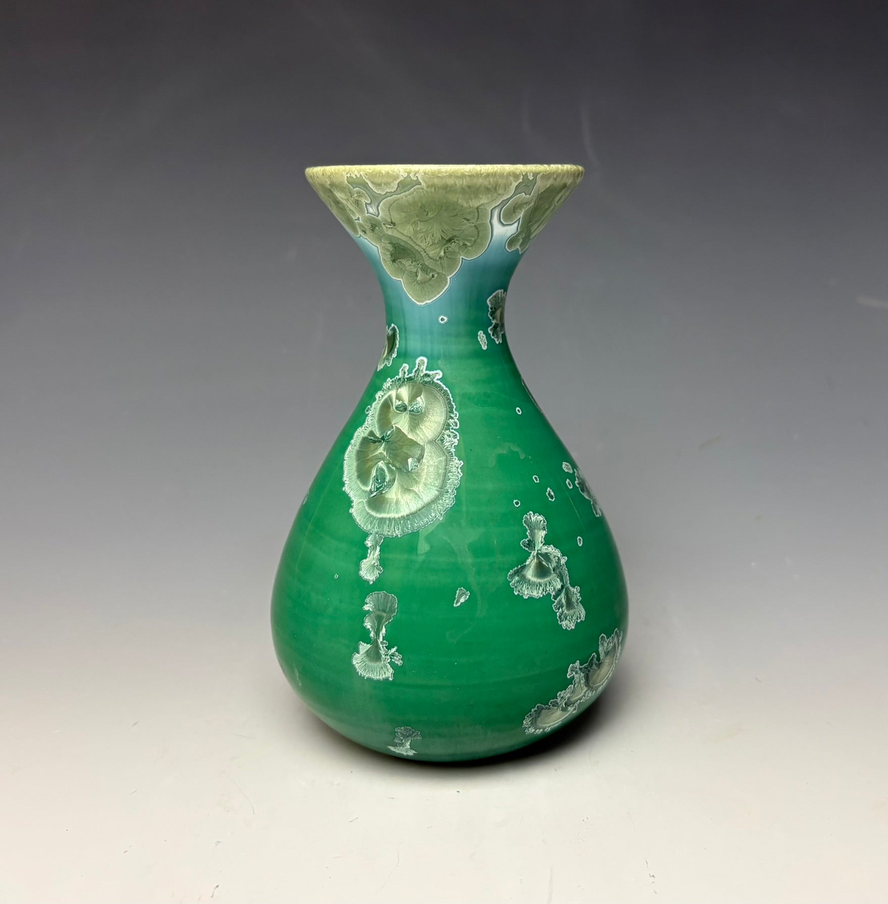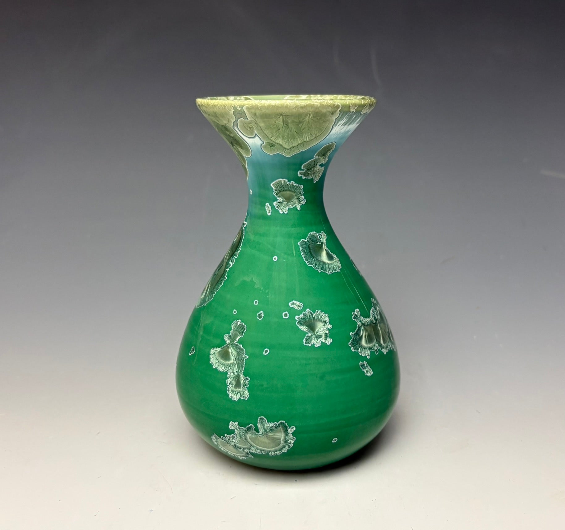 This vase was hand-made from porcelain clay on the potter's wheel by Lindsey. It is glazed with an emerald green zinc crystalline glaze on a satiny light green and white background that fades from light to dark, top to bottom. The crystals seem to pop off the surface of this unique vase as streaks of teal blue highlight different sections of the vase.