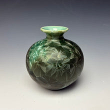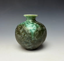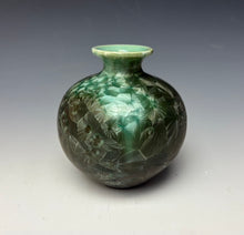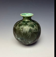This piece was hand made on the potter’s wheel from porcelain clay. The vase has silver colored crystals on a deep emerald green. background. The crystals you see on the vase are actual zinc crystals that were formed during the firing! They have a copper halo around each crystal which adds depth and dimension.