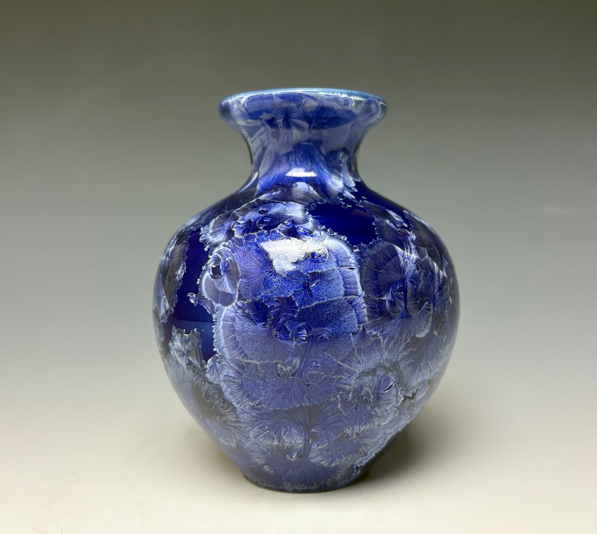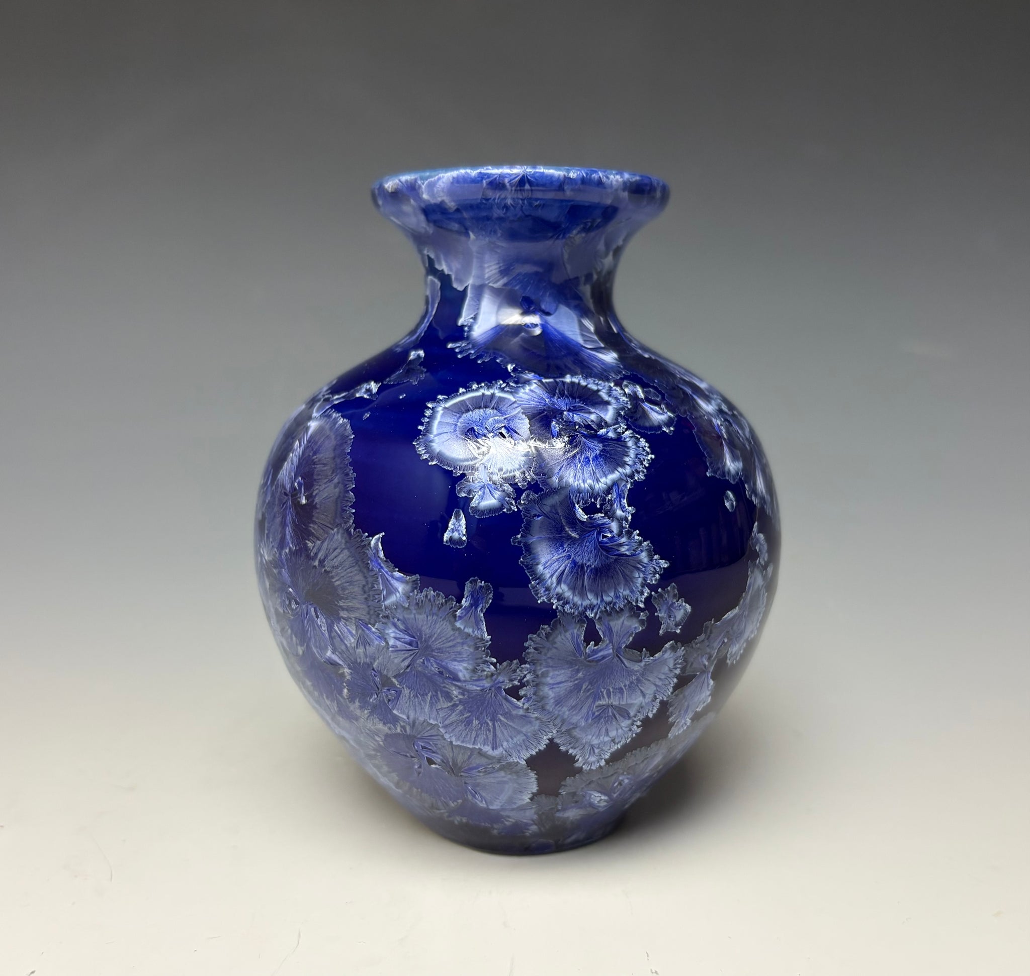 The piece has lovely royal blue/silver zinc crystals on a royal blue background. These crystals actually GROW during the firing and cooling process! No two pieces are ever alike. The bright blue crystals have a silver shimmer and dance about the dark blue background.