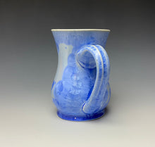 This piece was handmade on the potter's wheel by Lindsey from porcelain clay. It is glazed with a light, powder blue crystalline glaze with light blue crystals wrapping around the cup that gives a multitude of depth and dimension to this piece.