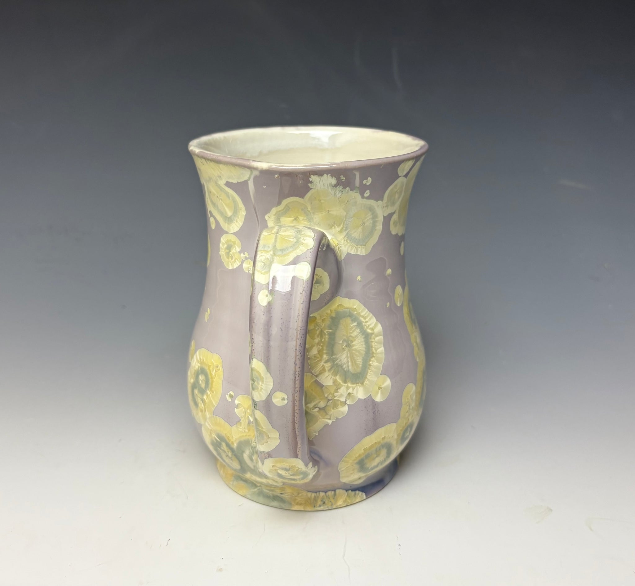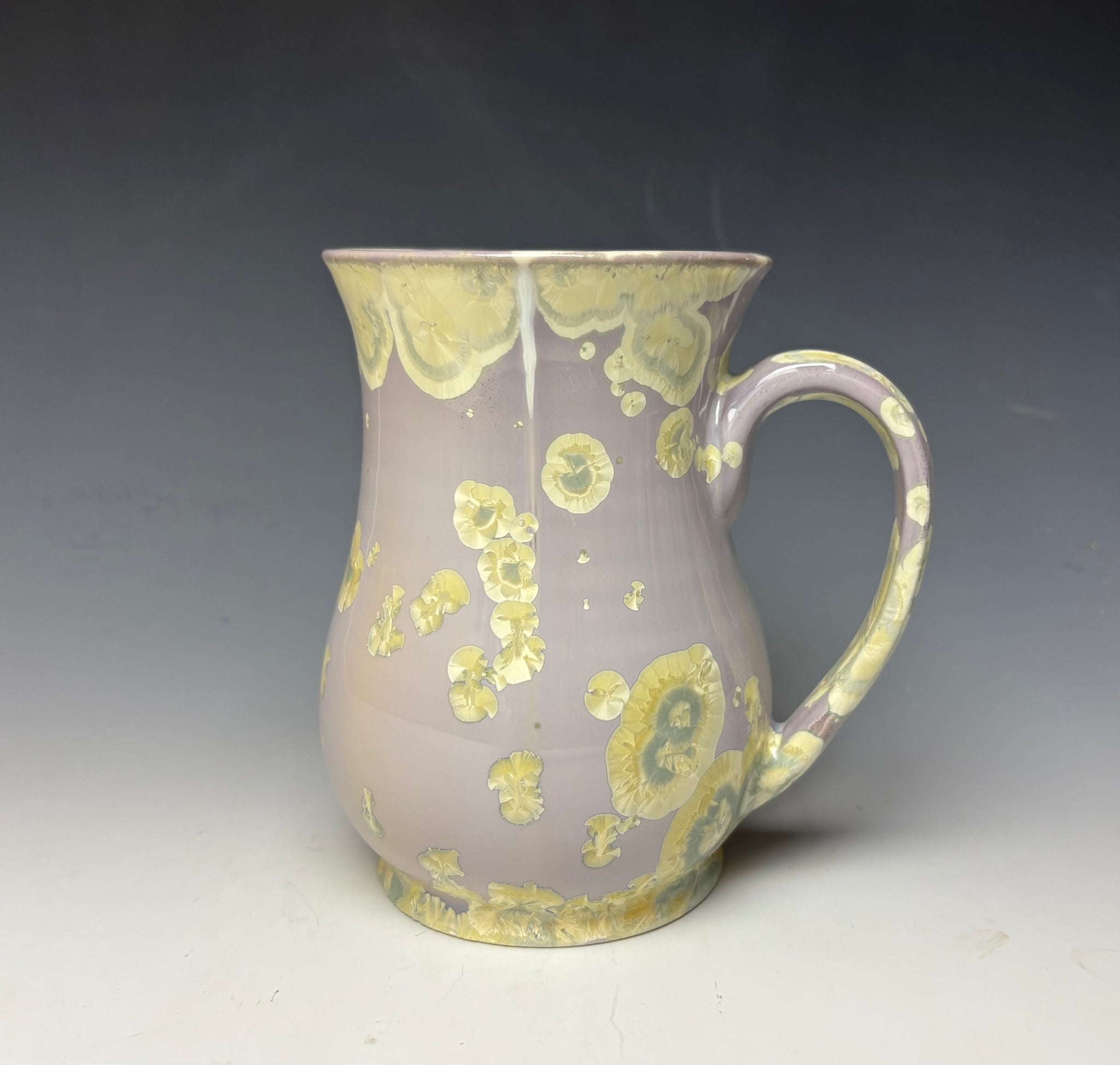 Due to the unique nature of crystalline glazes, no two pieces are ever alike. The crystals are actually grown during the firing and cooling process. The time and temperature must be accurate in order to achieve crystal growth on the piece. The mug was fired an additional time in a gas kiln after the initial glaze firing the achieve the ombré colors on the background.
