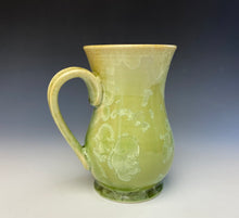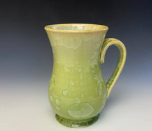 This mug was hand-made from porcelain clay on the potter's wheel by Lindsey. It is glazed with light olive green crystals on a light olive green background.