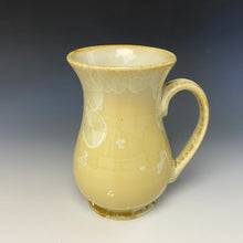The mug has golden yellow crystals on a yellow background. Truly one of a kind! The mug is perfect for coffee, tea, water, or any of you other favorite beverages.
