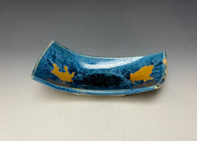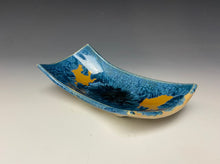 It is glazed with blue crystals on an orange background. Where the glaze pools in the center, there is a deeper color with the accumulation of glaze & crystals. Truly one of a kind! The tray would work well to hold your favorite precious items, snacks or small appetizers.