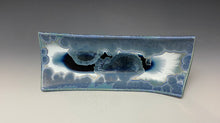 It is glazed in a denim blue color, with light teal silver crystals and white along the edges. Where the glaze pools in the center, there is a deeper blue with the accumulation of glaze & crystals. Truly one of a kind! The tray would work well to hold your favorite precious items, snacks or small appetizers.