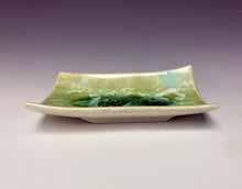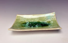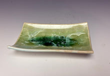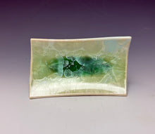 It is glazed with light mossy green crystals on a light green background. Where the glaze pools in the center, there is a deeper color with the accumulation of glaze & crystals that sometimes form a crackle pattern. Truly one of a kind! The tray would work well to hold your favorite precious items, snacks or small appetizers.