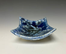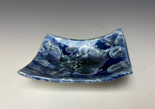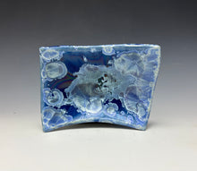 It is glazed in a my 'winter sky blue' color, which has blue/silver crystals and white along the edges a deep cobalt background. Where the glaze pools in the center, there is a deeper blue with the accumulation of glaze & crystals. Truly one of a kind! The tray would work well to hold your favorite precious items, or small snacks or small appetizers.