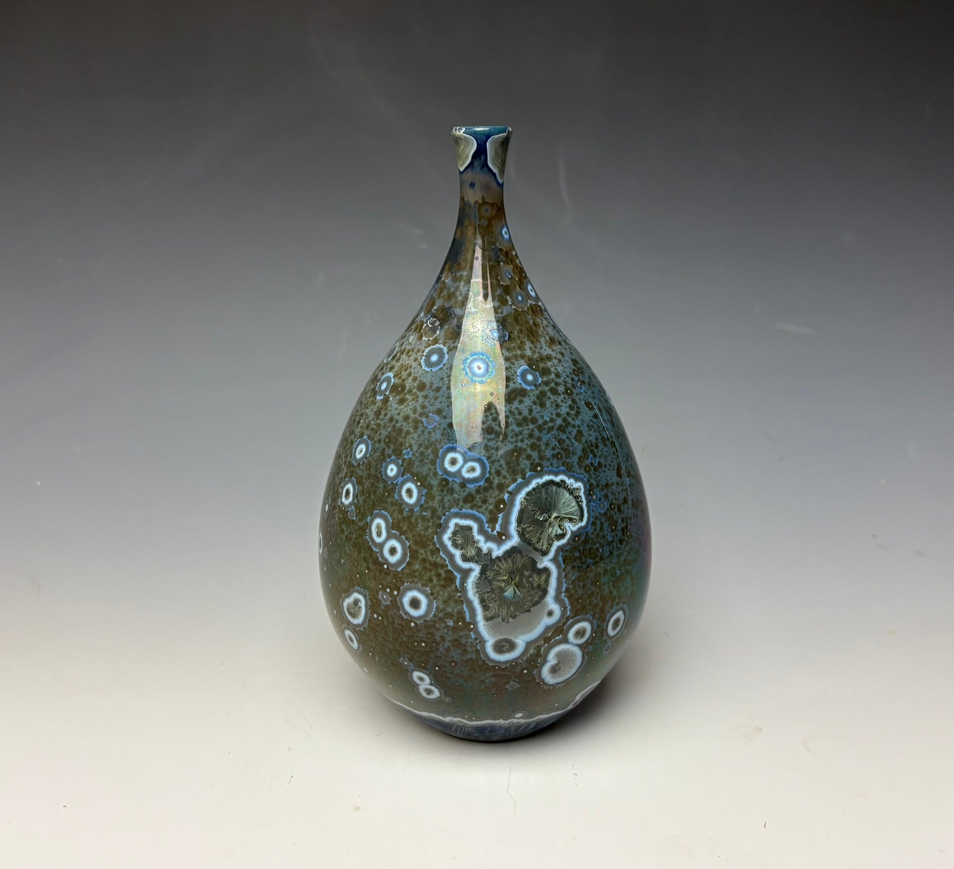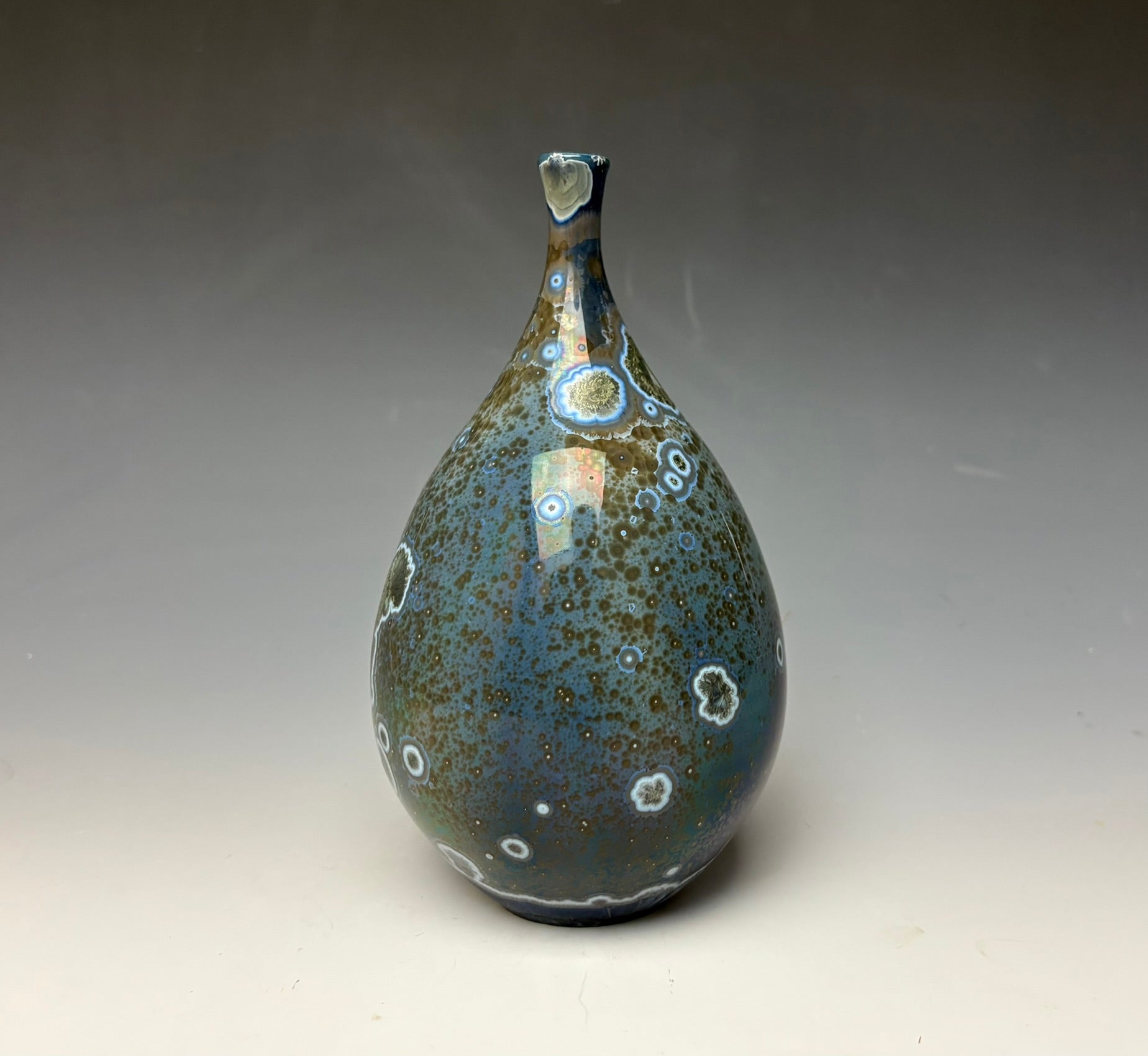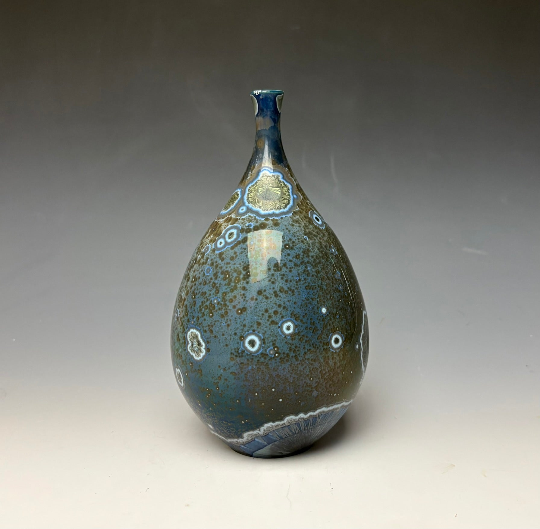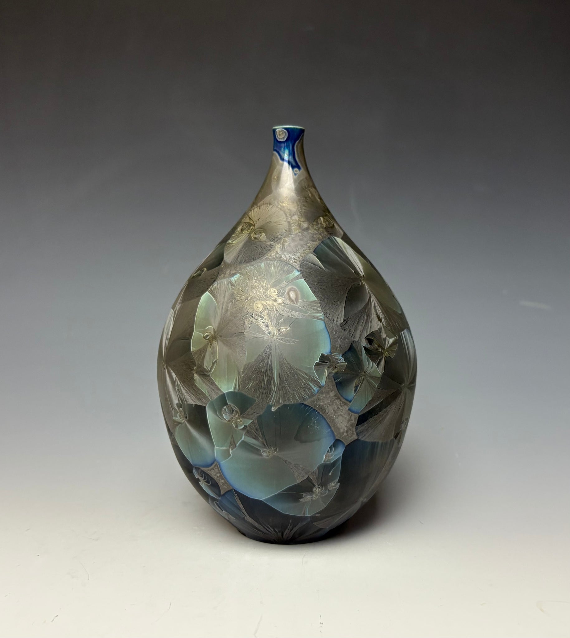 This vase was hand-made from porcelain clay on the potter's wheel by Lindsey. It is glazed with a unique glaze of copper & cobalt. The surface is multidimensional, with silvery blue crystals that have blue, grey and silver halos. There are other speckles with grey and pewter colored. The small crystals seem to pop off the surface of this unique vase as streaks of blue and white highlight different sections of the vase.