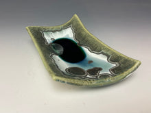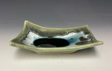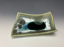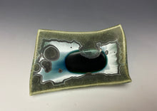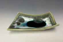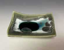 It is glazed with emerald green crystals on a green, white and silvery background. Where the glaze pools in the center, there is a deeper color with the accumulation of glaze & crystals. Truly one of a kind! The tray would work well to hold your favorite precious items, snacks or small appetizers.