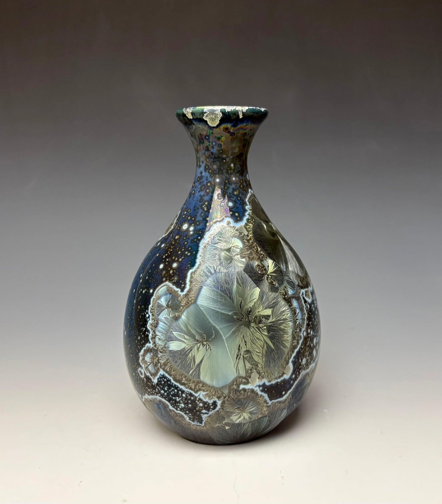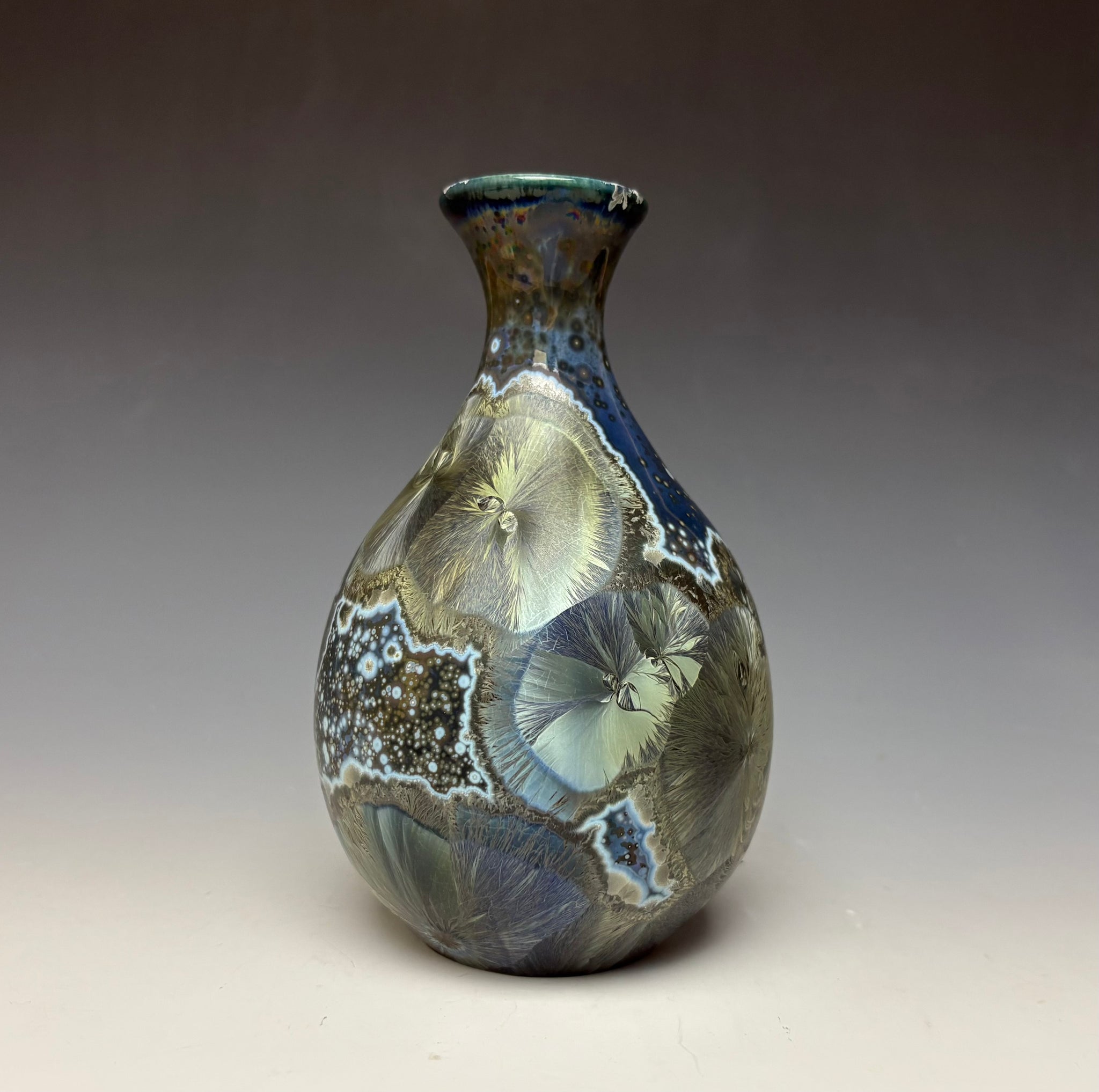 Due to the unique nature of crystalline glazes, no two pieces are ever alike. The crystals are actually grown during the firing and cooling process (which reaches over 2300 degrees Fahrenheit). The time and temperature must be accurate in order to achieve crystal growth on the piece.