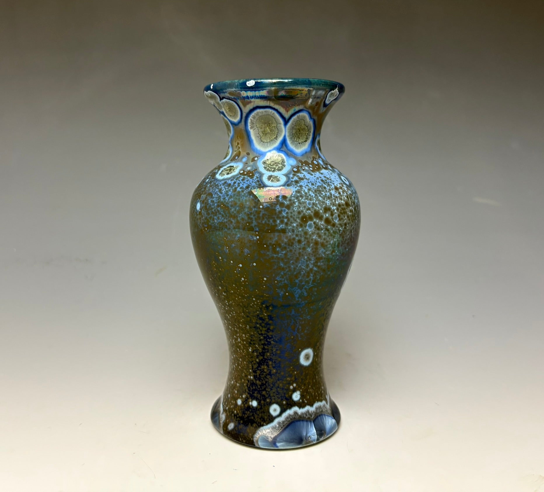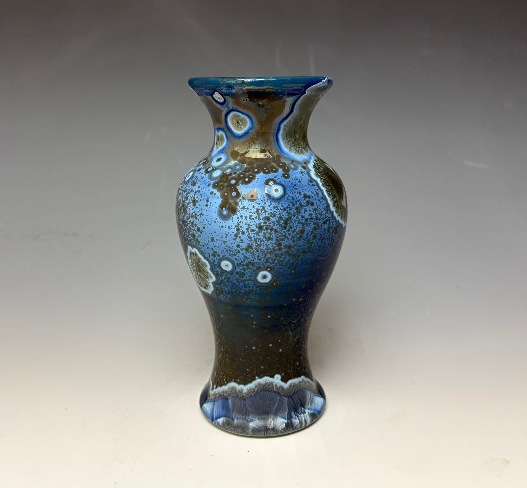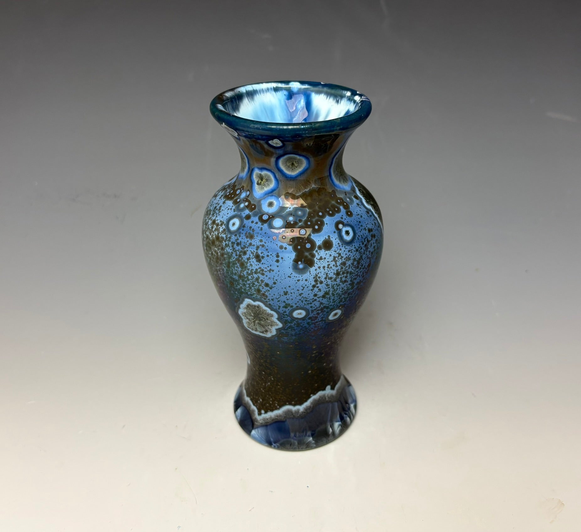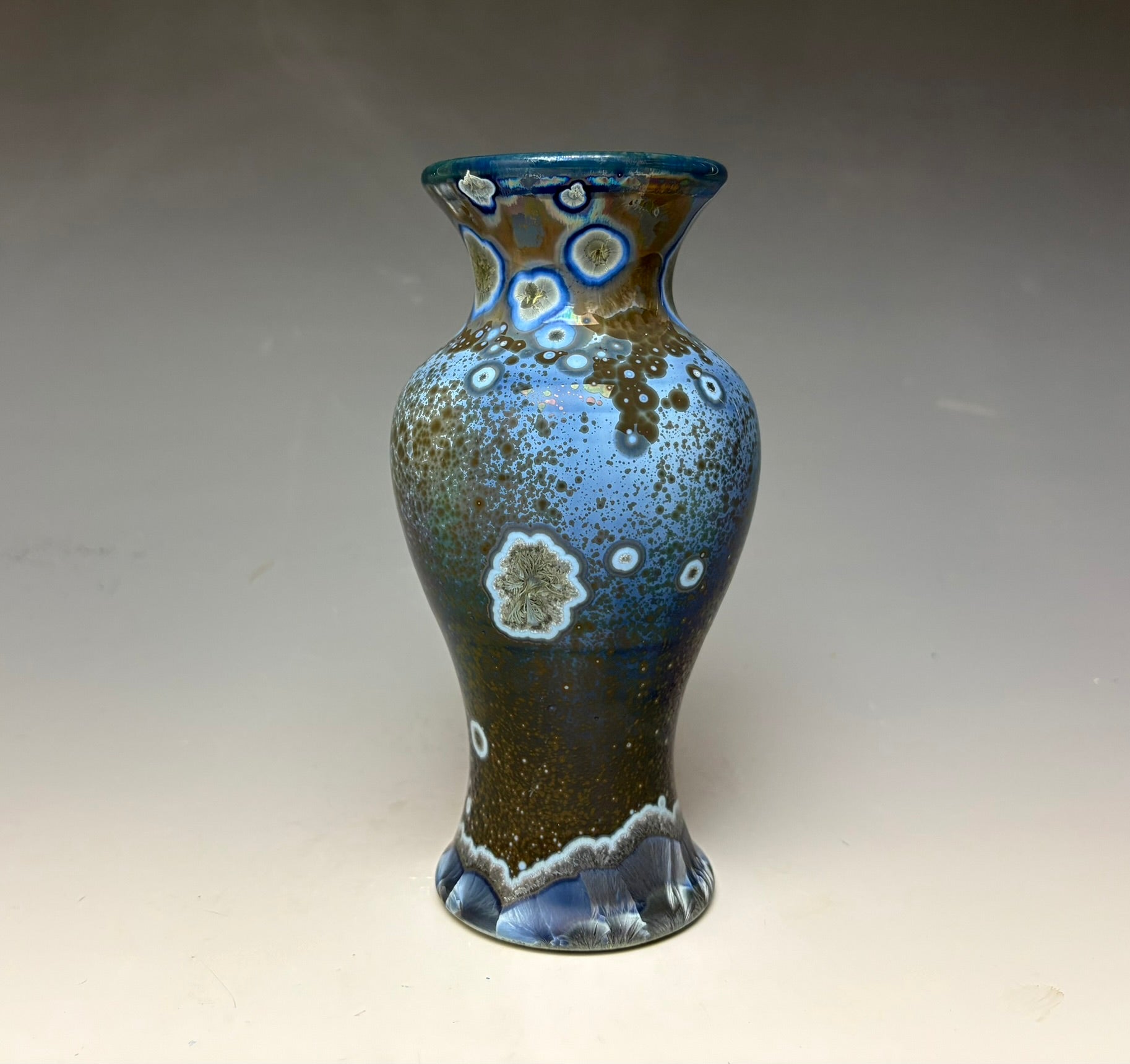Due to the unique nature of crystalline glazes, no two pieces are ever alike. The crystals are actually grown during the firing and cooling process (which reaches over 2300 degrees Fahrenheit). The time and temperature must be accurate in order to achieve crystal growth on the piece.
