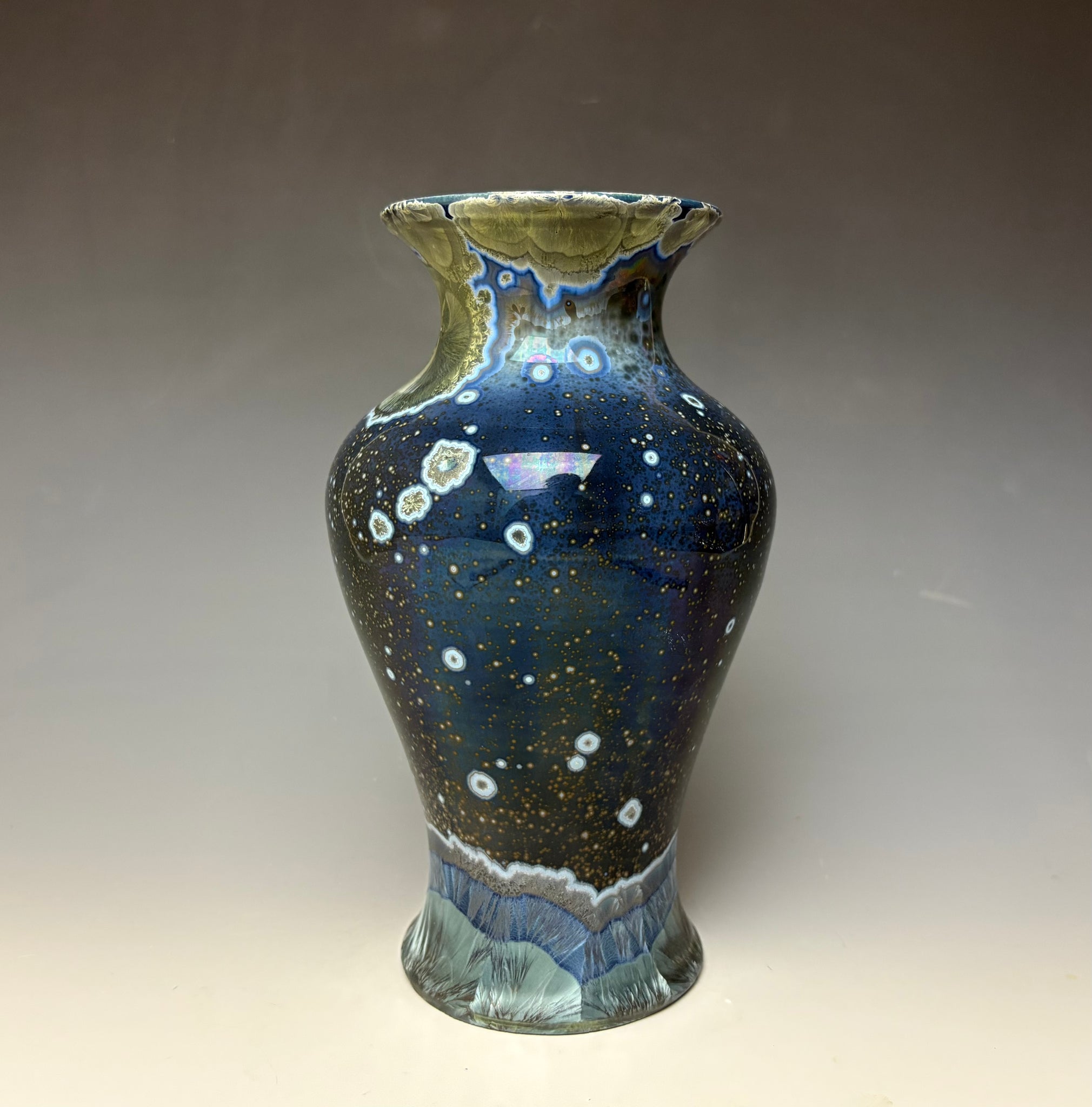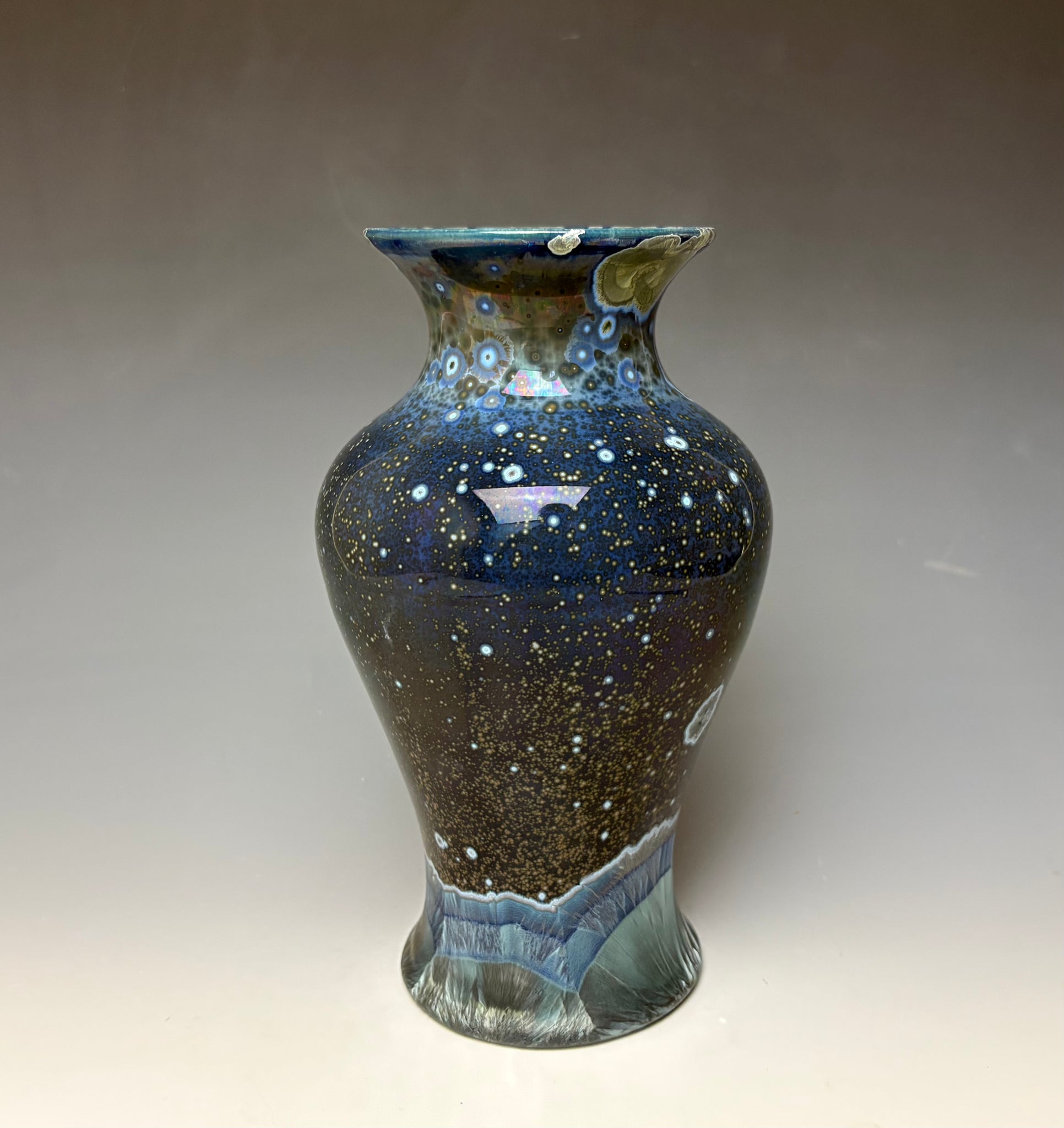 This vase was hand-made from porcelain clay on the potter's wheel by Lindsey. It is glazed with a unique glaze of copper & cobalt. The surface is multidimensional, with silvery blue crystals that have blue, grey and silver halos. There are other speckles with grey and pewter colored. The small crystals seem to pop off the surface of this unique vase as streaks of blue and white highlight different sections of the vase.