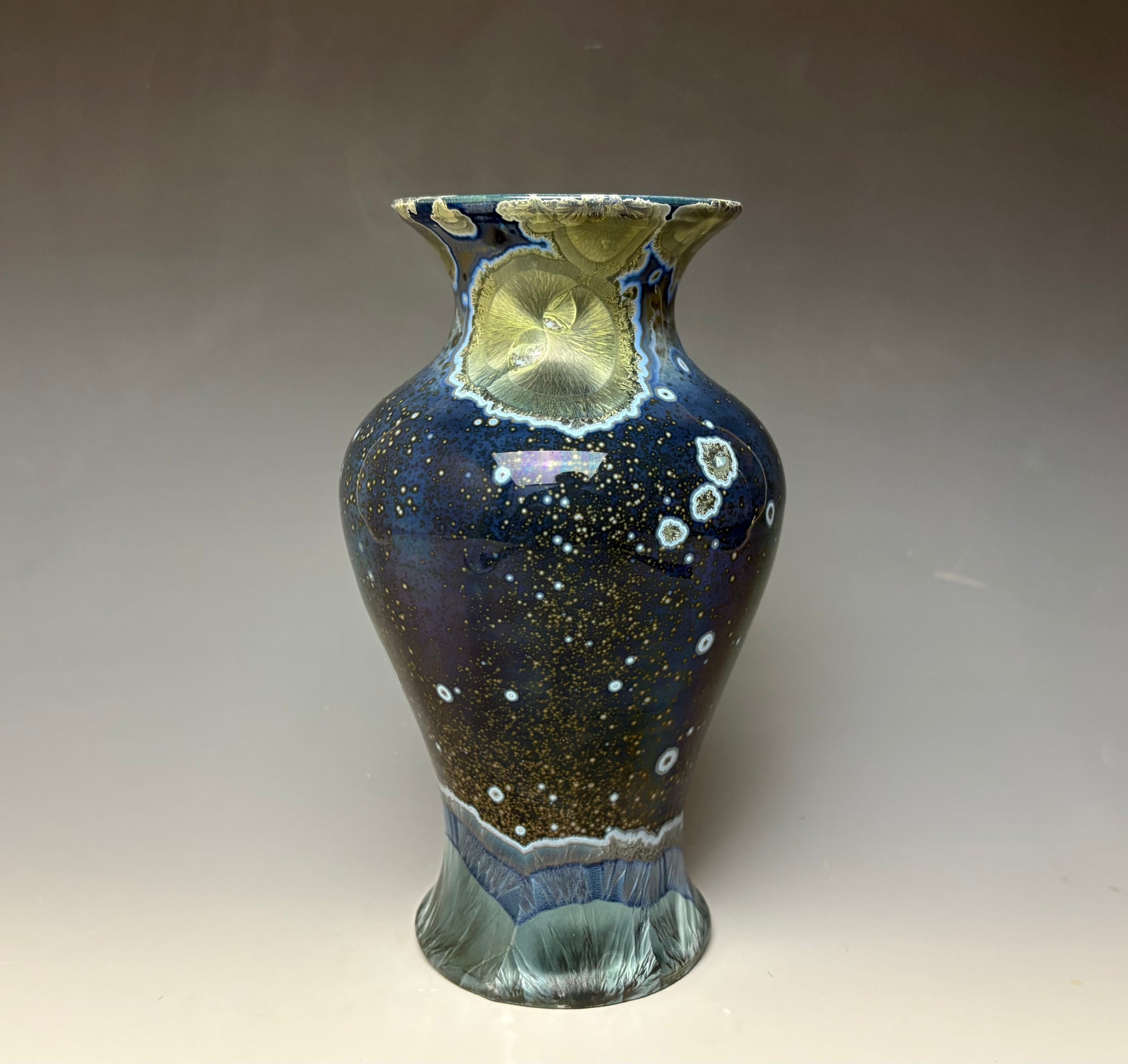 Due to the unique nature of crystalline glazes, no two pieces are ever alike. The crystals are actually grown during the firing and cooling process. The time and temperature must be accurate in order to achieve crystal growth on the piece.