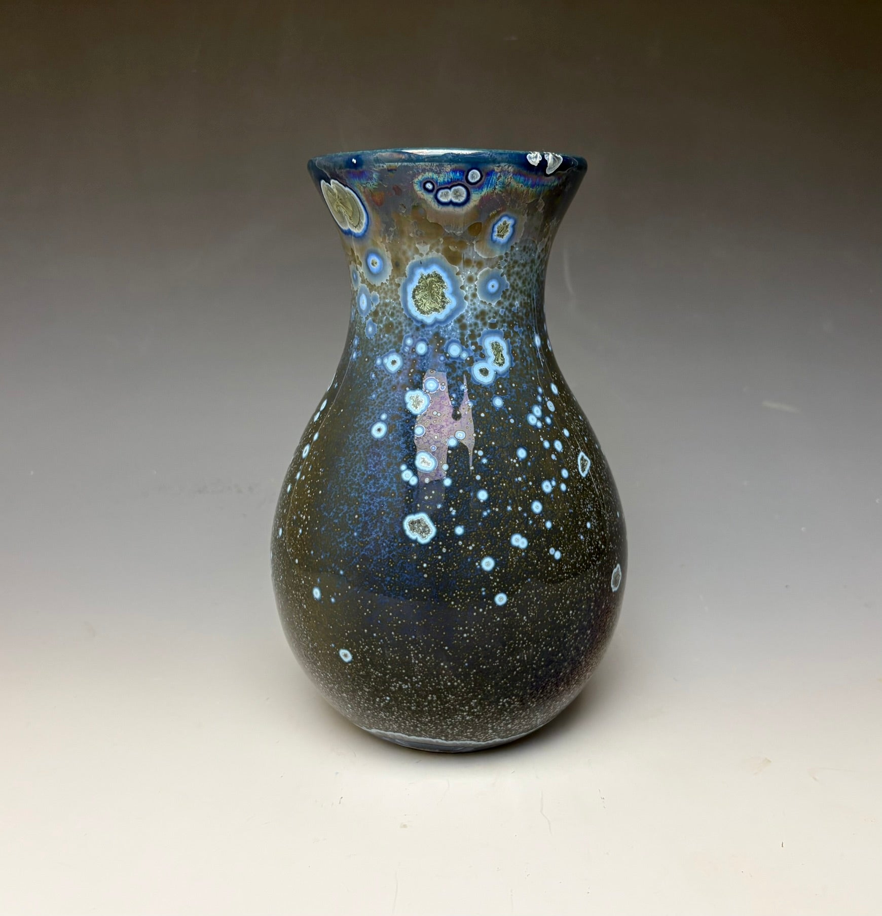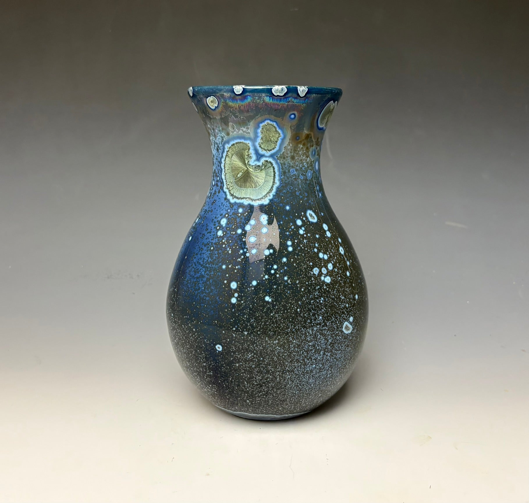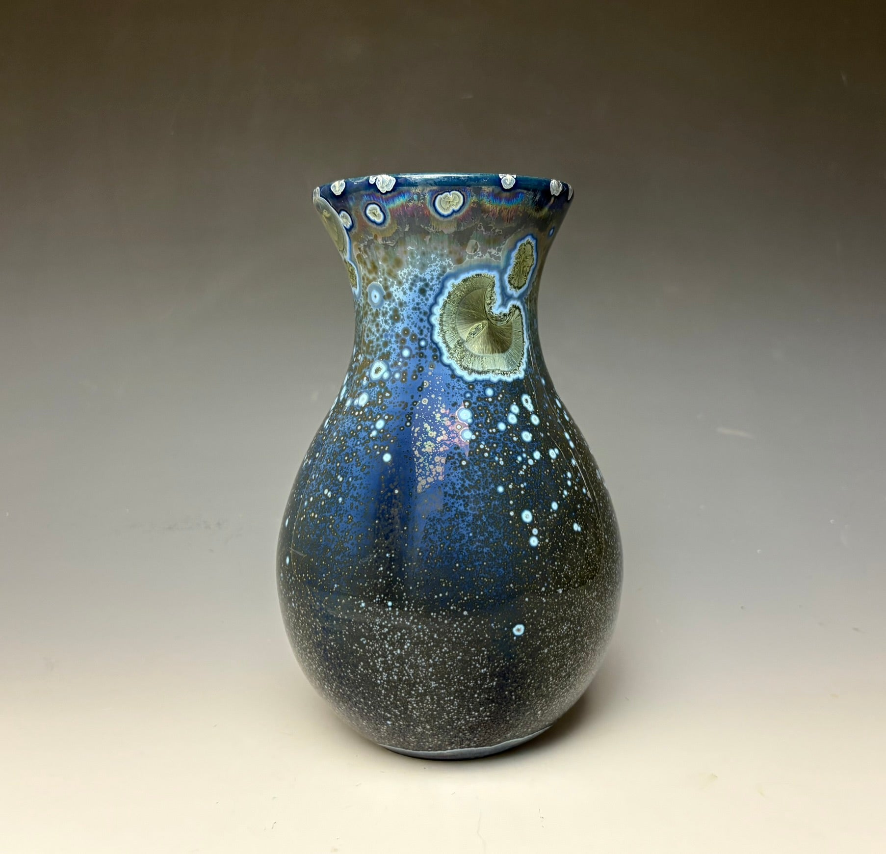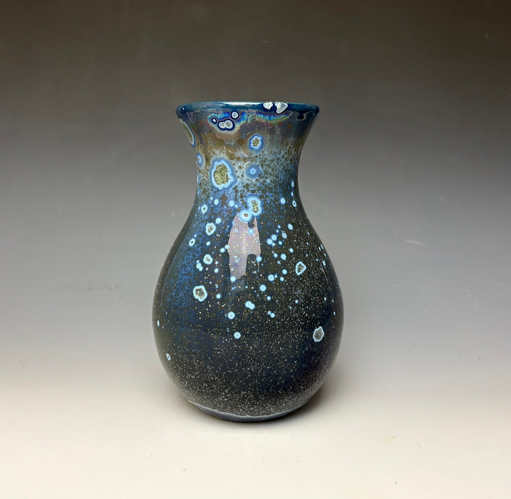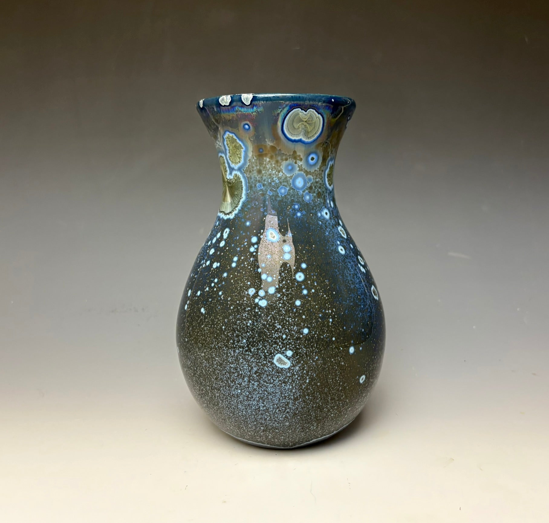 This vase was hand-made from porcelain clay on the potter's wheel by Lindsey. It is glazed with a unique glaze of copper & cobalt. The surface is multidimensional, with silvery blue crystals that have blue, grey and silver halos. There are other speckles with grey and pewter colored. The crystals seem to pop off the surface of this unique vase as streaks of blue and white highlight different sections of the vase.