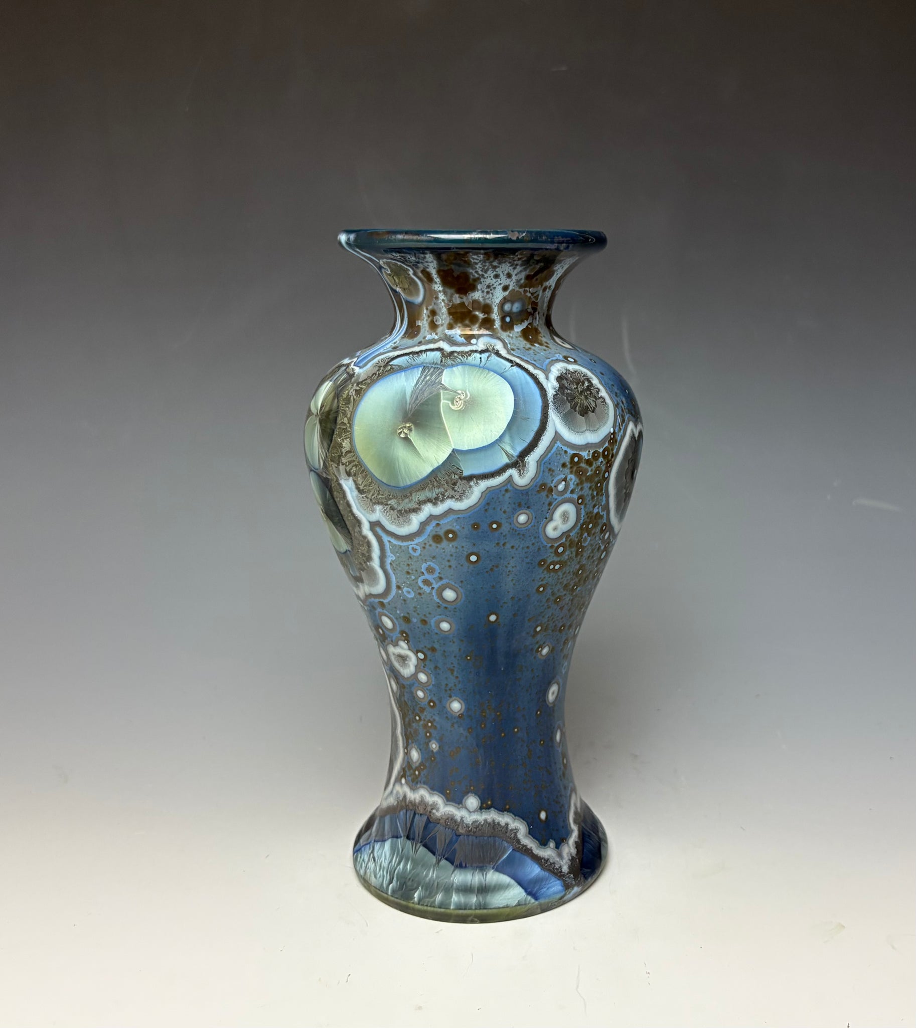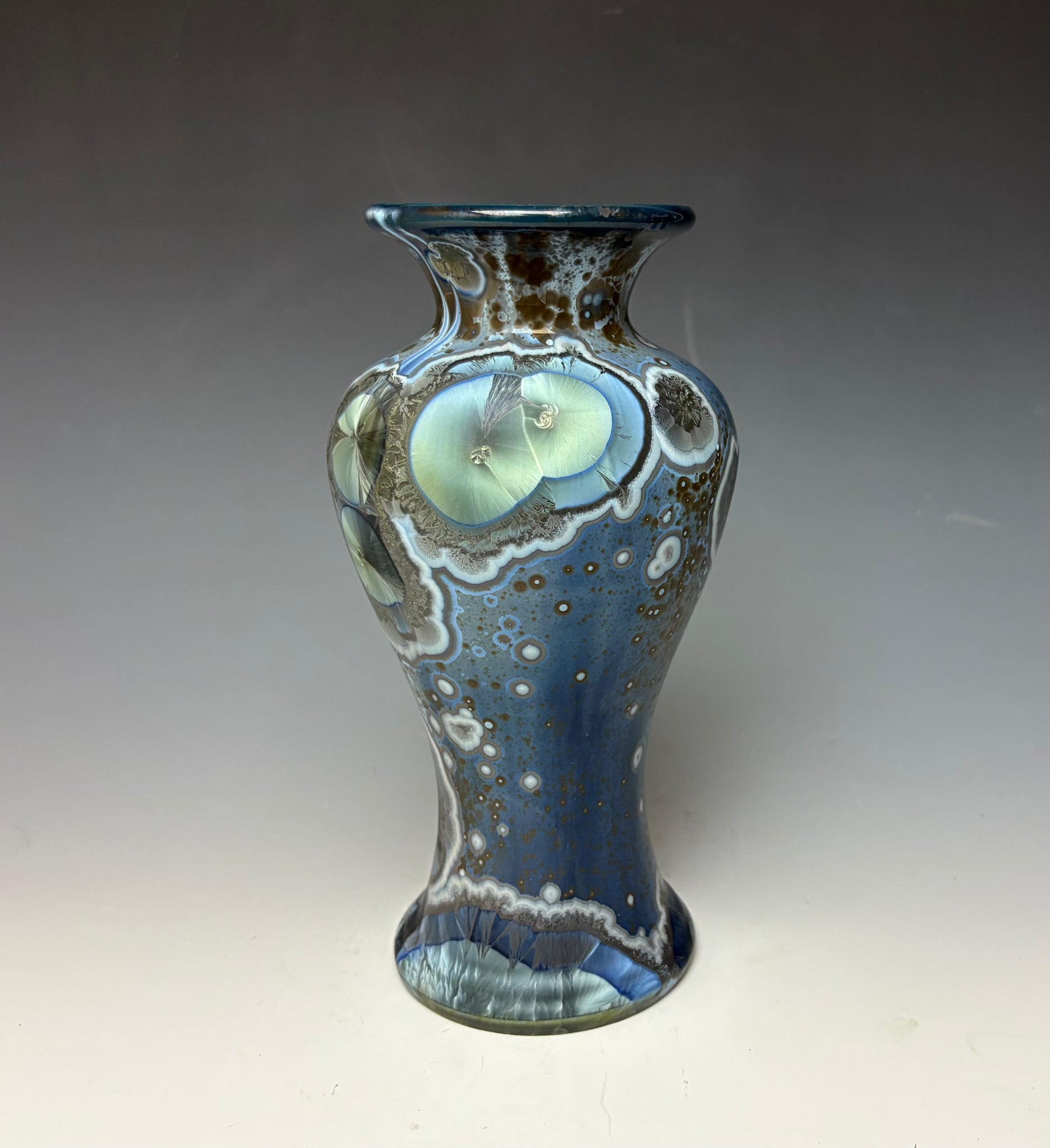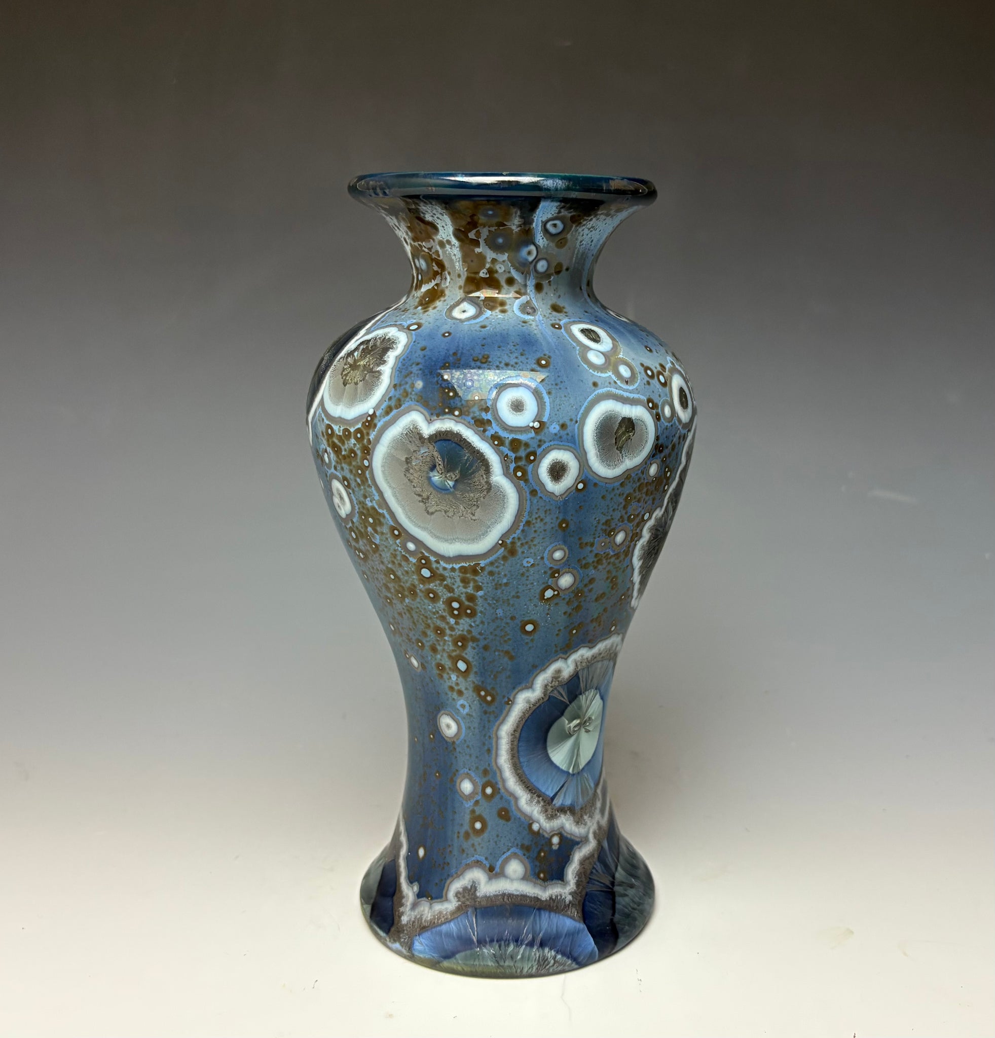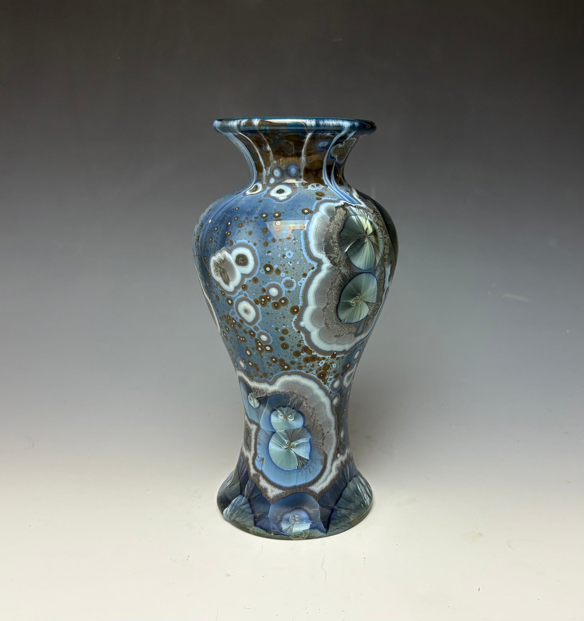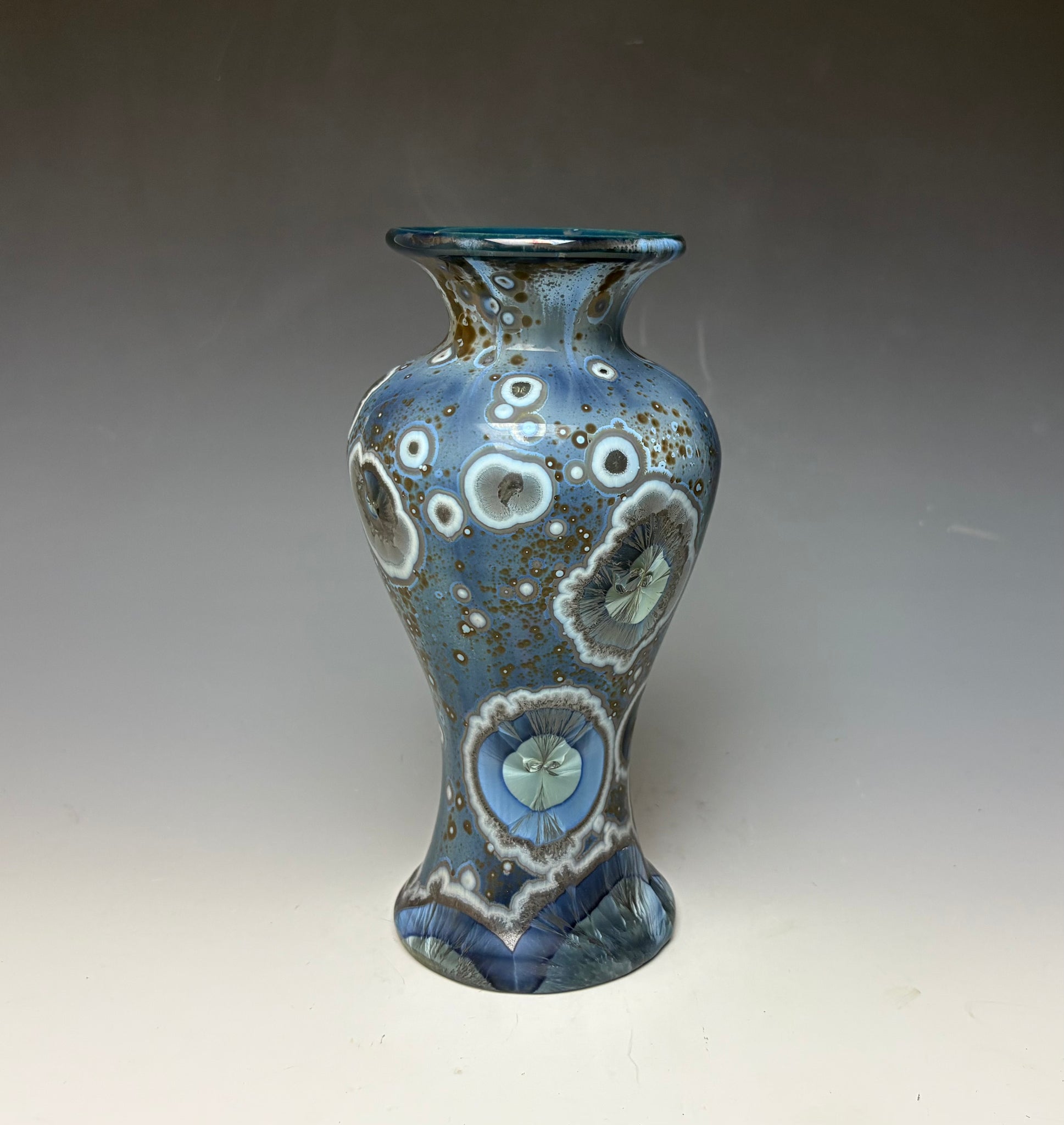 This vase was hand-made from porcelain clay on the potter's wheel by Lindsey. It is glazed with a unique glaze of copper & cobalt. The surface is multidimensional, with silvery blue crystals that have blue, grey and silver halos. There are other speckles with grey and pewter colored. The crystals seem to pop off the surface of this unique vase as streaks of blue and white highlight different sections of the vase.
