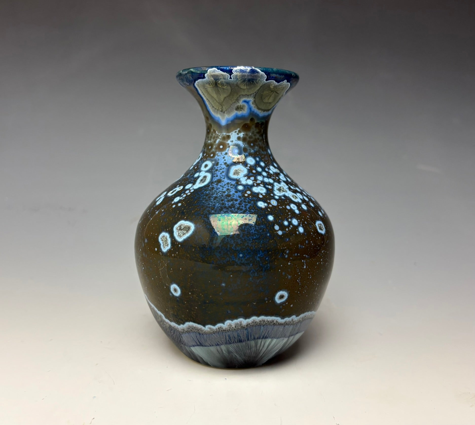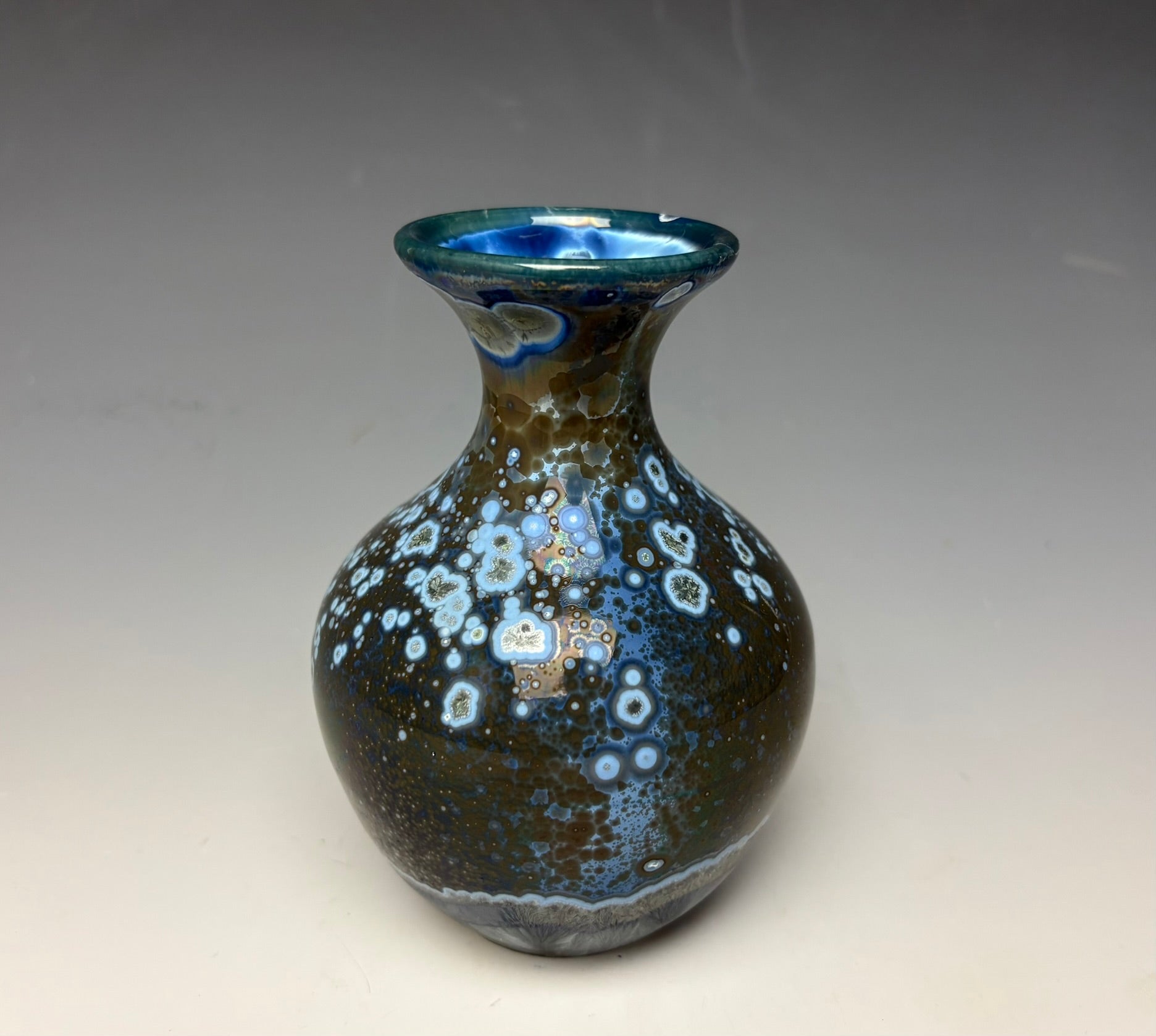 The blue zinc crystals covering the surface float on a pewter, white, silver and teal background. This vase has a lot of sparkle to it with smaller secondary titanium crystals as well!