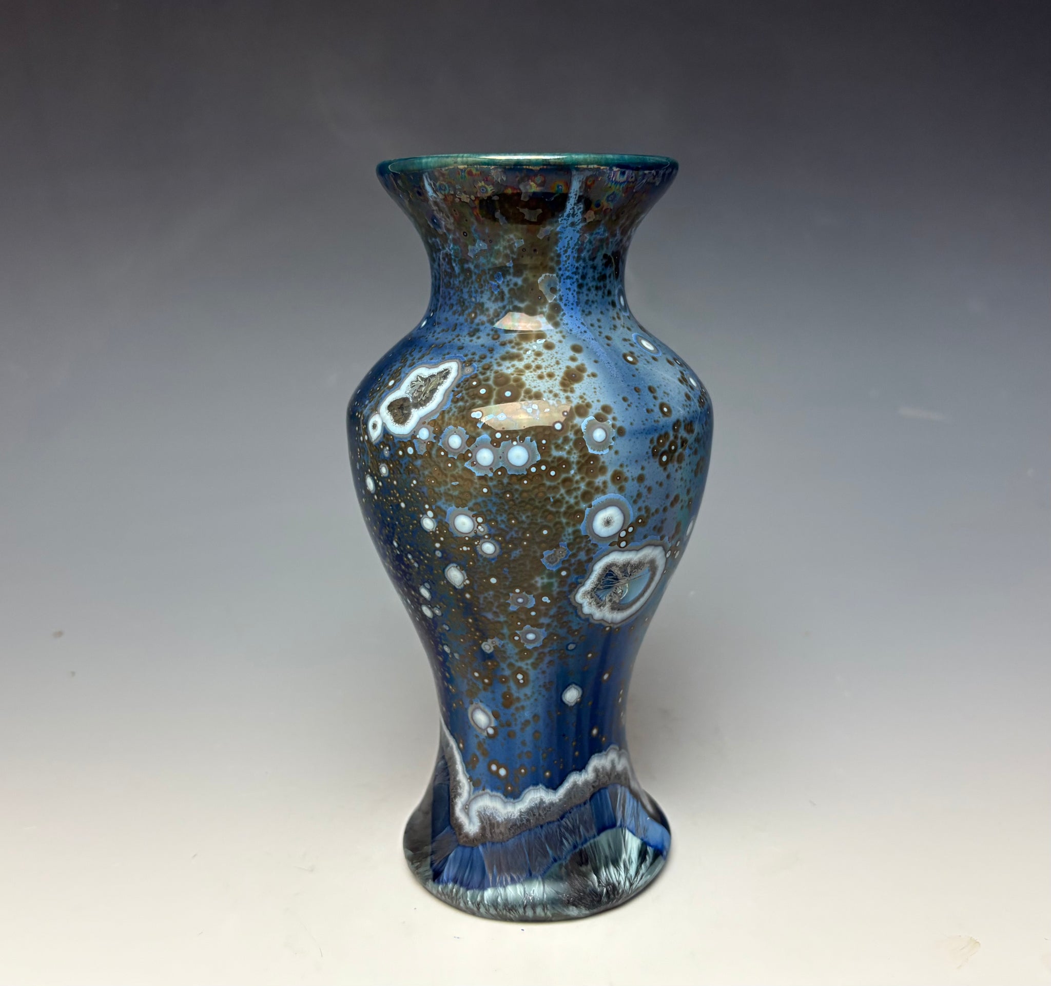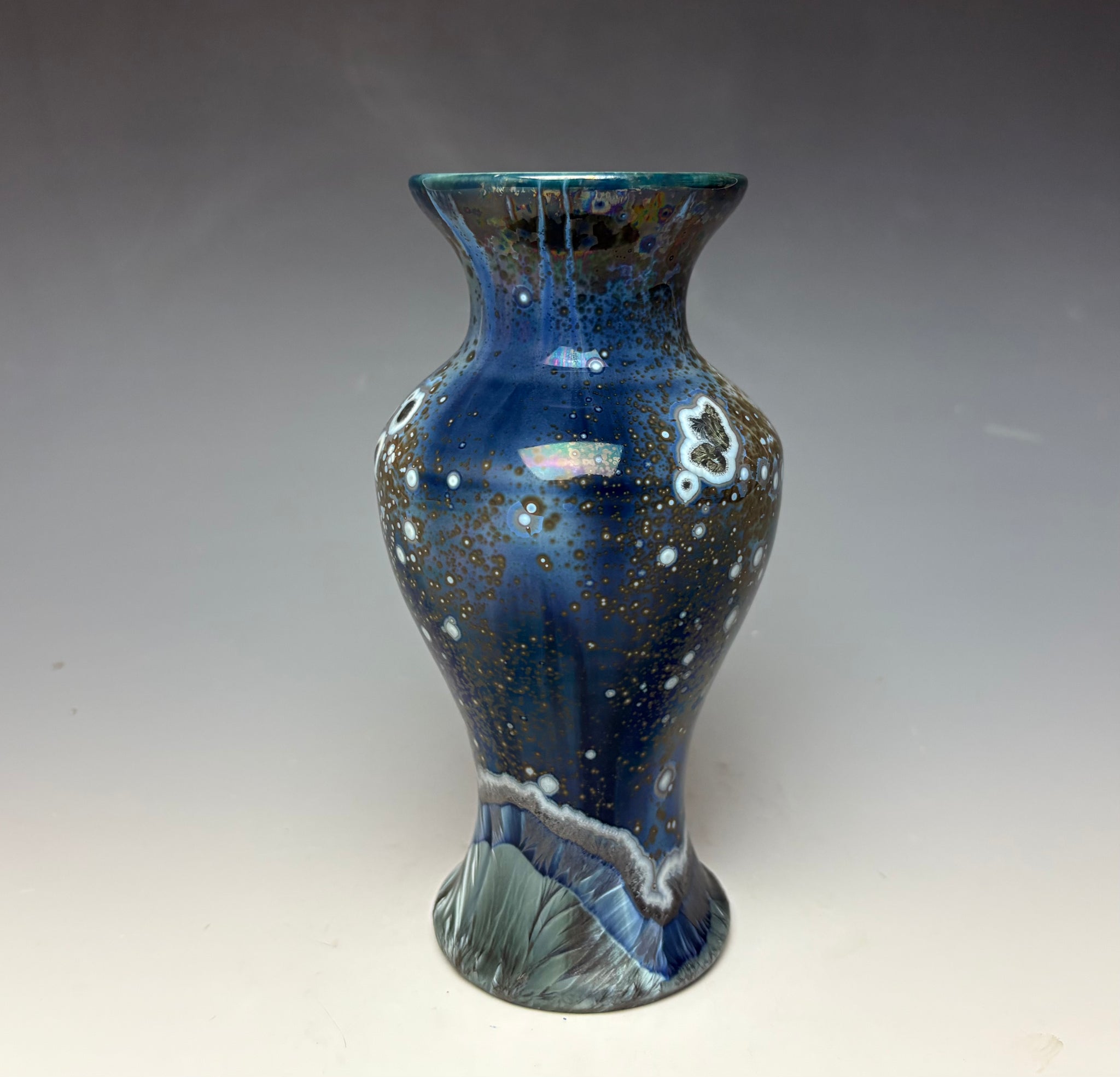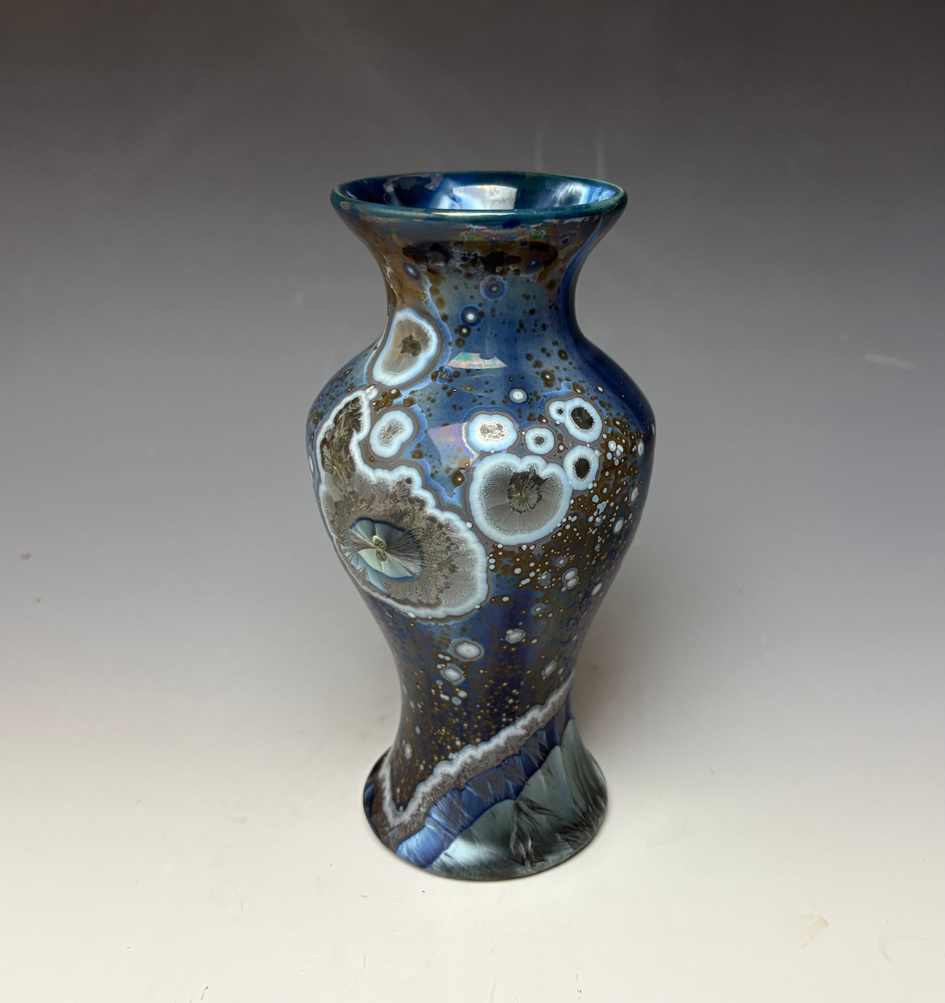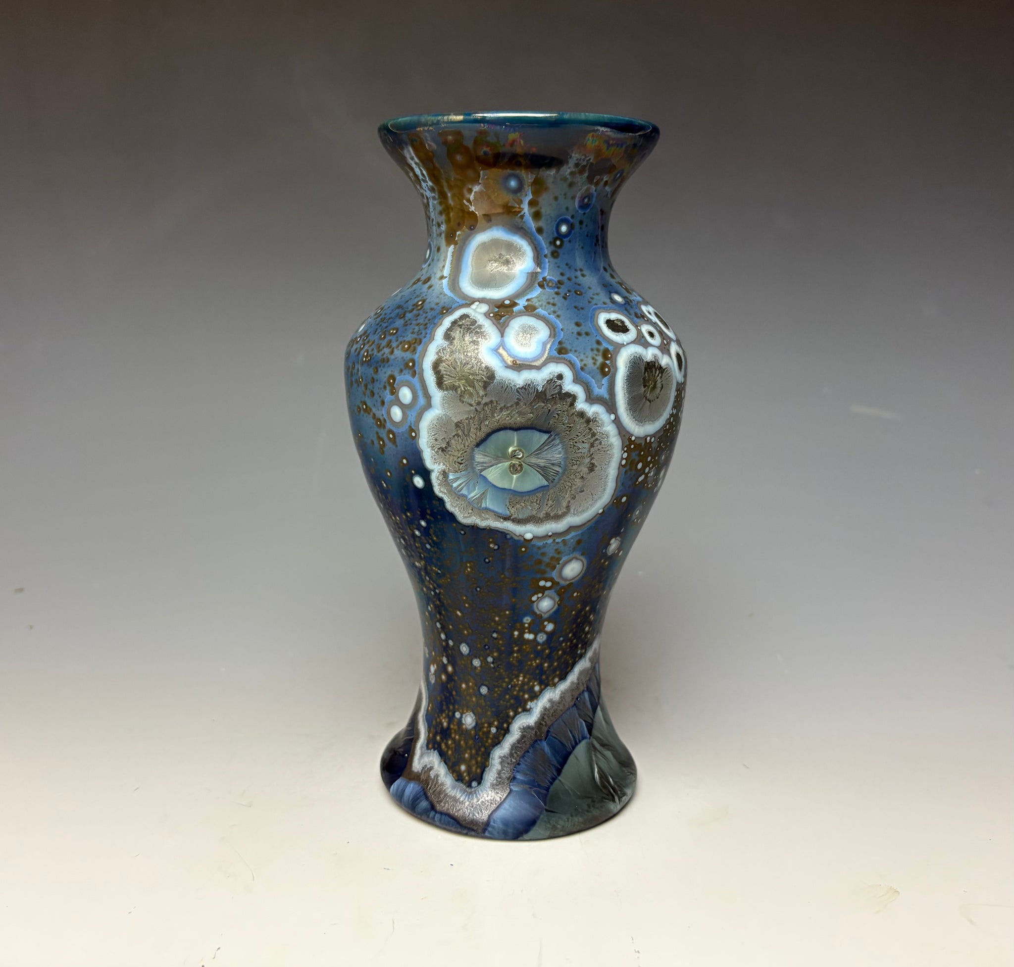 This vase was hand-made from porcelain clay on the potter's wheel by Lindsey. It is glazed with a unique glaze of copper & cobalt. The surface is multidimensional, with silvery blue crystals that have blue, grey and silver halos. There are other speckles with grey and pewter colored. The small crystals seem to pop off the surface of this unique vase as streaks of blue and white highlight different sections of the vase.