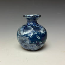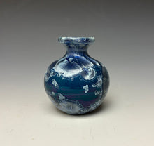 This 'Atlantic Storm Blue' is a deep ocean blue/teal/white background with blue/silver crystals. There is also some lovely iridescence on the glaze that glows in the light. Truly one of a kind! The vase would work well to hold a mini bunch of flowers or on its own.