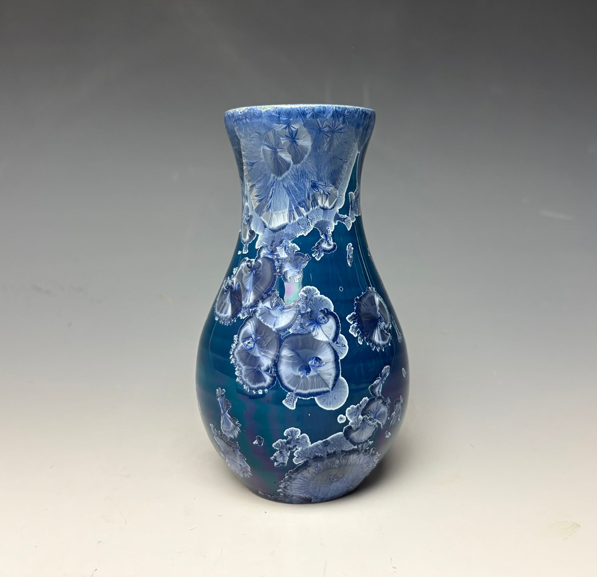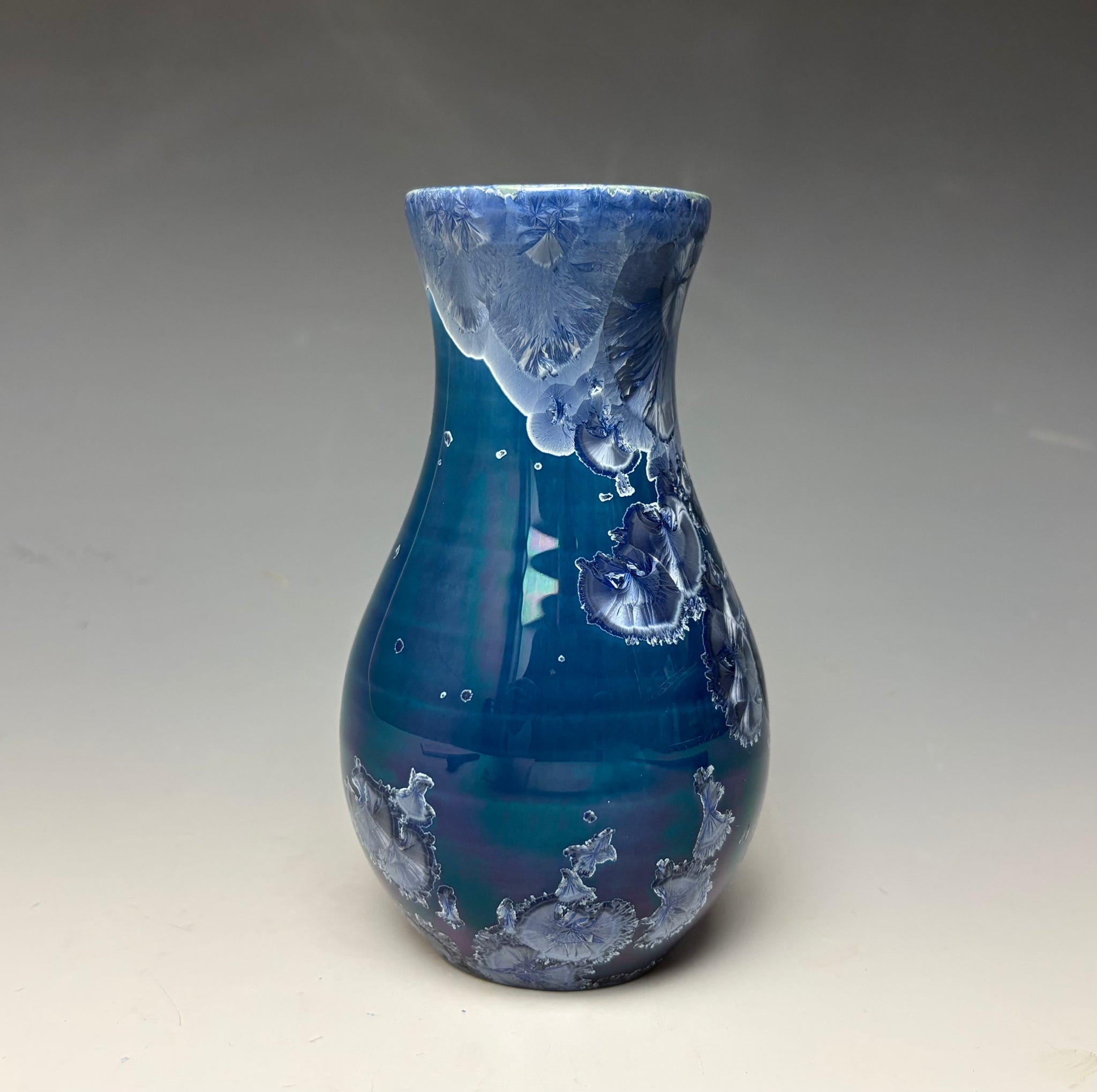 This vase was hand-made from porcelain clay on the potter's wheel. Due to the unique nature of crystalline glazes, no two pieces are ever alike. The zinc crystals are actually grown during the firing and cooling process. The time and temperature must be accurate in order to achieve crystal growth on the piece.