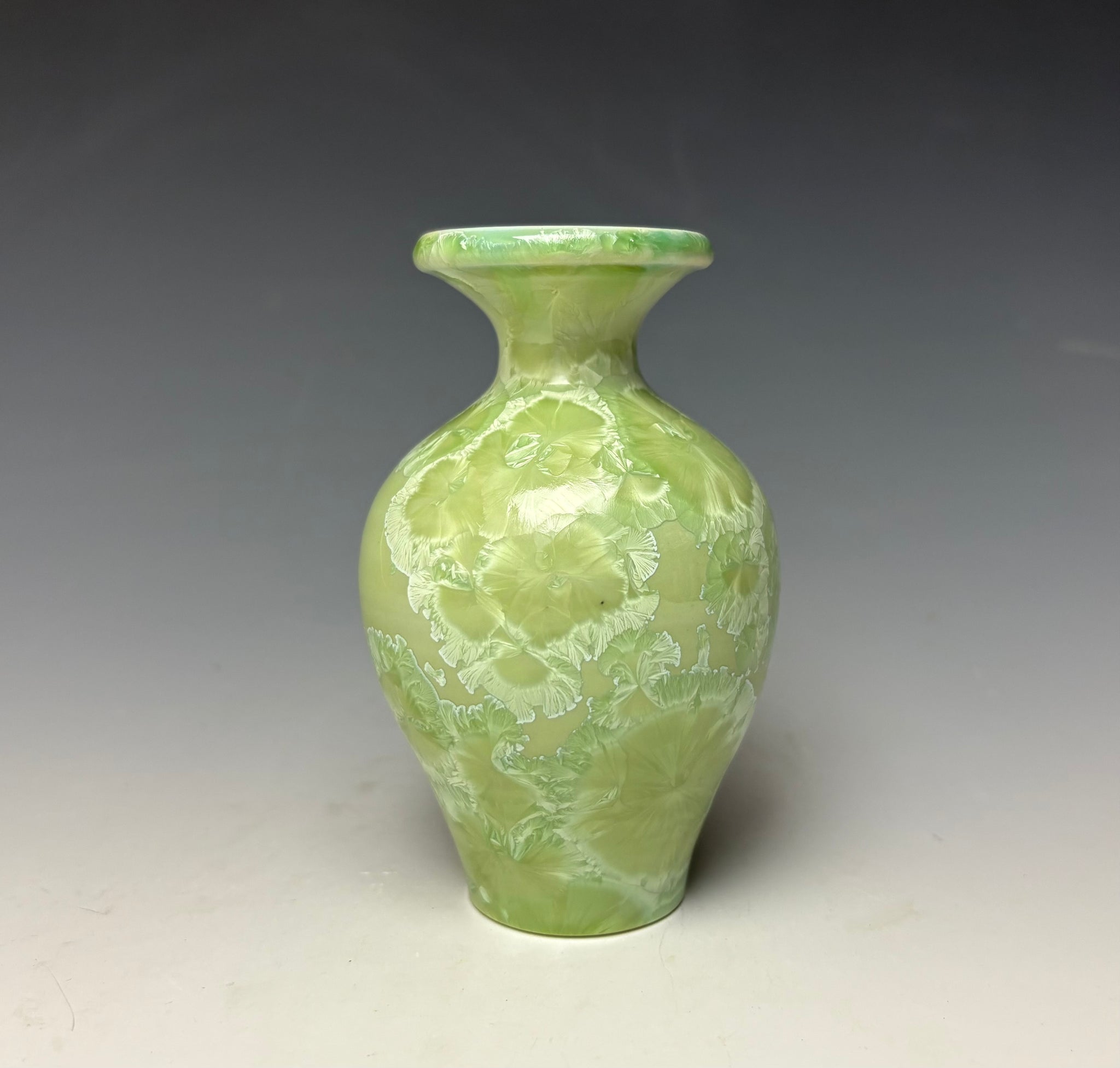 Due to the unique nature of crystalline glazes, no two pieces are ever alike. The crystals are actually grown during the firing and cooling process. The time and temperature must be accurate in order to achieve crystal growth on the piece. Copper is used in the glaze in order to achieve the deep green color.