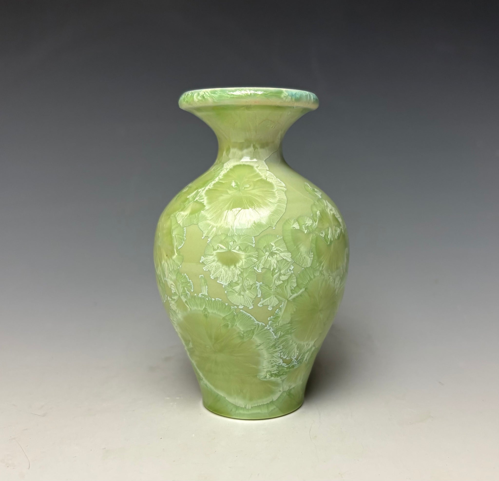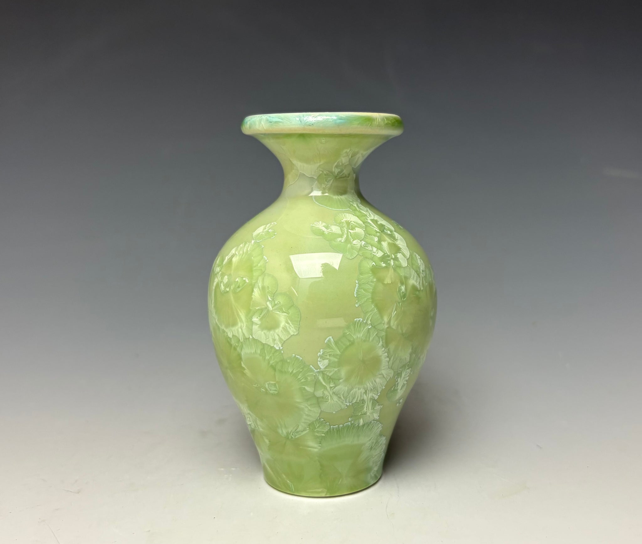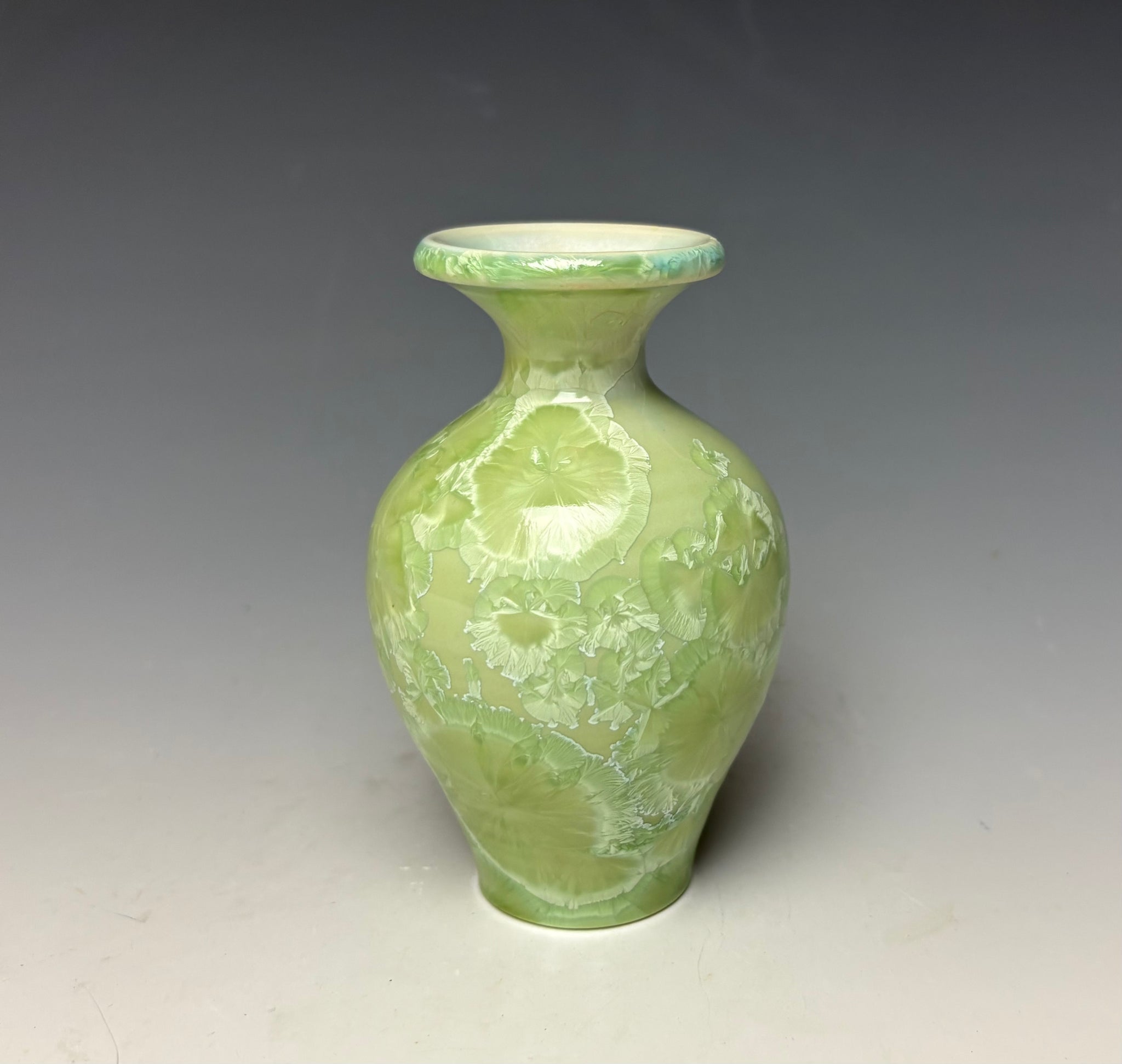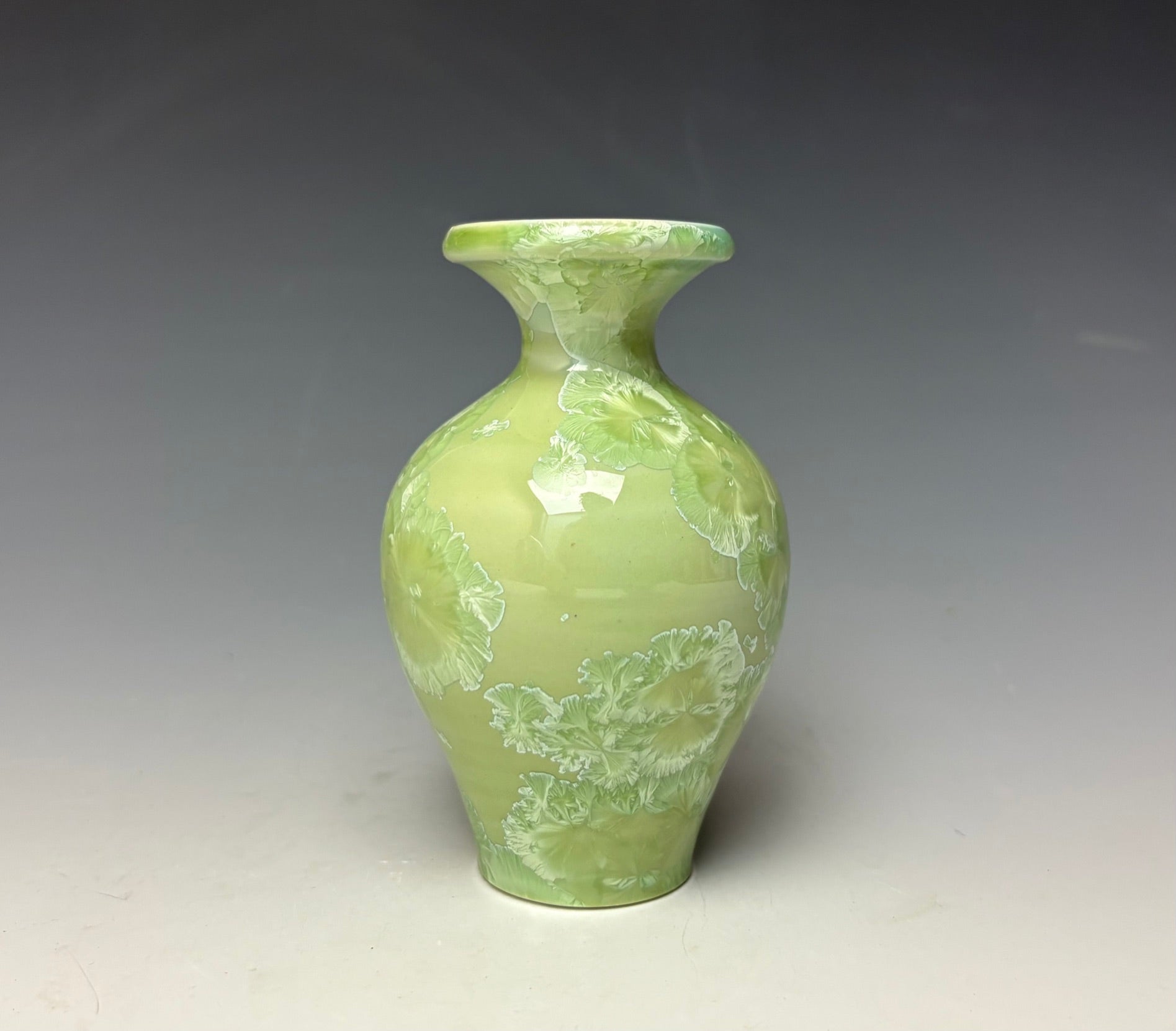 This vase was hand-made from porcelain clay on the potter's wheel by Lindsey. It is glazed with light green crystals on a light minty green background.