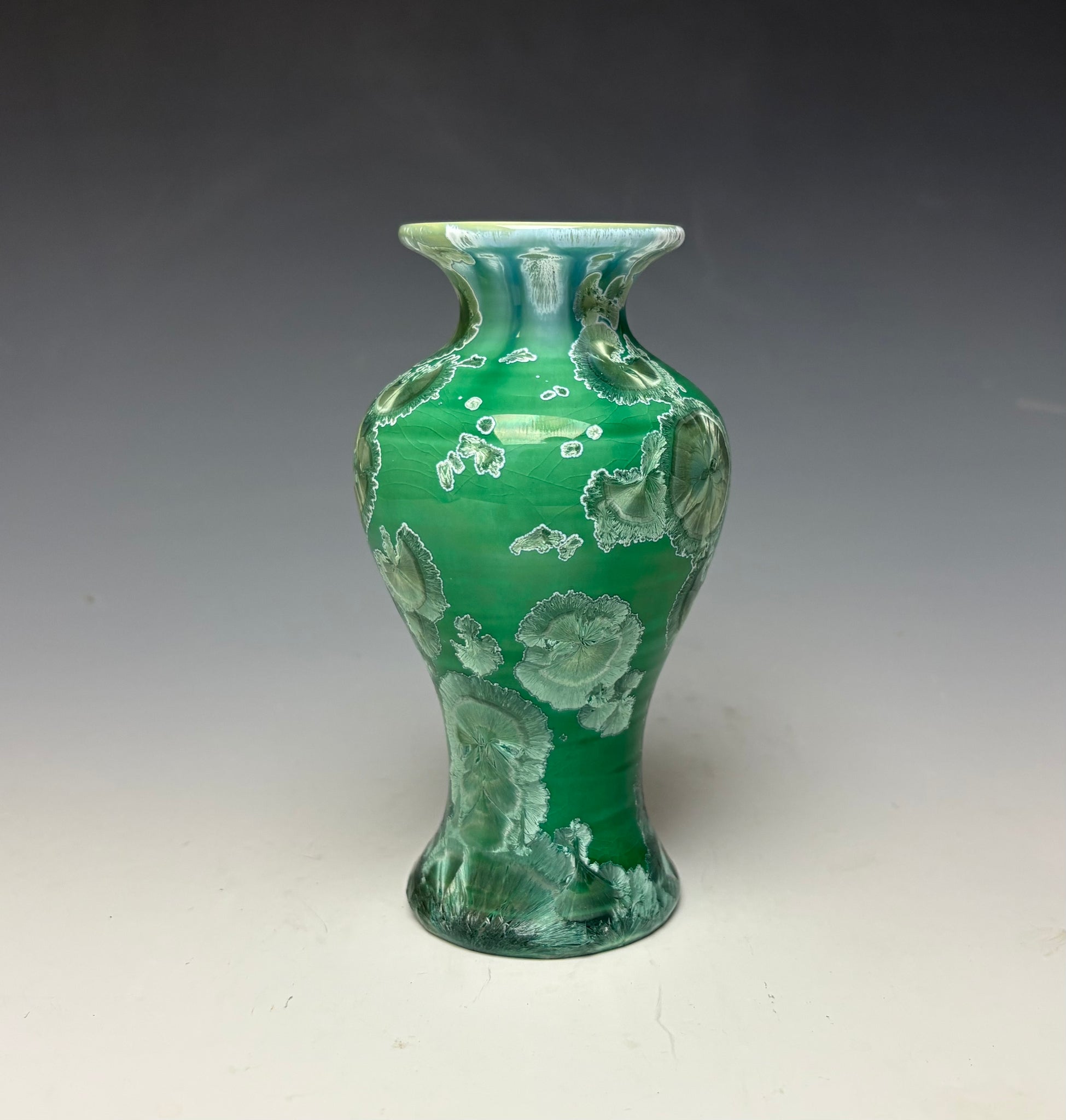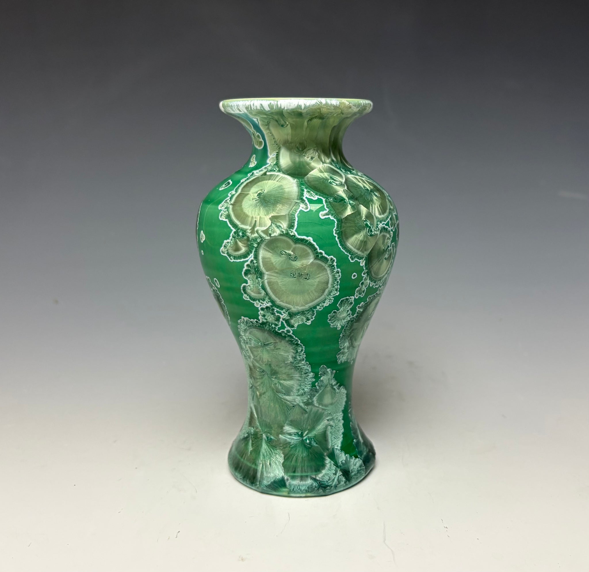 This piece was handmade on the potter's wheel by Lindsey from porcelain clay. It is glazed with an emerald green crystalline glaze with silvery crystals wrapping around the vase with a green background that gives a multitude of depth and dimension to this piece.