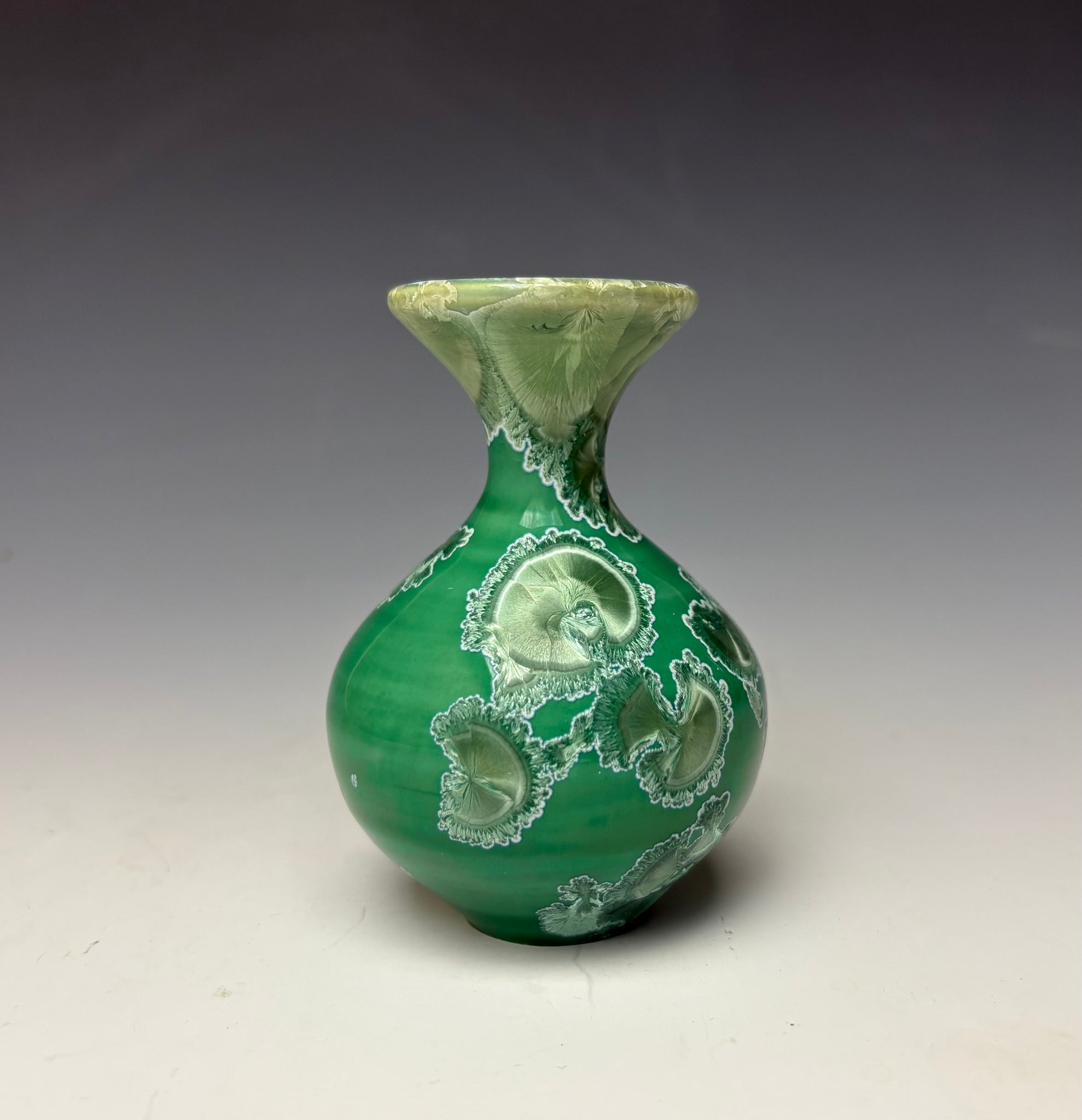 Due to the unique nature of crystalline glazes, no two pieces are ever alike. The crystals are actually grown during the firing and cooling process. The time and temperature must be accurate in order to achieve crystal growth on the piece. Copper is used in the glaze in order to achieve the deep green color.