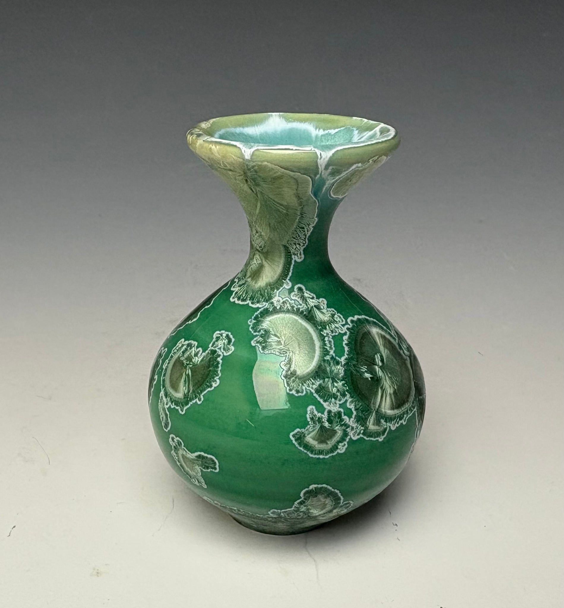 This vase was hand-made from porcelain clay on the potter's wheel by Lindsey. It is glazed with an emerald green zinc crystalline glaze on a satiny light green and white background that fades from light to dark, top to bottom. The crystals seem to pop off the surface of this unique vase as streaks of teal blue highlight different sections of the vase.