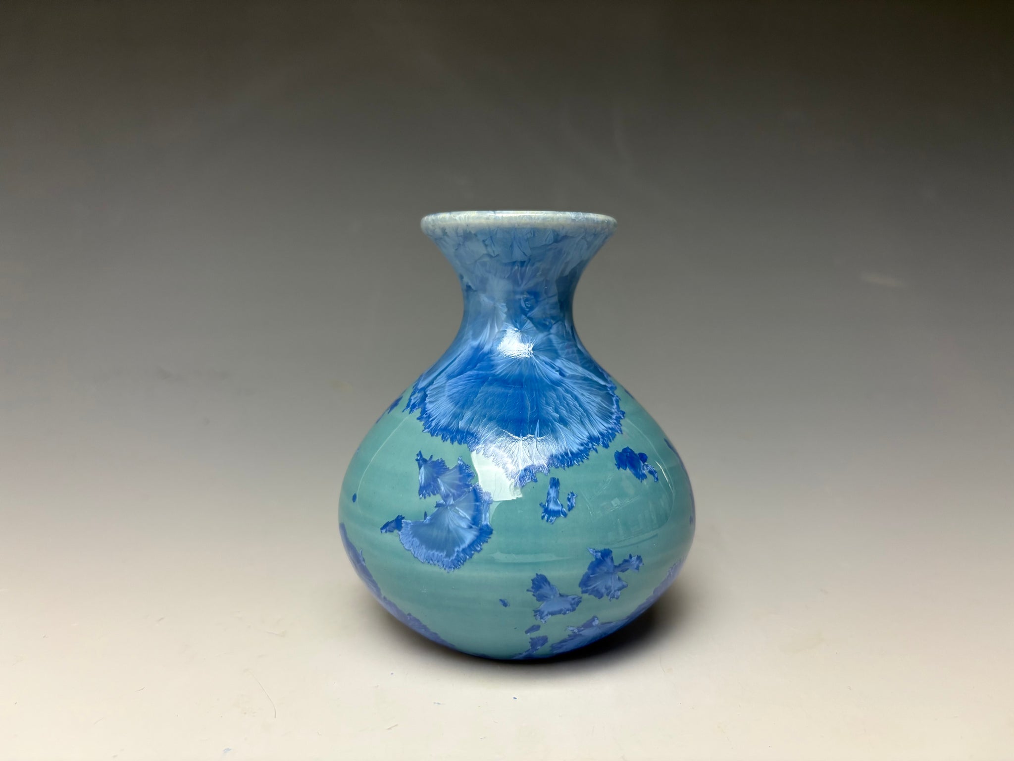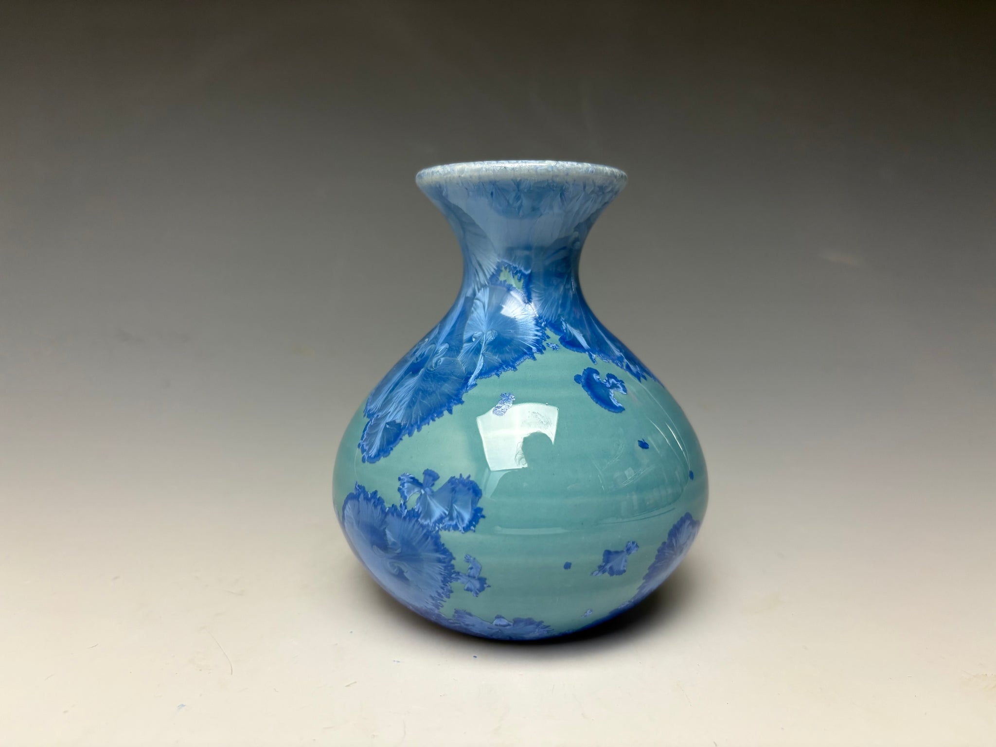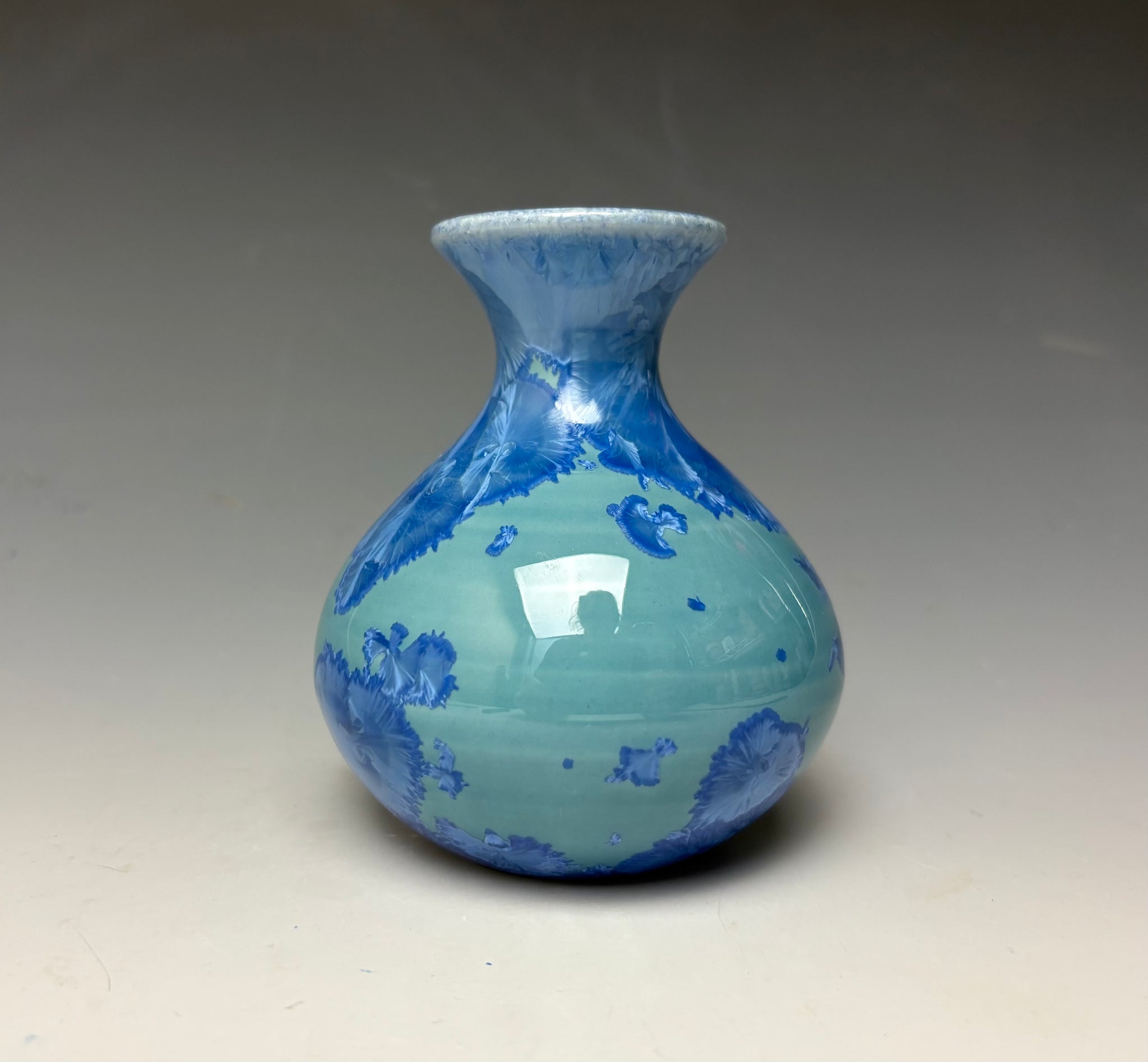 This piece was handmade on the potter's wheel by Lindsey from porcelain clay. It is glazed with a light blue crystalline glaze with crystals wrapping around the vase that gives a multitude of depth and dimension to this piece. It has light blue crystals on light blue/teal background with a blue and white interior.