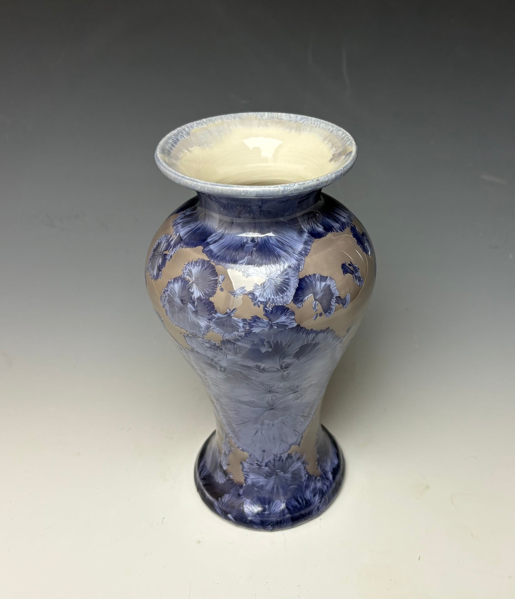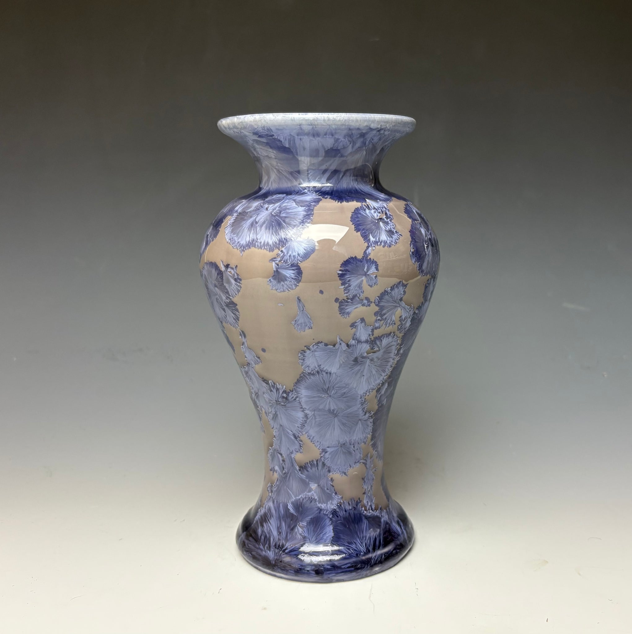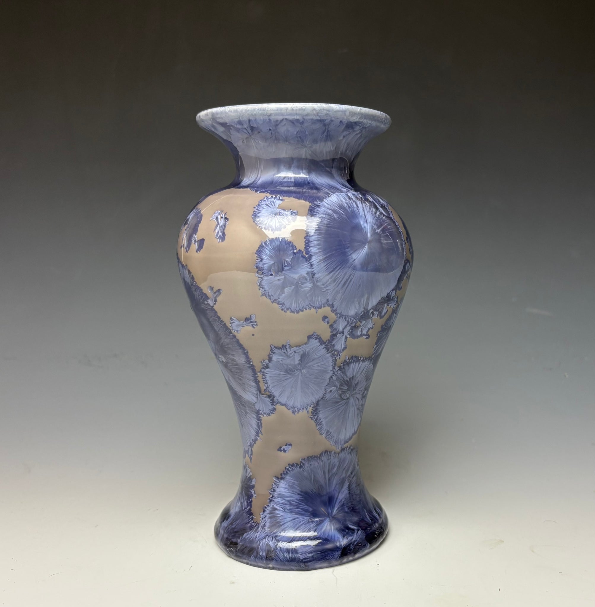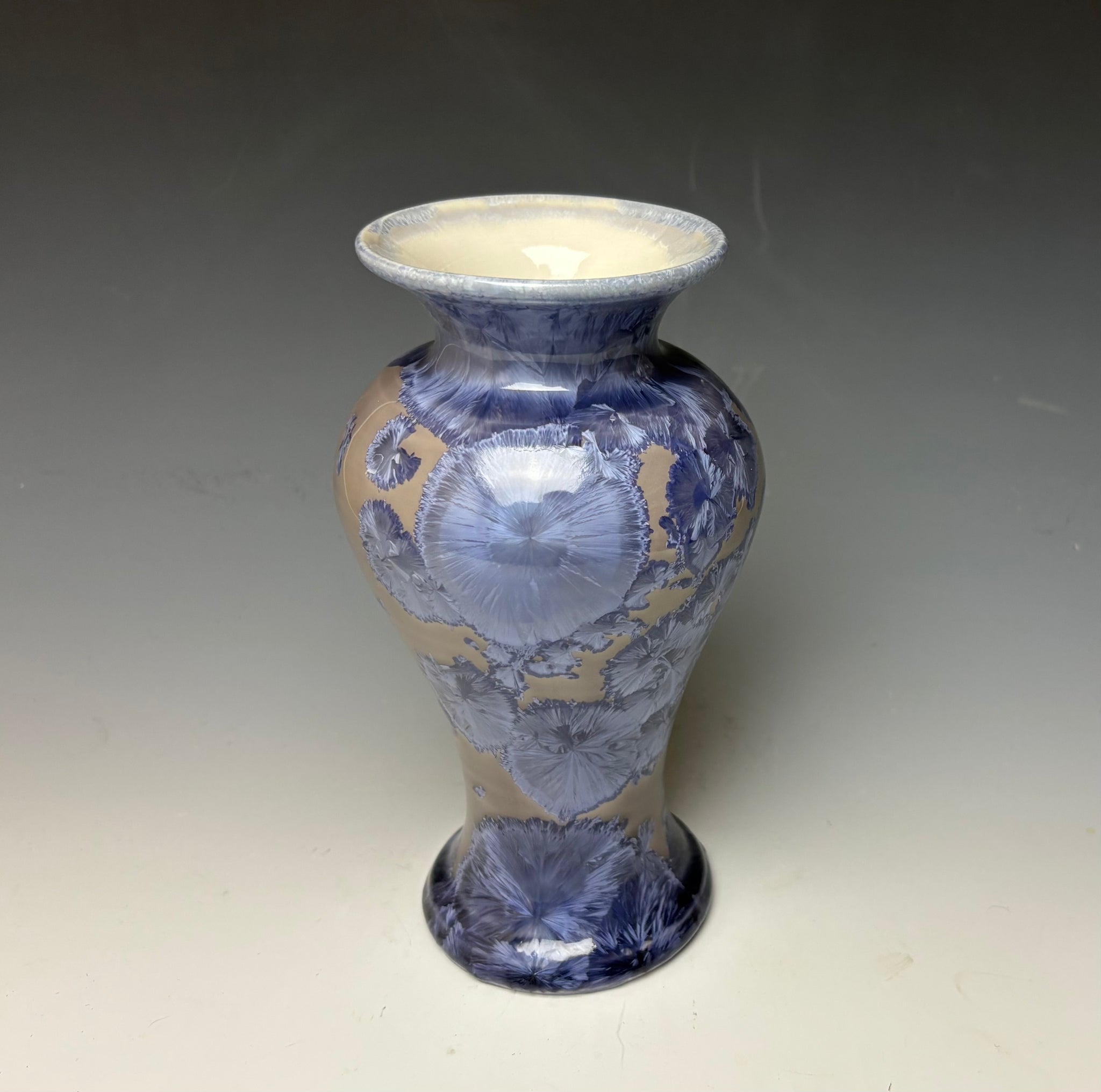 This vase was hand-made from porcelain clay on the potter's wheel. Due to the unique nature of crystalline glazes, no two pieces are ever alike. The zinc crystals are actually grown during the firing and cooling process. The time and temperature must be accurate in order to achieve crystal growth on the piece.