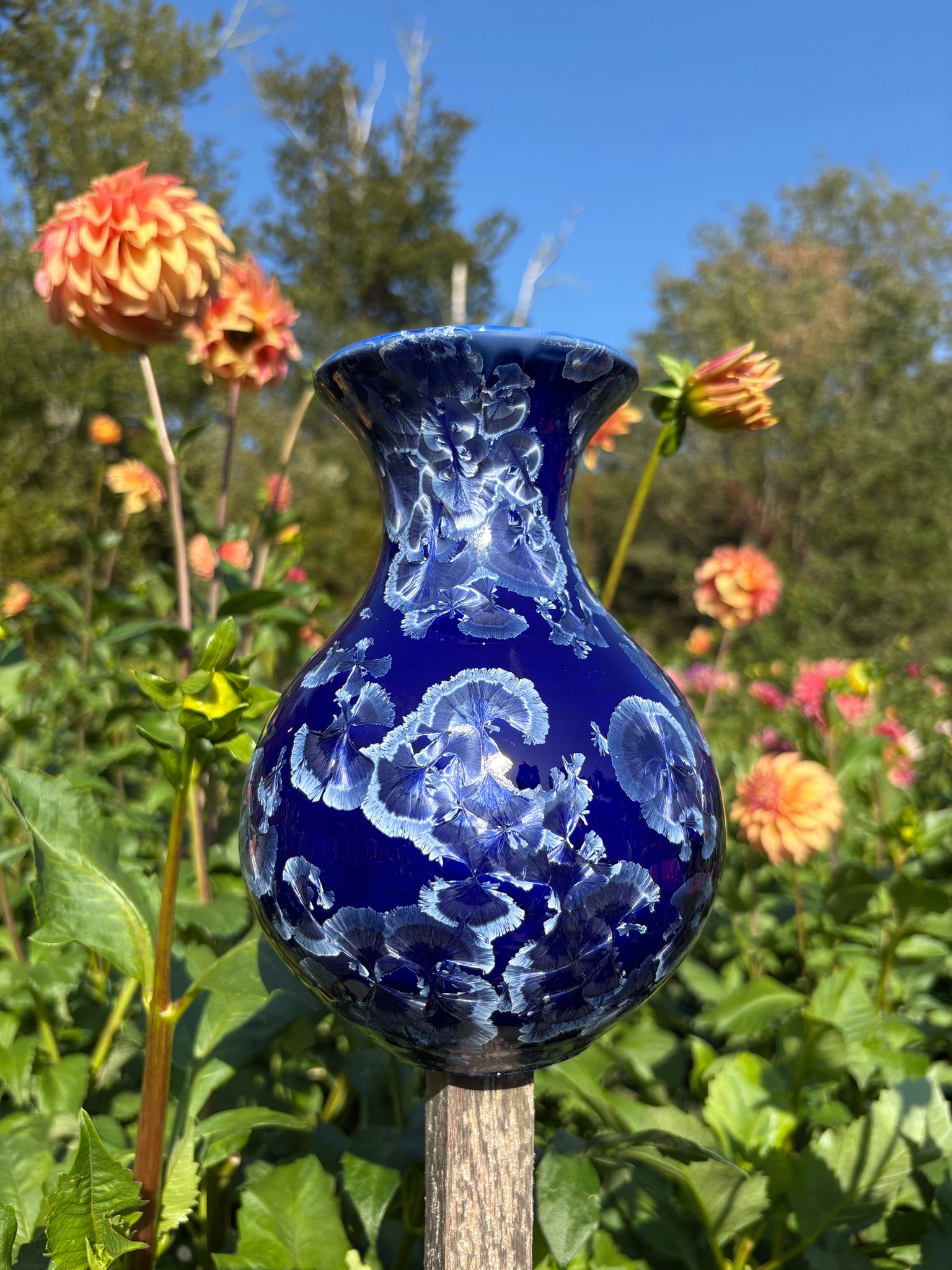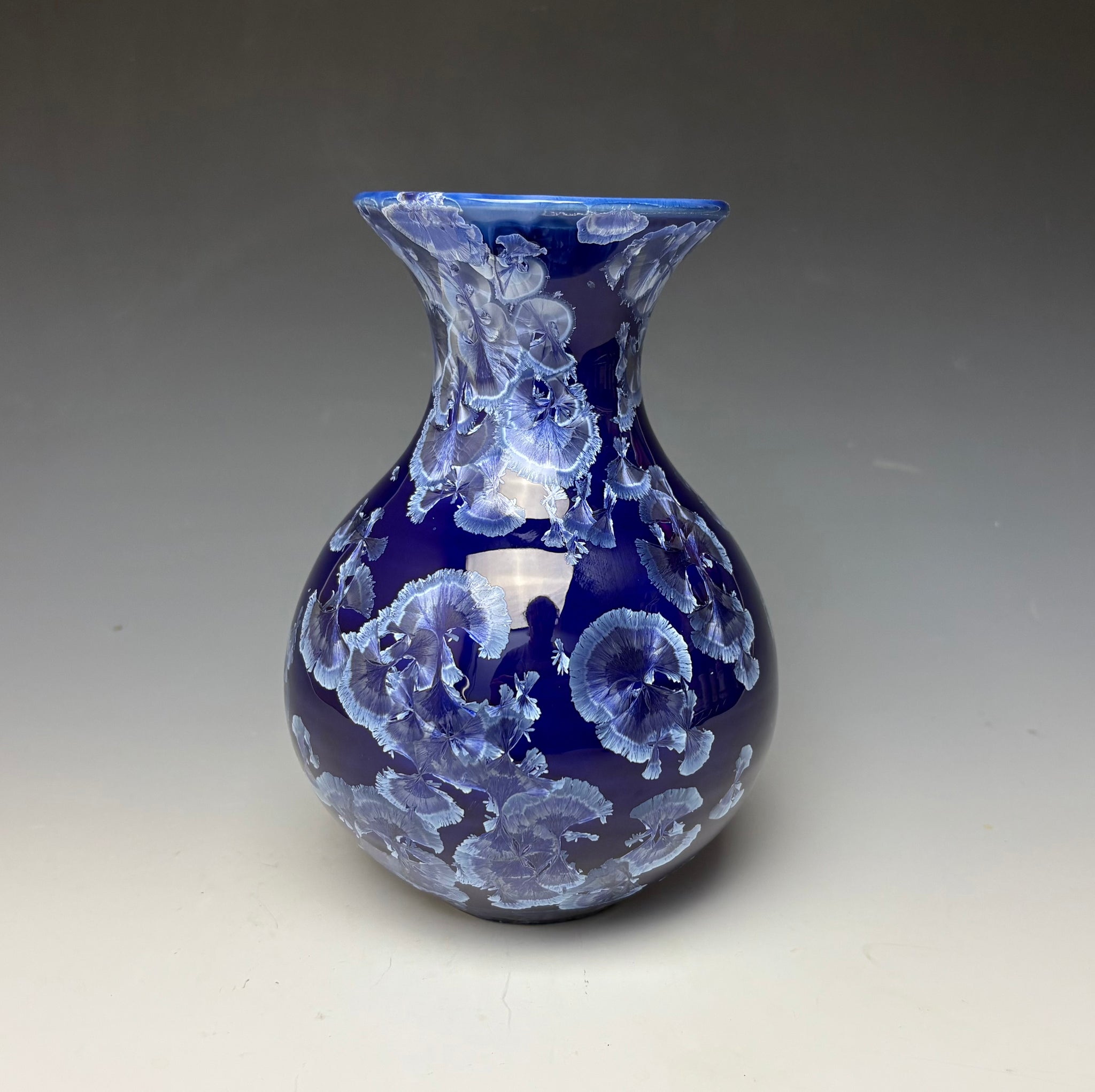 The piece has lovely royal blue/silver zinc crystals on a royal blue and white background. These crystals actually GROW during the firing and cooling process! No two pieces are ever alike. The bright blue crystals have a silver shimmer and dance about the dark blue background.