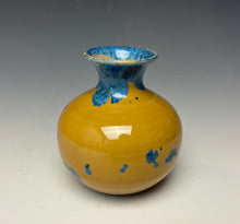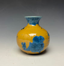 The glaze on this vase has royal blue crystals which jump off the pale orange background. The depth and dimension in the glaze are quite stunning- the crystals seem to move and dance about the surface of the vase as the light hits it. You can sit for hours looking at the vase, finding new patterns and designs that the crystals have created during their growing process.